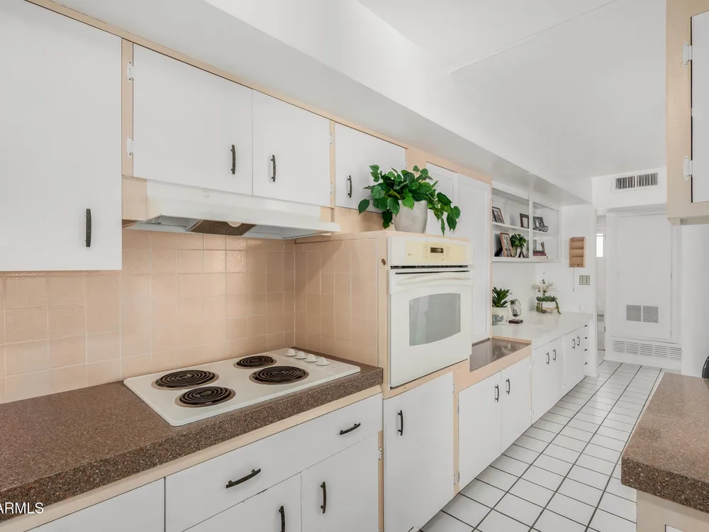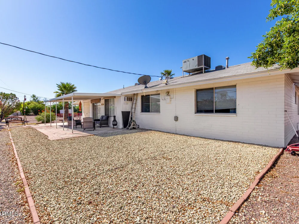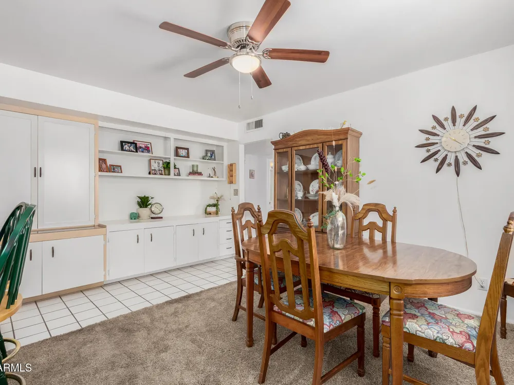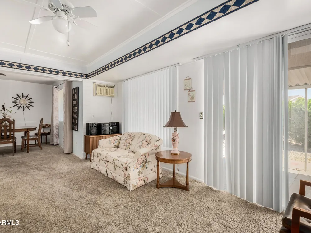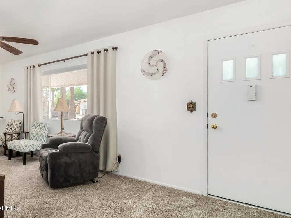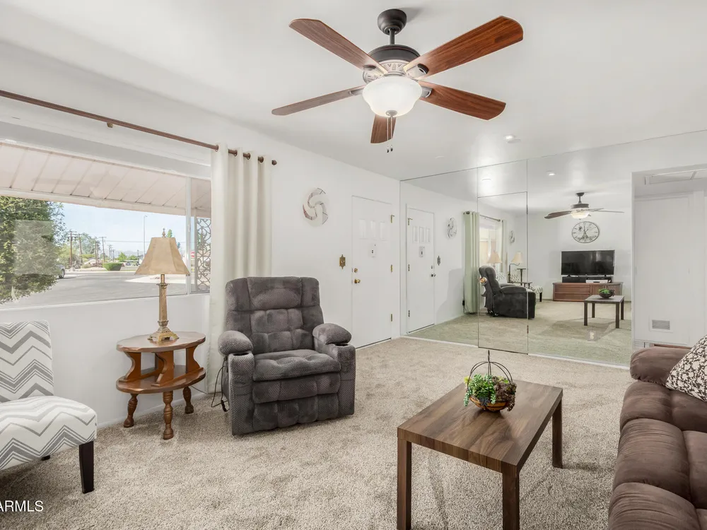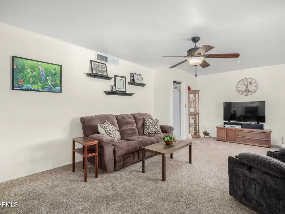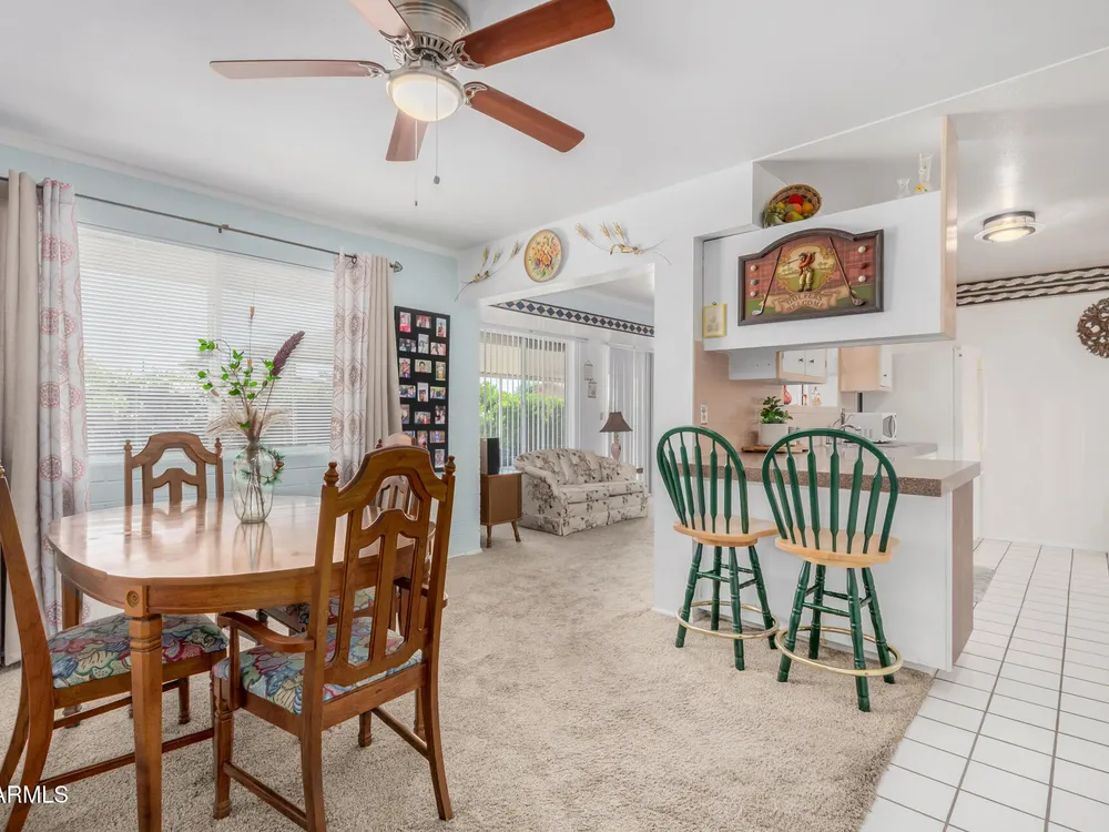 Welcome to this lovely 2-bedroom, 2-bath detached home with a 1-car garage, ideally situated on a peaceful cul-de-sac in Sun City. The property features a yard with mature trees and house with thoughtful design. Inside, the spacious living room creates a bright and open feel. The Arizona room is fitted with dual-pane windows, providing comfort and energy efficiency year-round. Bonus! Covered parking for your golf cart. The kitchen is designed with convenience in mind—featuring pull-out shelving in both the sink and stove cabinets for easy storage. Additional highlights include seven ceiling fans, and two generously sized bedrooms.