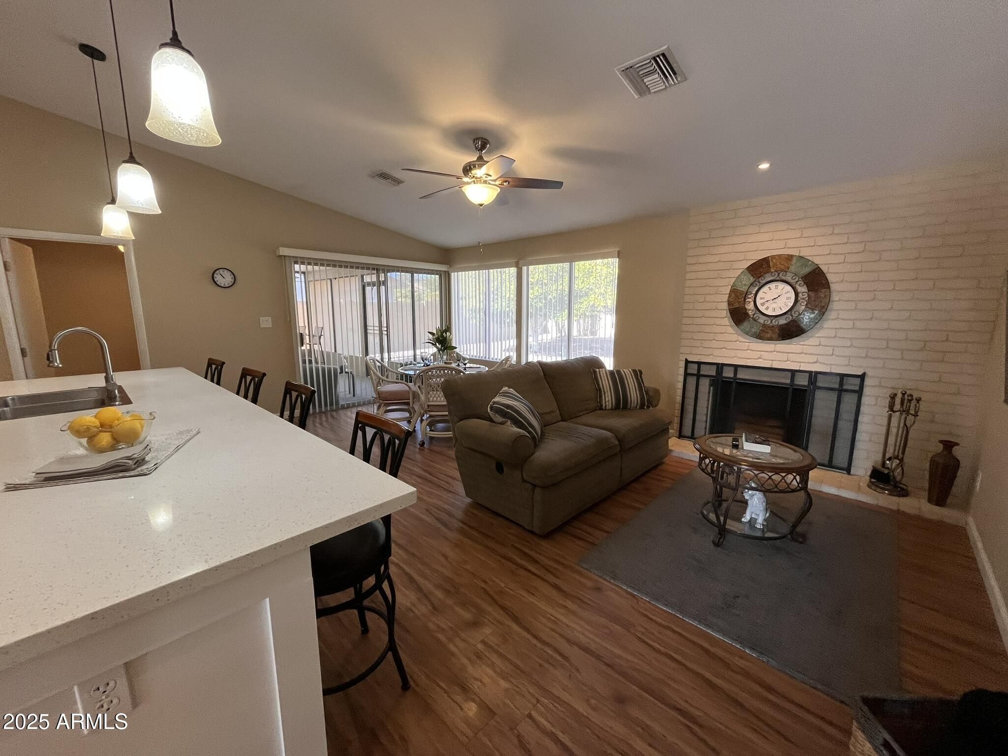Well kept, clean and bright home on large corner lot in Ahwatukee 55+ community. Inside you will find an inviting living room followed by the huge open plan kitchen/family room that's the star of the show. Showcasing high vaulted ceilings (unusual in this area of homes), a substantial white quartz island, custom wood multi-level cabinets with pull out shelves and built in features, complete with a cozy fireplace for the holidays. Loads of light with windows overlooking fruit bearing citrus trees. The screened Arizona room is a big hit to enjoy the outdoors while protected from the elements. You will spend countless hours here. Many updates include newer roof and paint inside and out, wood laminate flooring and updated tiled showers... Inside laundry room plus a small hobby/storage room off garage with AC! Pride of ownership. Home warranty included!