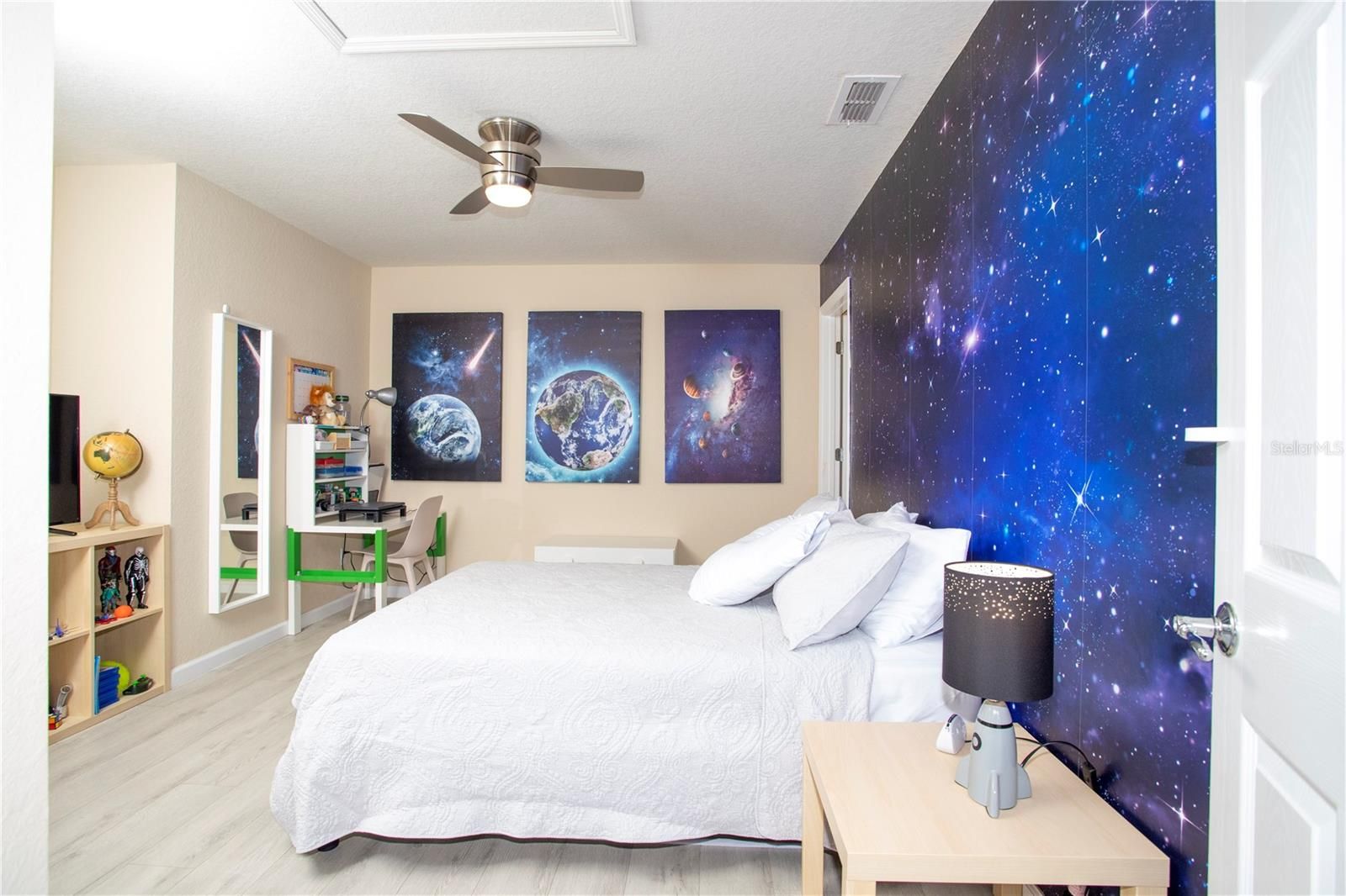 - Ceiling Fan(s), Eat-in Kitchen, High Ceilings, Open Floorplan, Upper Level Primary, Thermostat