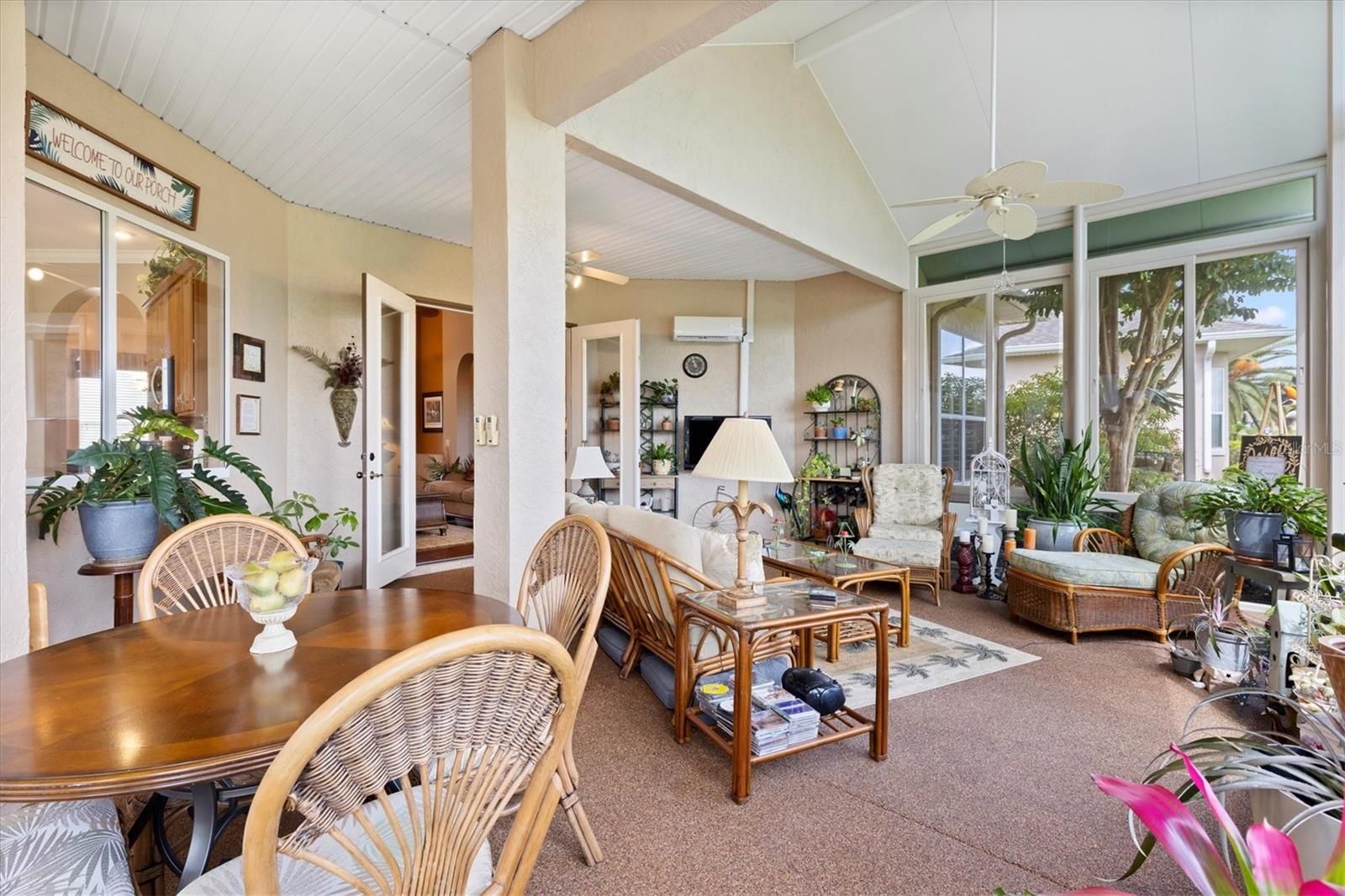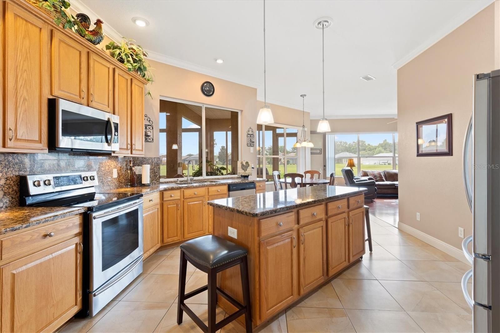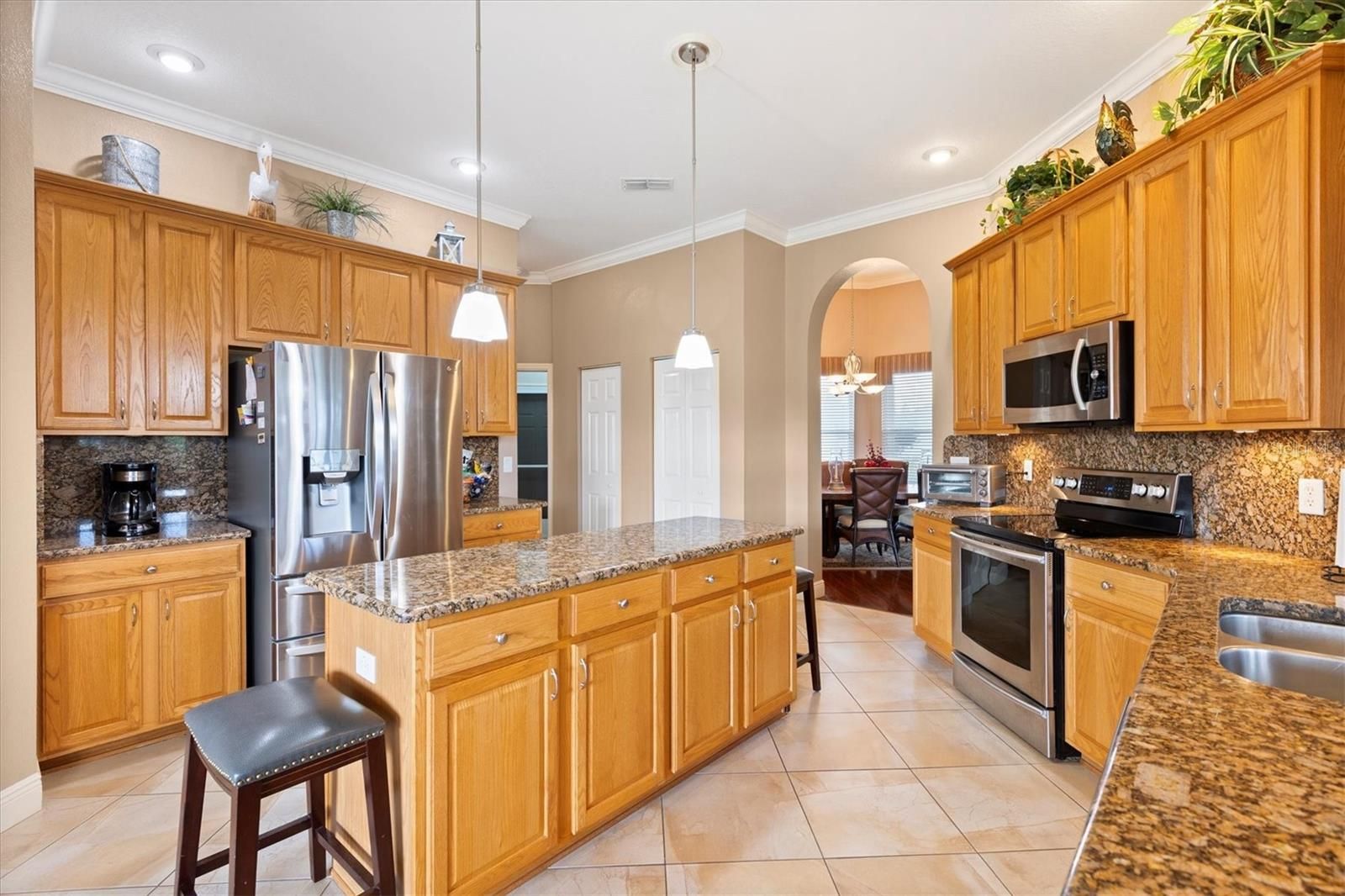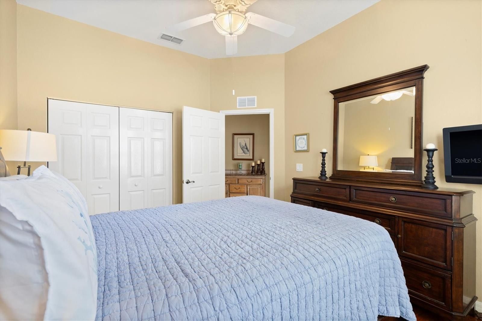 STONECREST 55+GATED GOLF COURSE COMMUNITY WITH ALL THE AMMENITIES AND 4 POOLS. THIS STUNNING CUSTOMIZED SAN MARCO MODEL IS LOCATED ON THE 3RD HOLE OF THE CHAMPIONSHIP GOLF COURSE! AS YOU ENTER THE FRONT DOOR YOU HAVE A GREAT VIEW TO THE GOLF COURSE & ARE GREETED WITH THE FORMAL DINING AREA, FORMAL SITTING AREA AND 12’ CEILINGS WITH CROWN MOLDING. THE REST OF THE HOME GRADUATES TO 10 FT CEILINGS. YOU CAN ENTER THE LANAI THROUGH THE FRENCH DOORS FROM THE FORMAL SITTING ROOM. THE FLORIDA ROOM IS ENCLOSED WITH GLASS WINDOWS & A MITSUBISHI MINI SPLIT PROVIDING AN ADDITIONAL 500 SQ FT OF LIVING SPACE UNDER HEAT & AIR. THE FLOOR IS A STUNNING RIVER ROCK. THERE IS ALSO AN ENTRY FROM THE FAMILY ROOM MAKING THIS HOME IDEAL FOR ENTERTAINING. THE SPACIOUS KITCHEN ALSO HAS AN EATING AREA, GRANITE COUNTERTOPS WITH ABOVE AND BELOW LIGHTING ON THE 42” CABINETS, KITCHEN ISLAND, STAINLESS-STEEL APPLIANCES AND DUAL PANTRY CLOSETS. THE FLOORING THROUGHOUT THE HOME HAS BEAUTIFUL HIGH GLOSS LAMINATE IN THE LIVING AREAS AND TILE IN ALL OF THE WET AREAS. IT IS PERFECT FOR THOSE SEARCHING FOR A 3 BEDROOM/ 3 BATHROOM HOME. THE MASTER SUITE HAS A SITTING AREA, TWO WALK IN CLOSETS & PLANTATION SHUTTERS. THE MASTER BATHROOM HAS A WALK IN SHOWER AND TWO VANITIES ALONG WITH A GREAT SIZED SOAKING TUB & SEPARATED TOILET CLOSET. ON THE OTHER SIDE OF THE KITCHEN THE 2ND BEDROOM IS SET UP PERFECTLY FOR A MOTHER-IN-LAW OR GUEST QUARTERS’ ARRANGEMENT AS IT HAS ITS OWN FULL BATH. THE THIRD BEDROOM IS BEYOND THE FAMILY ROOM WHERE YOU WILL FIND A MURPHY BED WITH A CRAFT DESK, A BUILT IN CLOSET WITH A FLOOR SAFE & ANOTHER FULL BATH. THE LAUNDRY ROOM IS LOCATED JUST INSIDE THE HOME FROM THE GARAGE WITH AMPLE CABINETS AND A COUNTER SPACE. THE TWO CAR GARAGE AND GOLF CRT GARAGE ARE SPACIOUS AND DEEP (28 X 23.5). THE GARAGE HAS A WHOLE HOUSE WATER FILTRATION SYSTEM, SINK AND STORAGE RACKS AND PULL- DOWN STAIRS FOR EASY ACCESS TO THE ATTIC. CALL TODAY TO SCHEDULE AN APPOINTMENT FOR YOUR FOREVER HOME! ROOF 2023; HVAC 2024; MINI-SPLIT 2023