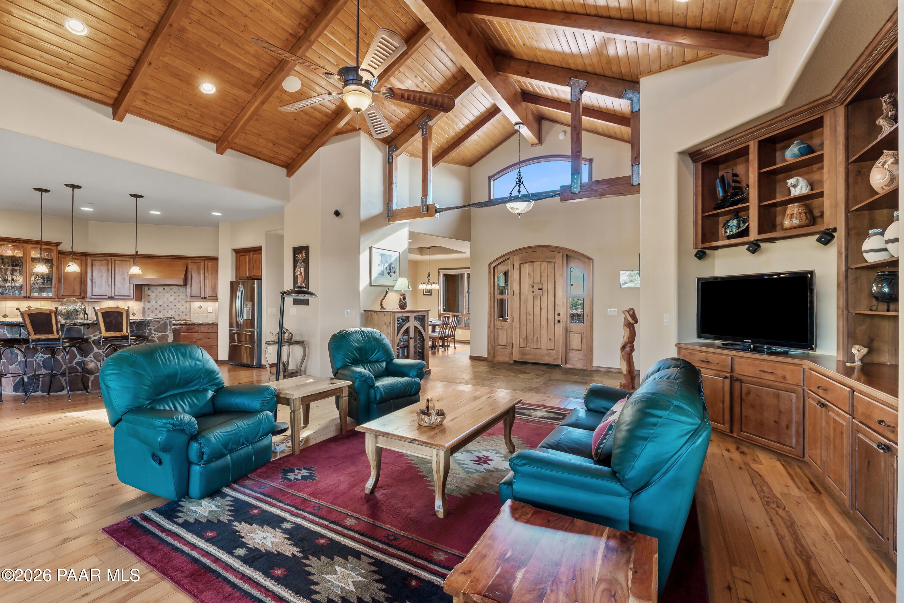 Experience the pinnacle of high-desert luxury in this masterfully designed custom ranch home. Perfectly situated on a 0.70-acre lot, this 3,877 sq. ft. residence offers breathtaking views of Granite Mountain and sweeping valley vistas. The ''Live on One Level'' floor plan is defined by exceptional craftsmanship, featuring Australian Cypress floors, tongue-and-groove ceilings, knotty alder details, and custom beams. A gourmet chef's kitchen serves as the heart of the home, complete with GE Profile appliances, a granite island, and a wine fridge.Beyond the main living areas, discover a versatile bonus room above the garage--ideal for recreational room, an art studio, hobby room, or private office or overflow bedroom. The home is as efficient as it is beautiful, featuring owned solar for the water heater, newer HVAC units, a Control4 smart system, a whole-home water filter and pellet stove. Owners use very little propane. Step outside to the expansive covered deck to enjoy the serene western Arizona mountains. Located just a short 3 minute stroll from the clubhouse, amenities, you are seconds away from world-class golf, fine dining, and wellness amenities in this premier gated community.
