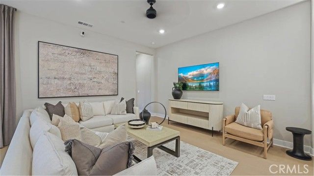 This three-story townhome is host to an open floorplan shared between the kitchen, living and dining rooms, with direct access to an outdoor room through sliding glass doors. A secondary bedroom at the back is ideal for overnight guests or a home office. A loft and three bedrooms occupy the second floor, while the top level has a spacious bonus room and outdoor terrace.