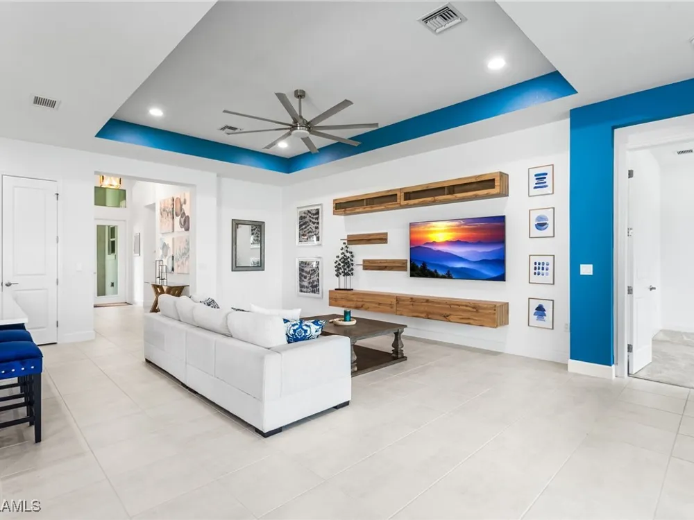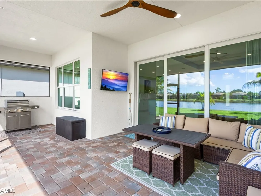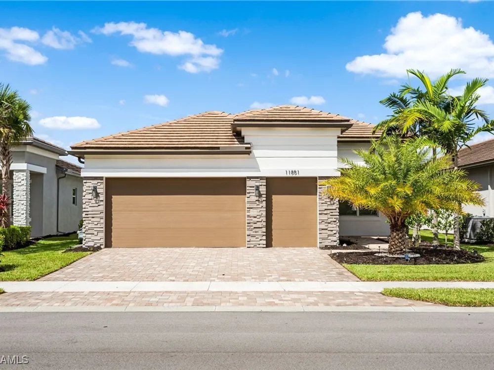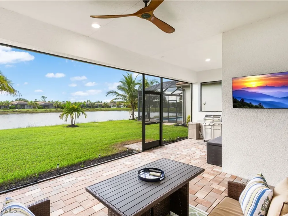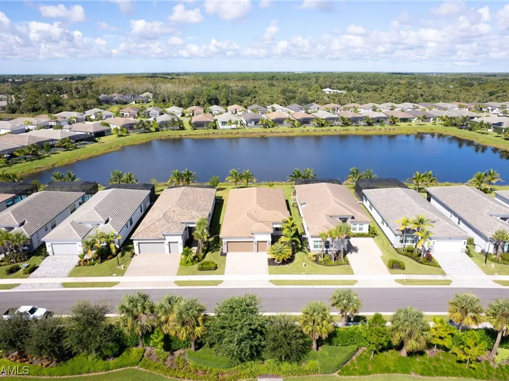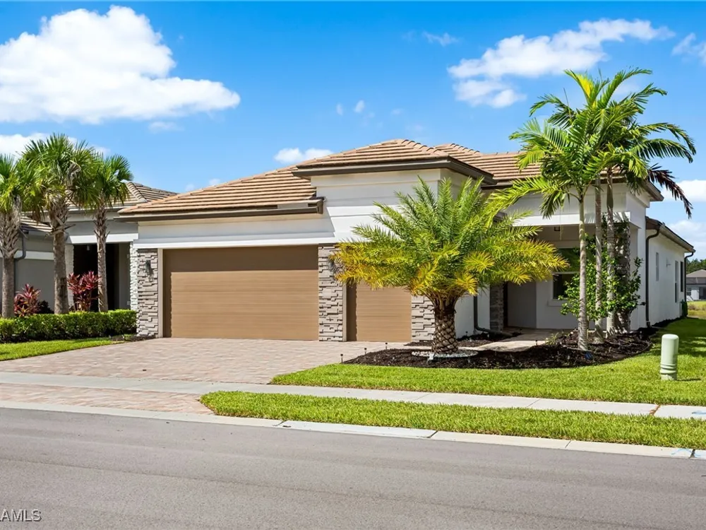 Nestled in the vibrant 55+ gated luxury enclave of Valencia Trails in Naples, this like-new GL Homes Nautilus (2022) presents resort-style living with every modern comforts. Step through dual glass entry doors into a bright, open floor plan, accompanied by custom window treatments, recessed (hi-hat) lighting, and designer fans that keep the ambiance just right. The heart of the home, the chef’s kitchen, is equipped with stainless appliances, a wall oven, a natural-gas cooktop with vented hood, upgraded cabinetry, quartz surfaces, and a striking custom backsplash that extends to the island. A rare 2½-car garage includes a dedicated bay with epoxy flooring and a climate-controlled mini-split for added comfort. Retreat to the expansive primary suite, boasting tray ceilings, two generous closets, dual vanities plus a built-in makeup station, a walk-in shower with bench and dual showerheads, a private water closet, and a spacious linen closet — luxury and practicality combined. The oversized lanai is yours for outdoor entertaining, pre-wired for TV and pre-plumbed for natural gas, ideal for grilling or a future summer kitchen, all while enjoying stunning west-facing lake sunsets; there’s even ample room to add a pool. Impact glass protects every door and window for peace of mind and lock-and-leave ease. This home also unlocks access to an active, engaged lifestyle. The community’s 43,000 sq ft clubhouse offers 8 pickleball courts, 6 tennis courts, 5 bocce courts, two card rooms, a sports lounge with billiards and poker tables, a full art studio with kiln, and a teaching kitchen that hosts professional chef-led classes. Clubs abound — Mahjong, Mexican Train, bocce, pickleball, tennis, car and coin clubs — creating endless opportunities to connect, socialize and enjoy life. With Naples’ beaches, dining and shopping just minutes away, plus Collier County’s reputation for low property tax and safety, this is the epitome of Florida lock-and-leave living done right.