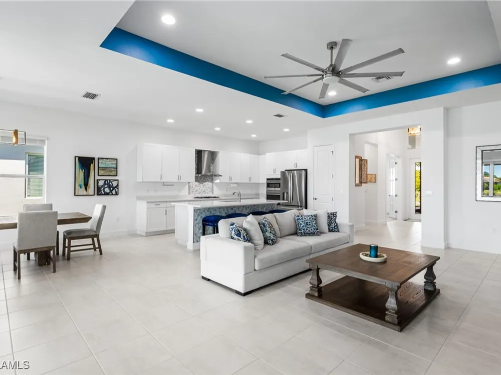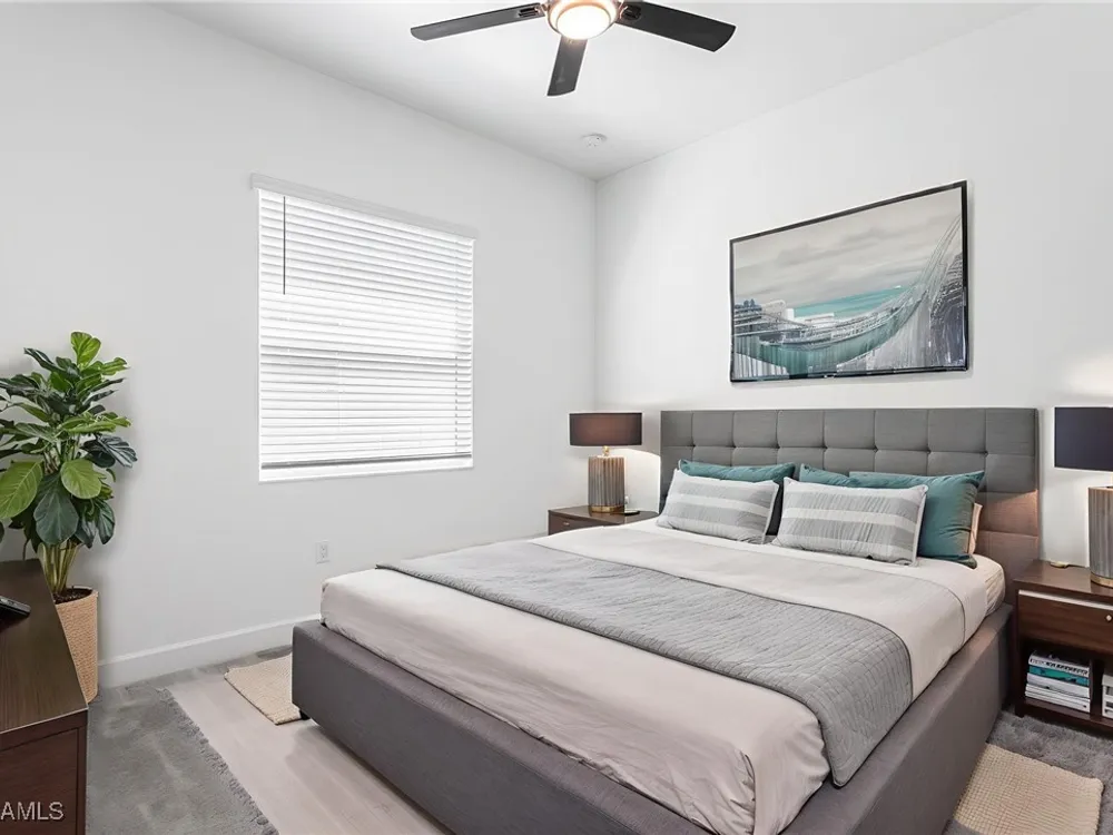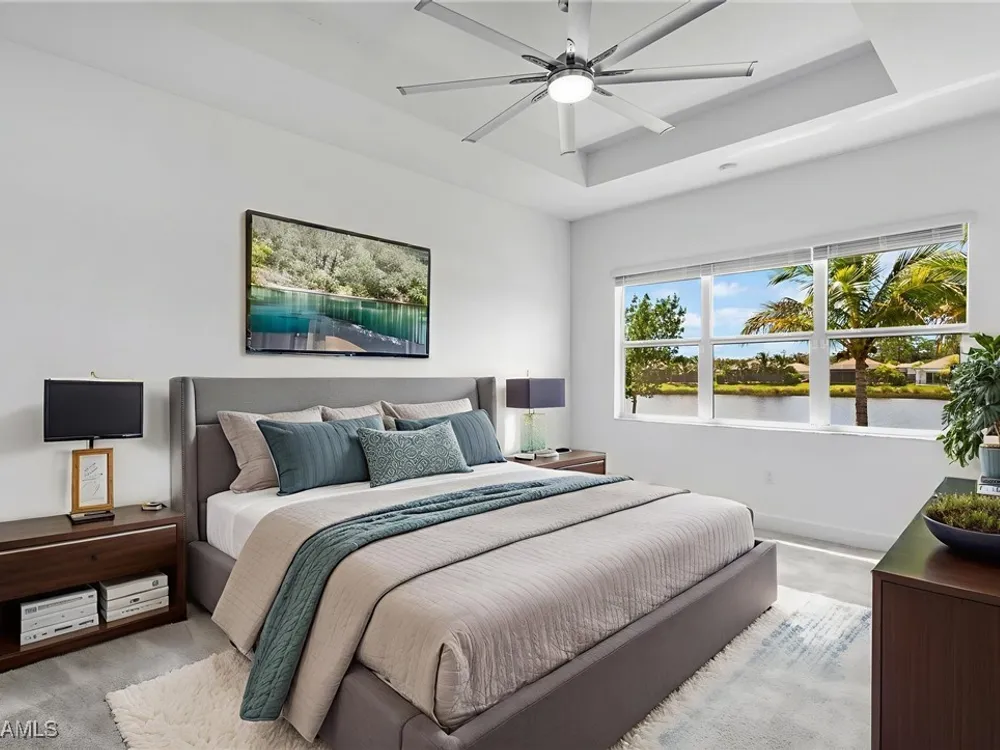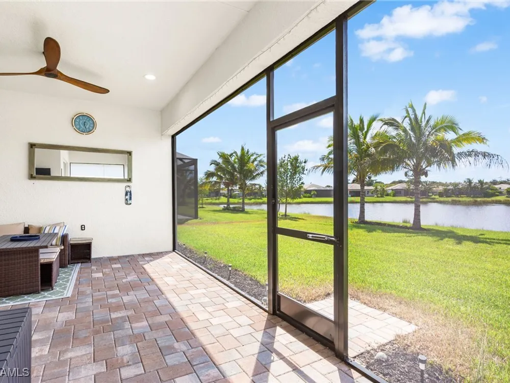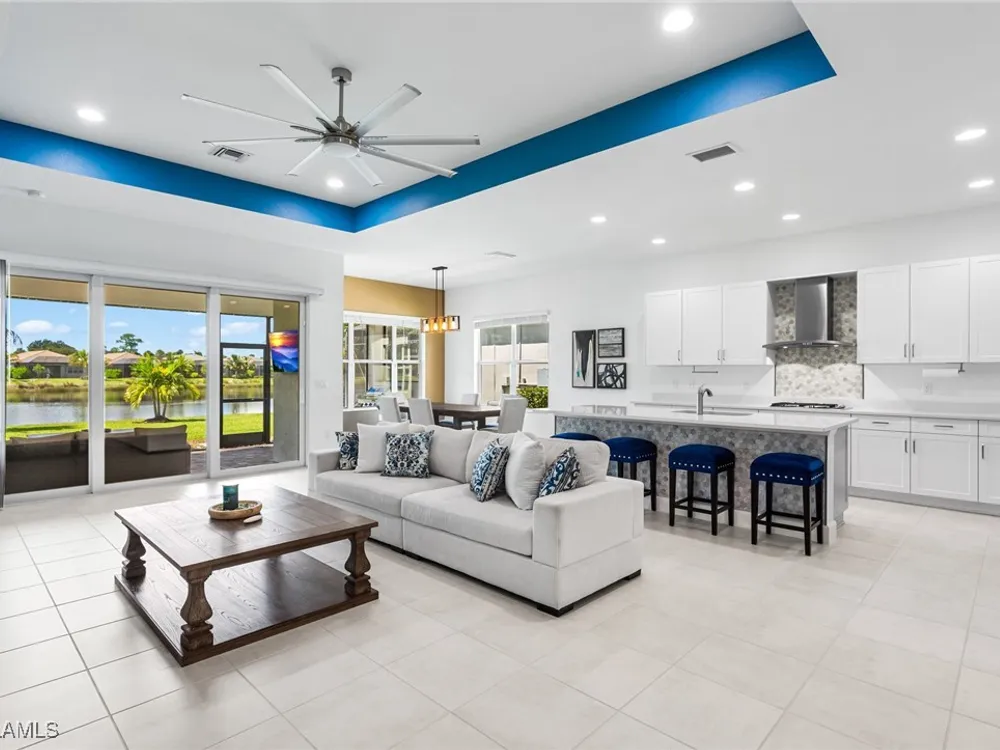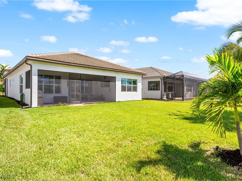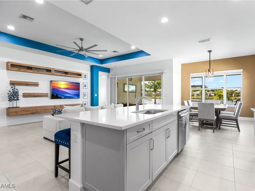 Nestled in the vibrant 55+ gated luxury enclave of Valencia Trails in Naples, this like-new GL Homes Nautilus (2022) presents resort-style living with every modern comforts. Step through dual glass entry doors into a bright, open floor plan, accompanied by custom window treatments, recessed (hi-hat) lighting, and designer fans that keep the ambiance just right. The heart of the home, the chef’s kitchen, is equipped with stainless appliances, a wall oven, a natural-gas cooktop with vented hood, upgraded cabinetry, quartz surfaces, and a striking custom backsplash that extends to the island. A rare 2½-car garage includes a dedicated bay with epoxy flooring and a climate-controlled mini-split for added comfort. Retreat to the expansive primary suite, boasting tray ceilings, two generous closets, dual vanities plus a built-in makeup station, a walk-in shower with bench and dual showerheads, a private water closet, and a spacious linen closet — luxury and practicality combined. The oversized lanai is yours for outdoor entertaining, pre-wired for TV and pre-plumbed for natural gas, ideal for grilling or a future summer kitchen, all while enjoying stunning west-facing lake sunsets; there’s even ample room to add a pool. Impact glass protects every door and window for peace of mind and lock-and-leave ease. This home also unlocks access to an active, engaged lifestyle. The community’s 43,000 sq ft clubhouse offers 8 pickleball courts, 6 tennis courts, 5 bocce courts, two card rooms, a sports lounge with billiards and poker tables, a full art studio with kiln, and a teaching kitchen that hosts professional chef-led classes. Clubs abound — Mahjong, Mexican Train, bocce, pickleball, tennis, car and coin clubs — creating endless opportunities to connect, socialize and enjoy life. With Naples’ beaches, dining and shopping just minutes away, plus Collier County’s reputation for low property tax and safety, this is the epitome of Florida lock-and-leave living done right.
