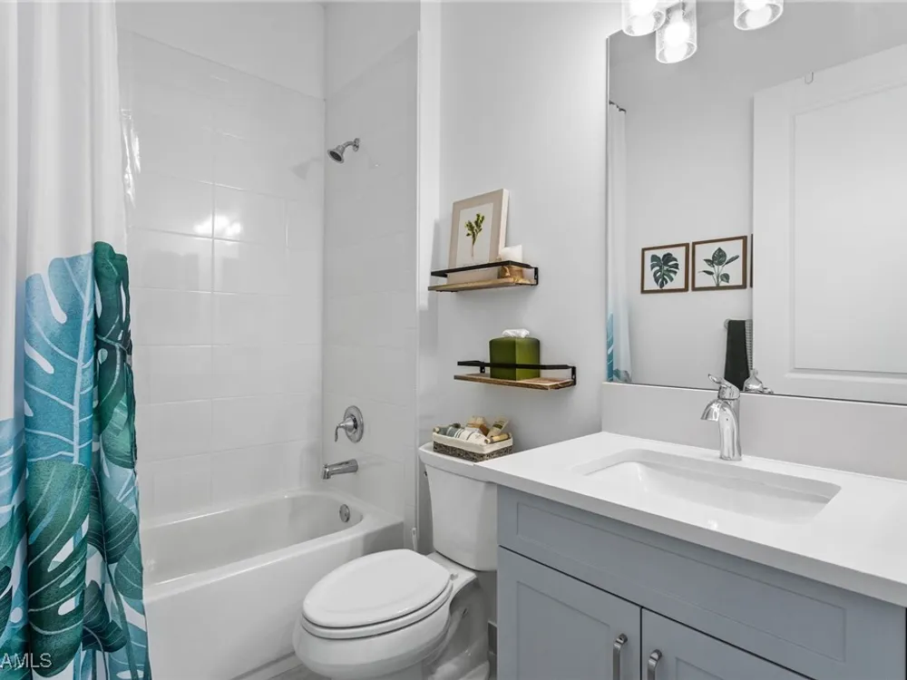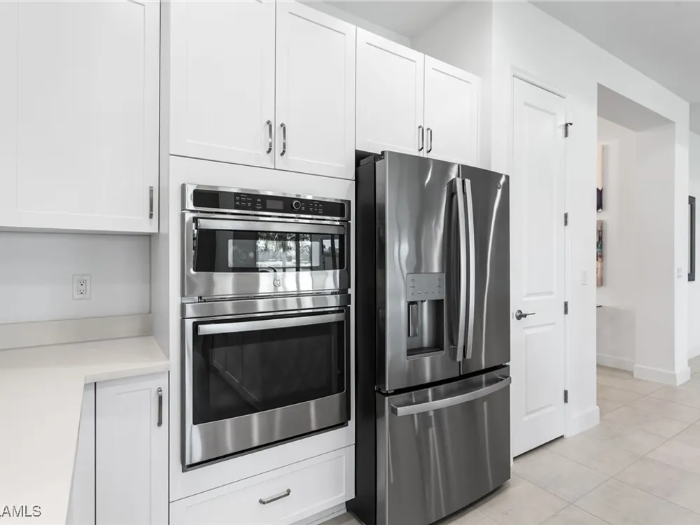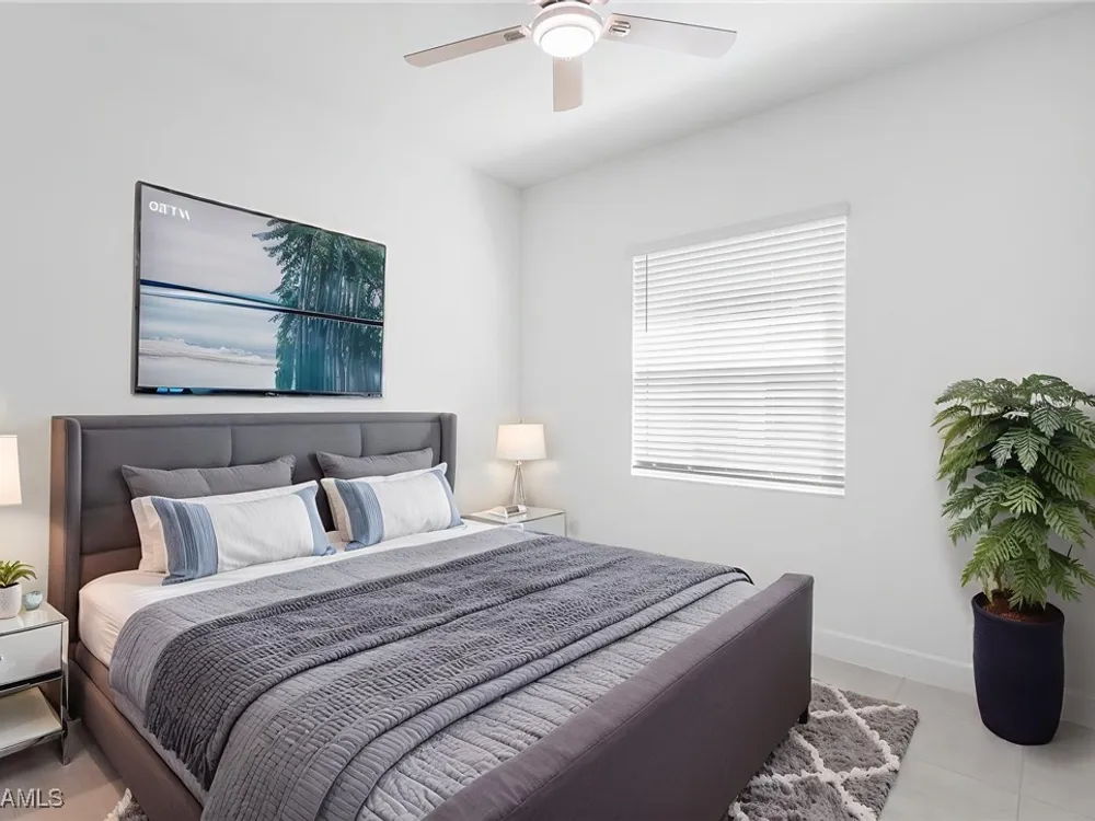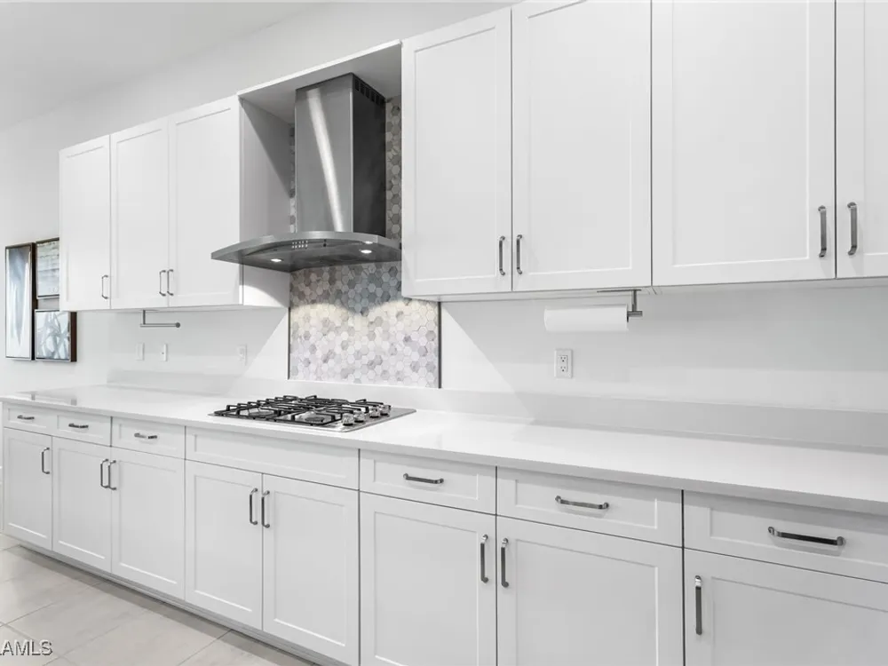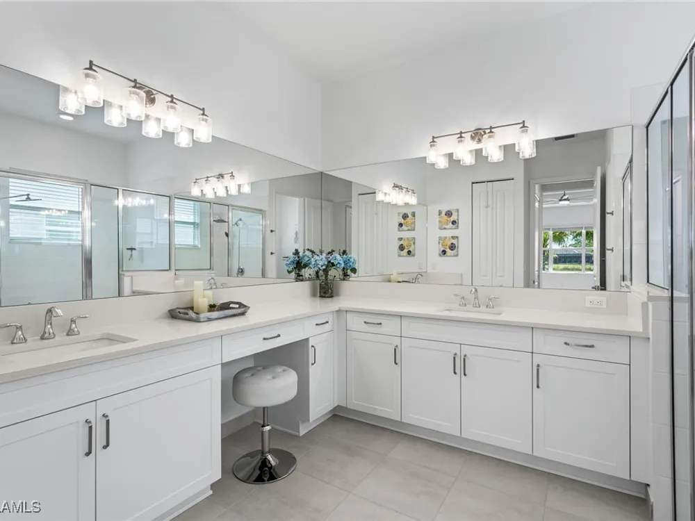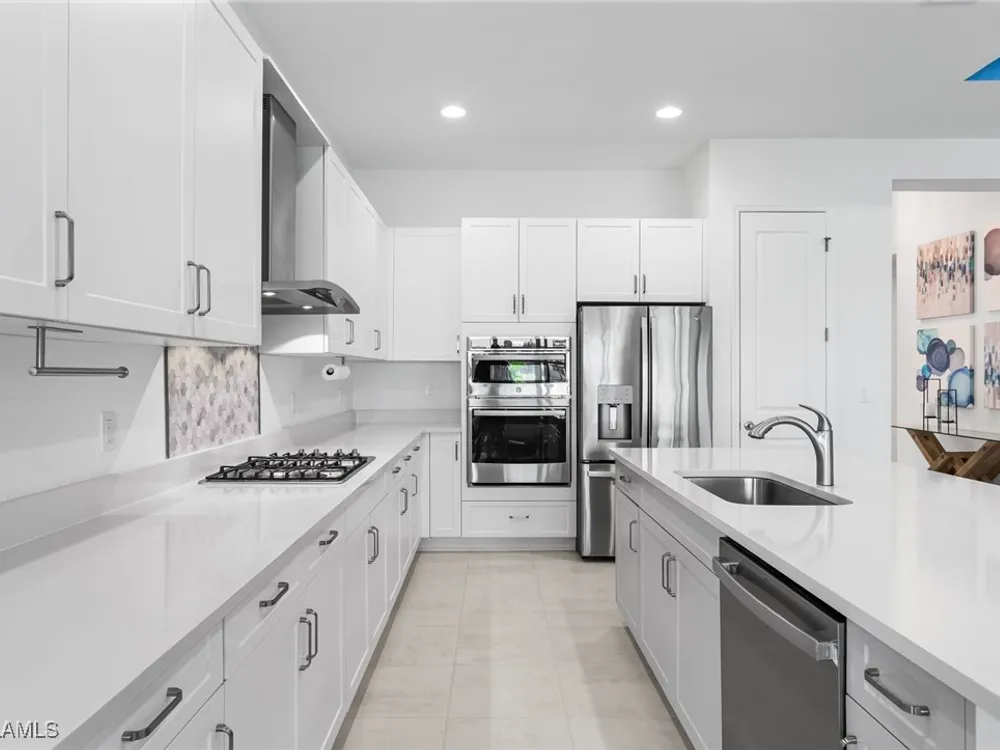 Nestled in the vibrant 55+ gated luxury enclave of Valencia Trails in Naples, this like-new GL Homes Nautilus (2022) presents resort-style living with every modern comforts. Step through dual glass entry doors into a bright, open floor plan, accompanied by custom window treatments, recessed (hi-hat) lighting, and designer fans that keep the ambiance just right. The heart of the home, the chef’s kitchen, is equipped with stainless appliances, a wall oven, a natural-gas cooktop with vented hood, upgraded cabinetry, quartz surfaces, and a striking custom backsplash that extends to the island. A rare 2½-car garage includes a dedicated bay with epoxy flooring and a climate-controlled mini-split for added comfort. Retreat to the expansive primary suite, boasting tray ceilings, two generous closets, dual vanities plus a built-in makeup station, a walk-in shower with bench and dual showerheads, a private water closet, and a spacious linen closet — luxury and practicality combined. The oversized lanai is yours for outdoor entertaining, pre-wired for TV and pre-plumbed for natural gas, ideal for grilling or a future summer kitchen, all while enjoying stunning west-facing lake sunsets; there’s even ample room to add a pool. Impact glass protects every door and window for peace of mind and lock-and-leave ease. This home also unlocks access to an active, engaged lifestyle. The community’s 43,000 sq ft clubhouse offers 8 pickleball courts, 6 tennis courts, 5 bocce courts, two card rooms, a sports lounge with billiards and poker tables, a full art studio with kiln, and a teaching kitchen that hosts professional chef-led classes. Clubs abound — Mahjong, Mexican Train, bocce, pickleball, tennis, car and coin clubs — creating endless opportunities to connect, socialize and enjoy life. With Naples’ beaches, dining and shopping just minutes away, plus Collier County’s reputation for low property tax and safety, this is the epitome of Florida lock-and-leave living done right.