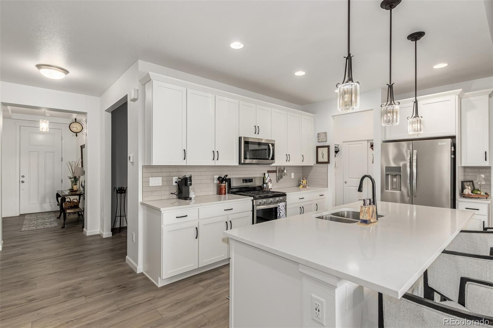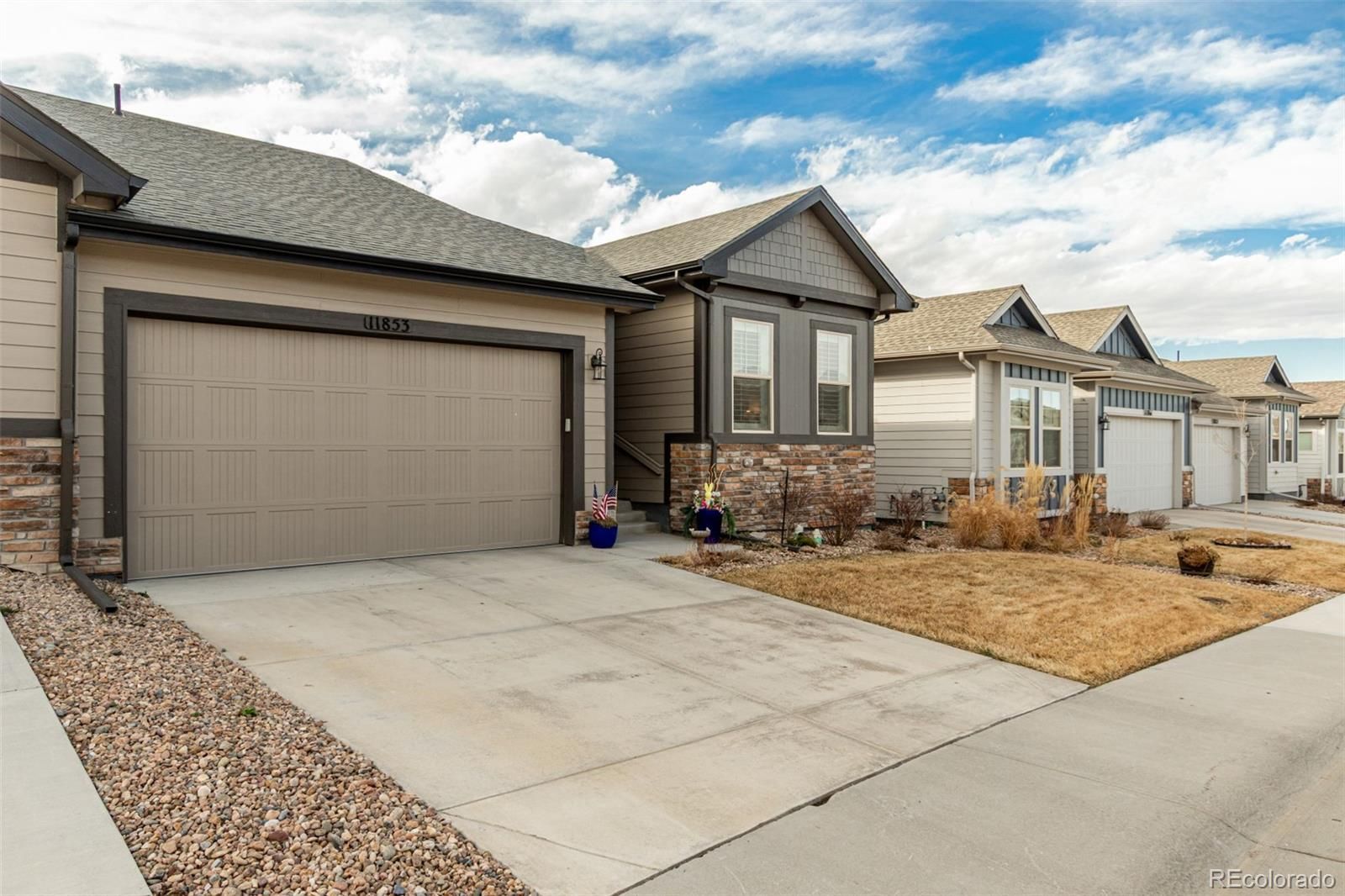 Welcome home to this beautifully designed 3-bedroom, 3-bath ranch-style home with a flex room, built in 2023 and nestled in a quiet community in Parker, Colorado. Thoughtfully crafted with an open layout, this home is filled with natural light and showcases vaulted ceilings in the Great Room and Dining area, creating a bright, airy feel throughout. The main-level primary suite offers comfort and convenience, making everyday living easy and functional. The kitchen is a true standout, featuring quartz countertops, stainless steel appliances, an upgraded dishwasher, gas range, Maple cabinets with a White Icing finish and beautifully selected upgraded luxury vinyl plank flooring, tile and carpet throughout. Additional features include a cozy gas fireplace, central air conditioning, a tankless water heater and a large basement storage area for all your extras. Step outside and enjoy beautiful mountain views right from your backyard along with beautifully upgraded landscaping. With a low HOA that includes front and backyard lawn care, this home offers both comfort and convenience. Ideally located within 5 minutes to E-470 you are minutes from shopping, dining and entertainment. Situated in the Douglas County School District, this home combines modern finishes, low-maintenance living and an exceptional location.