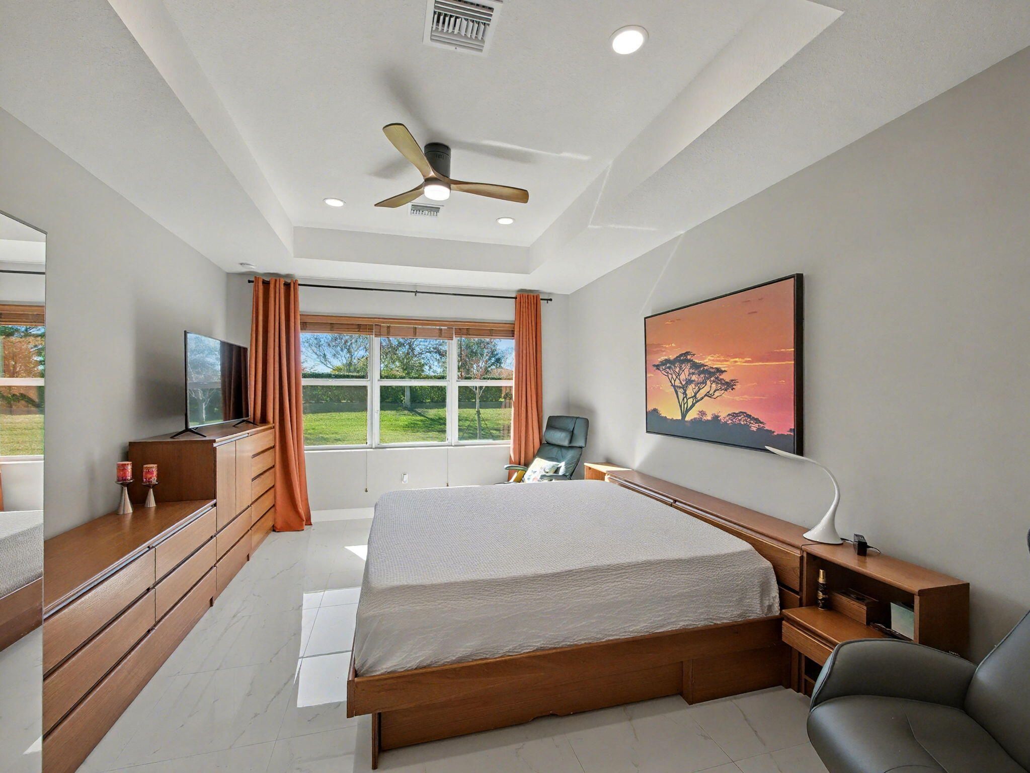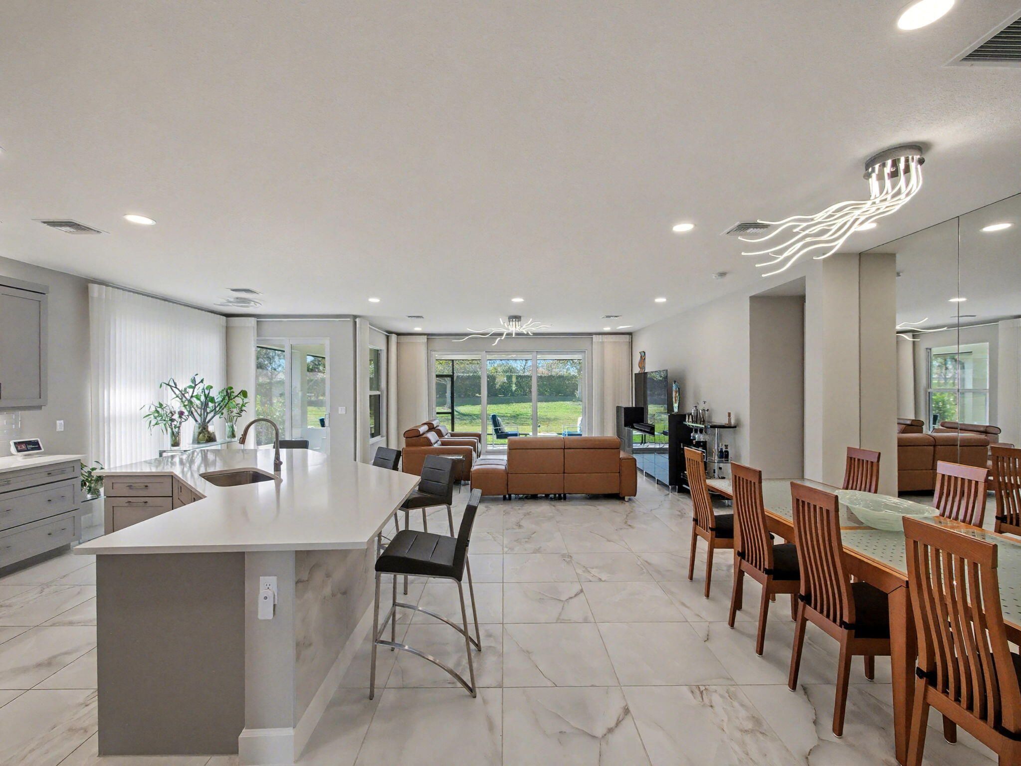 Welcome to this highly upgraded Bimini model offering 4 bedrooms, 3 baths, and 2,377 sq ft of refined living space, perfectly situated on a private landscaped green zone lot with no homes behind at 11862 SW Bristol Bay. The property backs to a peaceful pedestrian-only greenway for walking, biking, and golf carts, providing a serene setting while offering easy access to the Fitness Center, Arts & Culture Center, Riverland Town Center, and other community amenities. The home is also just a short walk to the Cay Social Club, resort-style pool, and green spaces, with convenient golf cart access to the Sports & Racquet Club. Inside, the home features Level 5 24x24 porcelain tile throughout, upgraded hardware, additional LED ceiling lighting with sealed flat bulbs, a smart thermostat, keypad entry, and custom chandeliers in the living and dining areas. The living room showcases wall-to-wall Hunter Douglas remote-control window treatments, while the bedrooms feature Hunter Douglas wooden blinds. The chef's kitchen is beautifully appointed with Level 5 maple cabinetry, quartz countertops, 12 pull-out drawers, four pantry pull-outs, and an additional built-in pantry, offering exceptional storage and functionality. All bathrooms feature quartz countertops, upgraded fixtures, rectangular sinks, ceiling-height polished tile, mirrors to the ceiling, and frameless glass enclosures. The primary spa bath includes a TOTO toilet with Washlet and built-in linen storage. Additional highlights include electrical outlets in all closets, a built-in hallway closet, and custom California Closets in all four walk-in closets. This impeccably maintained home combines luxury finishes, smart upgrades, and a uniquely private greenway setting within one of Port St. Lucie's most sought-after 55+ communities, offering the best of Riverland living.