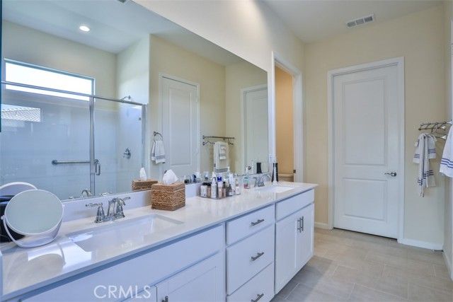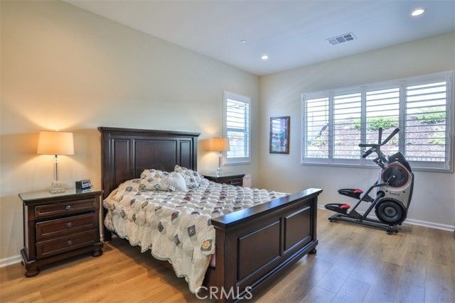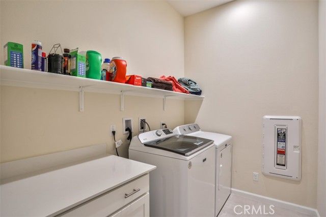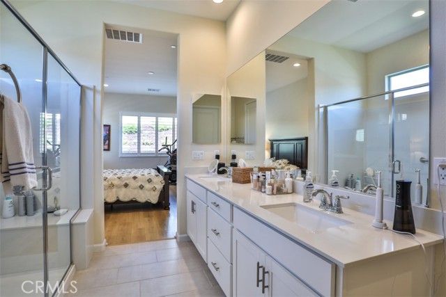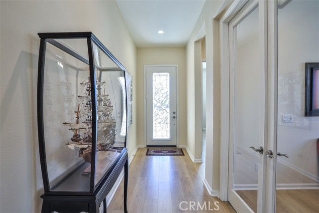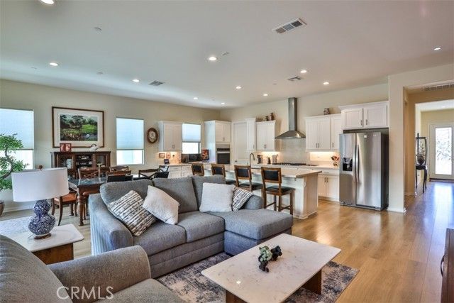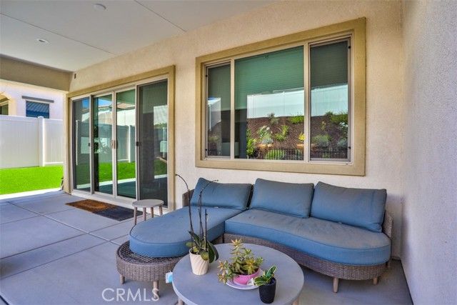Welcome to this beautifully upgraded single-story 2 bedroom plus office, 2 bathroom home offering 1,902 sq ft of open, airy living space in the highly desirable and prestigious 55+ guard-gated Terramor community. This thoughtfully designed home features a spacious, high-end layout that seamlessly blends the living, dining, and kitchen areas—perfect for entertaining family and friends. The kitchen is a chef’s dream, complete with a large island, gas cooktop, double oven, walk-in pantry, and custom shades. Enjoy low electricity costs thanks to the fully paid solar system. The expansive master suite is privately situated at the rear of the home and features a generous walk-in closet, dual sinks, and wood shutters. Throughout the home, you'll find upgraded LVP wood and tile flooring, as well as a separate office/den, laundry room, and modern touches like an elegant glass front door, alarm system, and Ring camera. Both the living and dining rooms offer sliding glass doors that open to a shaded, covered patio and a beautifully landscaped backyard designed for low maintenance with concrete, artificial grass, and drought-tolerant plants. There’s even a private closed in dog run for your furry companion. Located in the heart of Terramor, residents enjoy resort-style amenities including indoor and outdoor pools (with saltwater indoor pool), hot tub, a state-of-the-art fitness center, wellness studio, tennis and pickleball courts, dog park, and over 5 miles of scenic walking trails. This home truly combines luxury, security, and lifestyle in one incredible package.