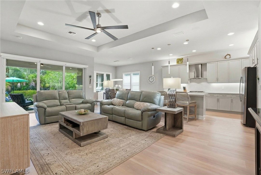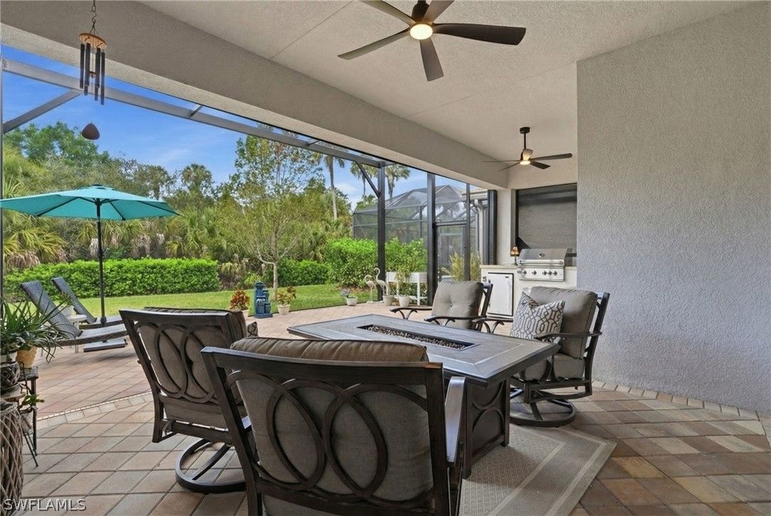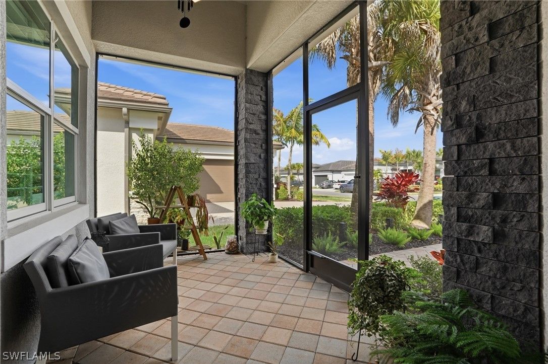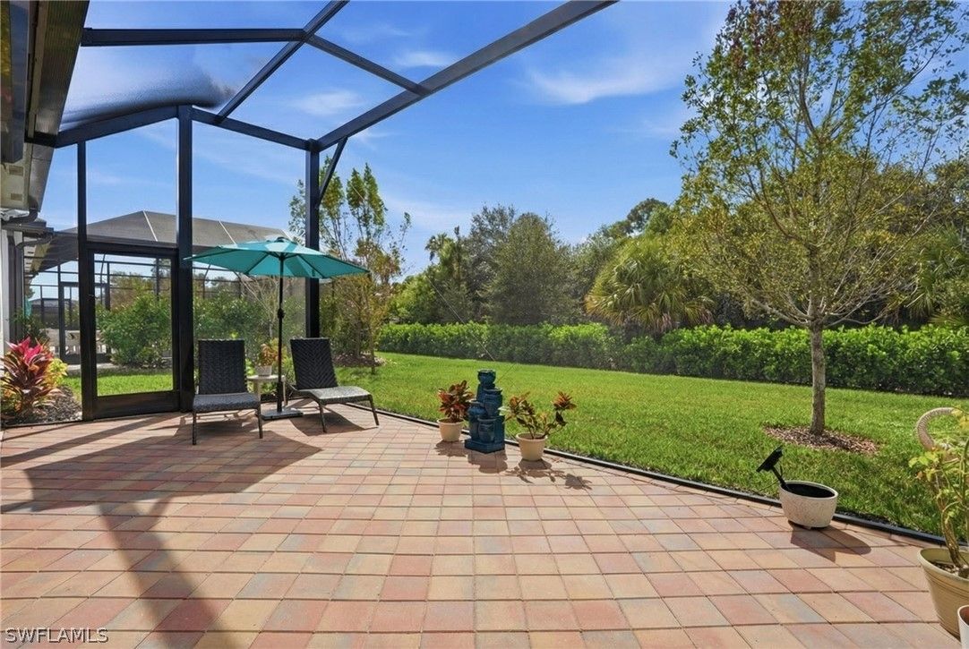Discover effortless Florida living in this beautifully upgraded 2023 Nautilus plan, perfectly positioned on a private lot backing to the preserve for serene views and tranquility. Just a short, enjoyable walk (or quick golf cart ride) to the spectacular clubhouse and resort-style amenities that define this premier 55+ active adult community. Step inside through elegant glass double doors to find an open, light-filled layout featuring 3 bedrooms plus a versatile den, 2.5 baths, and tasteful modern finishes in today's sought-after colors. Luxury vinyl plank flooring flows throughout, complemented by plantation shutters, ceiling fans in every room, and LED under- and over-cabinet lighting that adds warmth and sophistication. The gourmet kitchen shines with quartz countertops, slow-close custom cabinetry, pull-out drawers, integrated trash/recycle bins, and stainless appliances. The owner's suite is a true retreat, boasting custom closets, a frameless glass shower with privacy windows and grab bars, and peaceful preserve outlooks. Entertain indoors or out on the extended screened lanai with a fully equipped outdoor kitchen (grill, sink, fridge) and hurricane shutters operated by remote. The oversized 2.5-car garage (with golf cart space) includes overhead Saferack storage and a utility sink—ideal for hobbies, gear, or zipping to the clubhouse in style. Additional highlights include a Ring doorbell, upgraded 8x8 pavers, backyard lighting, and thoughtful touches throughout. Built in February 2023, this home blends contemporary style with low-maintenance luxury, all within steps of Valencia Trails' world-class offerings: a grand 43,000+ sq ft clubhouse with restaurant and bar, multiple pools, fitness center, tennis/pickleball courts, walking trails, and a vibrant social calendar. Priced to sell—don't miss this rare combination of upgrades, location, and lifestyle in one of Naples' most desirable 55+ communities. Schedule your private showing today!