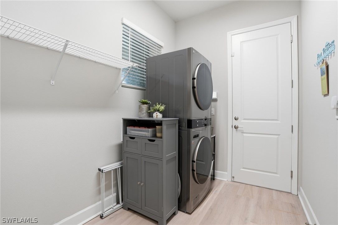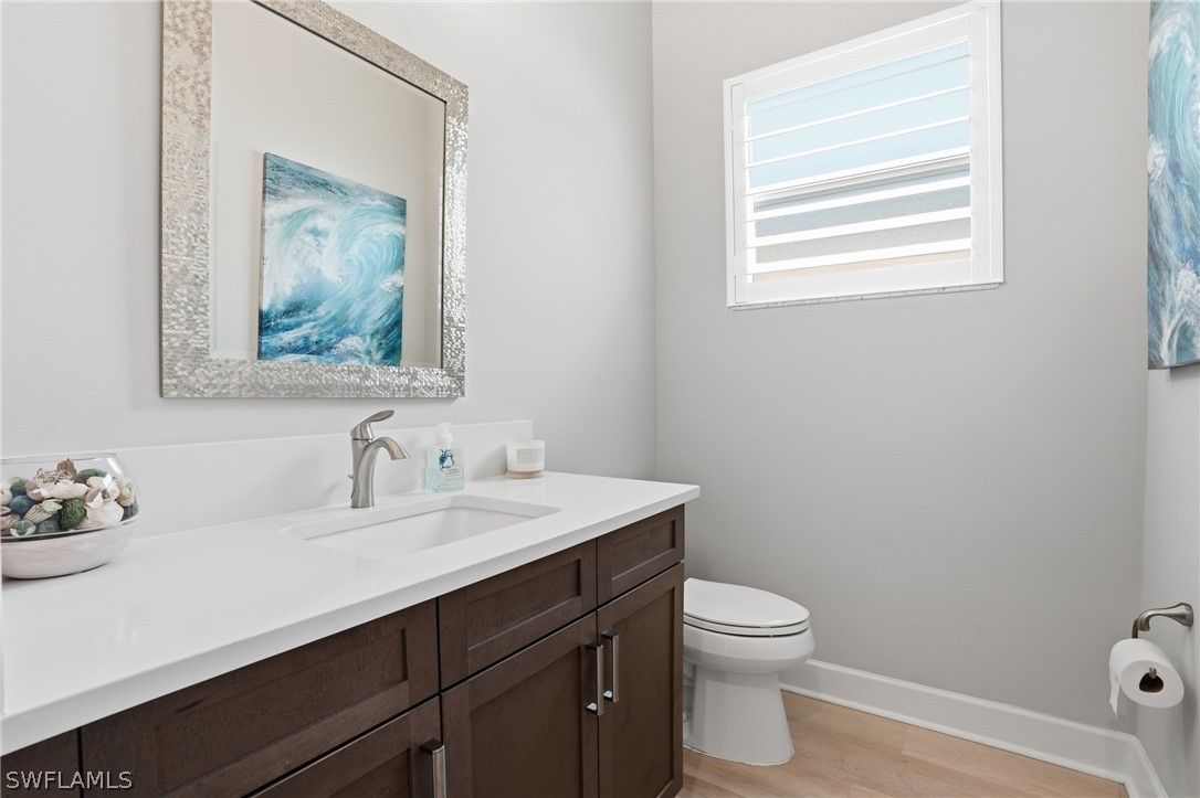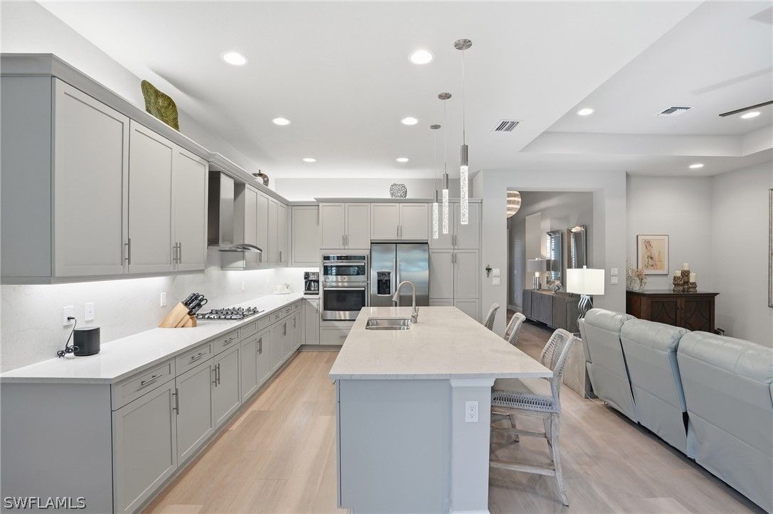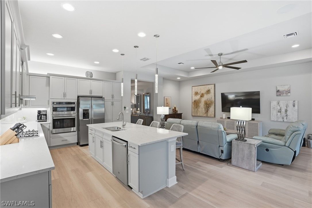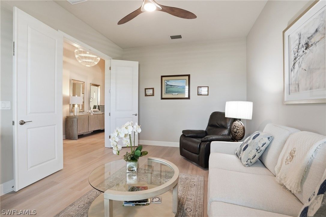 Discover effortless Florida living in this beautifully upgraded 2023 Nautilus plan, perfectly positioned on a private lot backing to the preserve for serene views and tranquility. Just a short, enjoyable walk (or quick golf cart ride) to the spectacular clubhouse and resort-style amenities that define this premier 55+ active adult community. Step inside through elegant glass double doors to find an open, light-filled layout featuring 3 bedrooms plus a versatile den, 2.5 baths, and tasteful modern finishes in today's sought-after colors. Luxury vinyl plank flooring flows throughout, complemented by plantation shutters, ceiling fans in every room, and LED under- and over-cabinet lighting that adds warmth and sophistication. The gourmet kitchen shines with quartz countertops, slow-close custom cabinetry, pull-out drawers, integrated trash/recycle bins, and stainless appliances. The owner's suite is a true retreat, boasting custom closets, a frameless glass shower with privacy windows and grab bars, and peaceful preserve outlooks. Entertain indoors or out on the extended screened lanai with a fully equipped outdoor kitchen (grill, sink, fridge) and hurricane shutters operated by remote. The oversized 2.5-car garage (with golf cart space) includes overhead Saferack storage and a utility sink—ideal for hobbies, gear, or zipping to the clubhouse in style. Additional highlights include a Ring doorbell, upgraded 8x8 pavers, backyard lighting, and thoughtful touches throughout. Built in February 2023, this home blends contemporary style with low-maintenance luxury, all within steps of Valencia Trails' world-class offerings: a grand 43,000+ sq ft clubhouse with restaurant and bar, multiple pools, fitness center, tennis/pickleball courts, walking trails, and a vibrant social calendar. Priced to sell—don't miss this rare combination of upgrades, location, and lifestyle in one of Naples' most desirable 55+ communities. Schedule your private showing today!