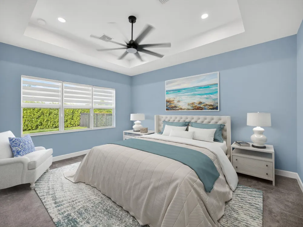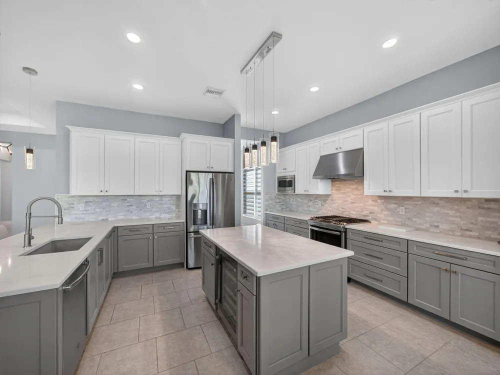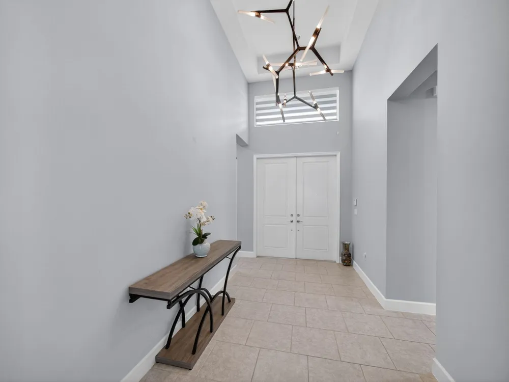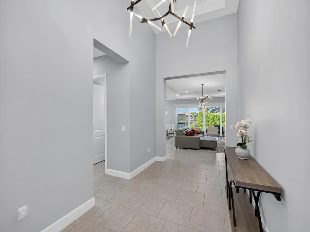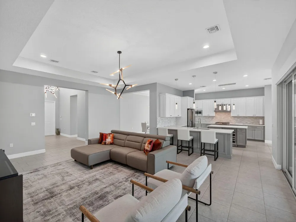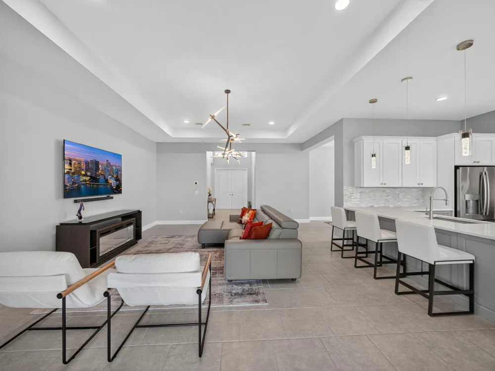Welcome to this beautifully updated three-bedroom, two-and-a-half-bath single-family home with a spacious three-car garage, perfectly positioned on a tranquil lake in the highly sought-after Riverland's Valencia Cay. This residence blends luxury and comfort with a thoughtfully designed open floor plan, soaring tray ceilings, and elegant finishes throughout.The gourmet kitchen is a showstopper, remodeled with upgraded stainless steel appliances, sleek quartz countertops, a generous center island complete with a wine refrigerator, and captivating lake views that make cooking and entertaining a joy. The bedrooms are spacious and inviting, while the modern bathrooms offer spa-like sophistication and comfort.Step outside to the extended, screen-enclosed lanai and enjoy breathtaking long