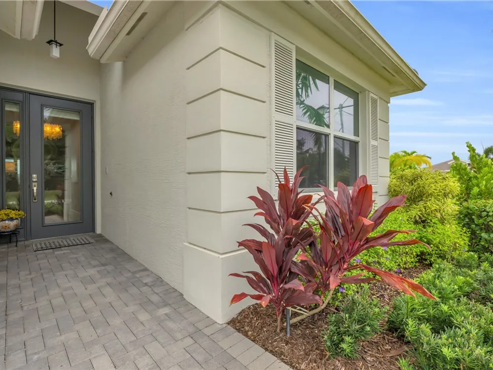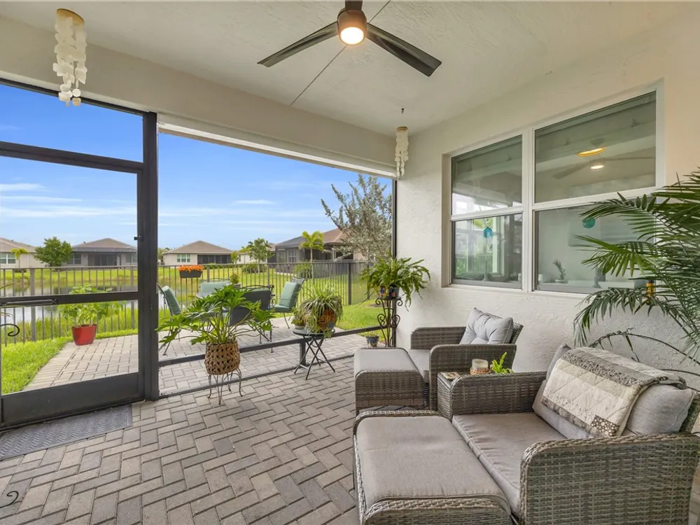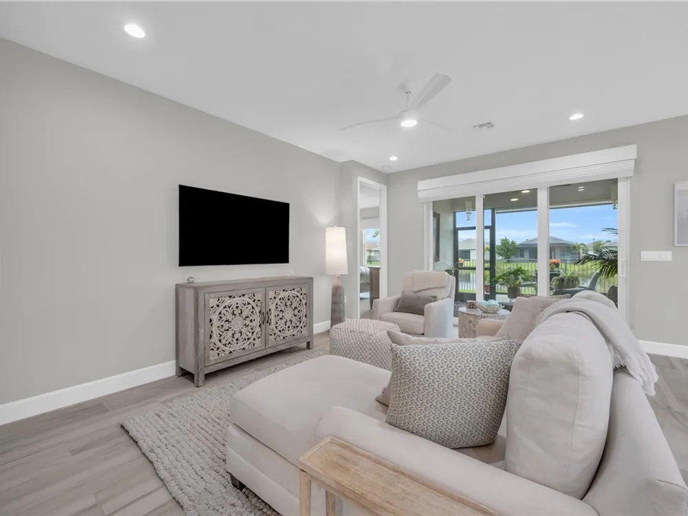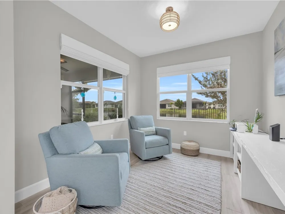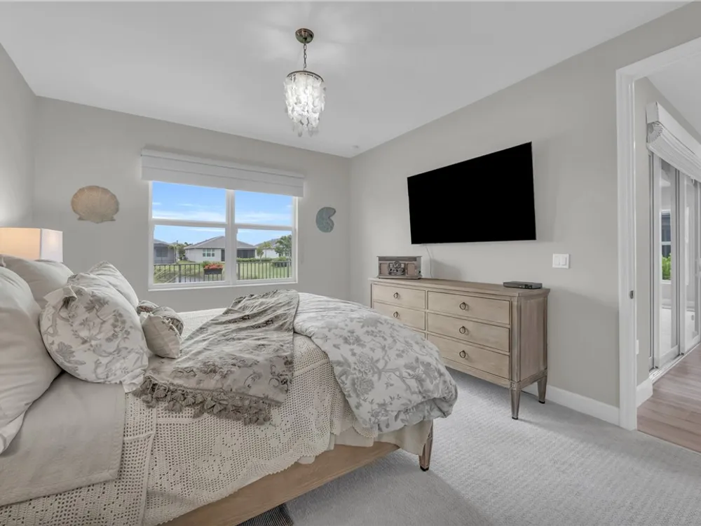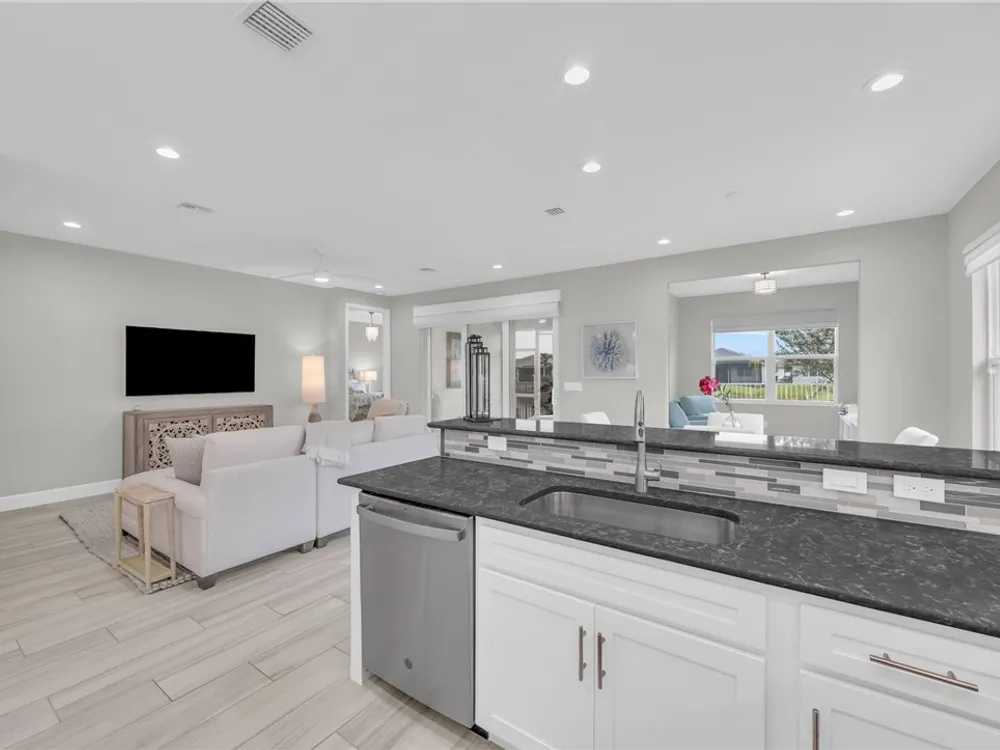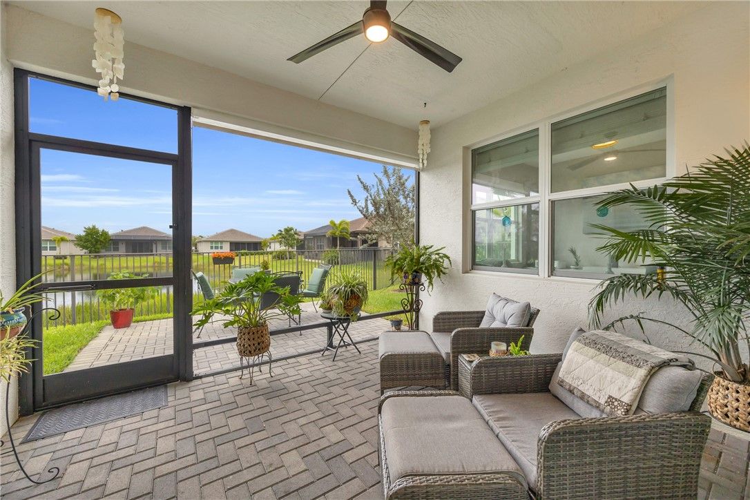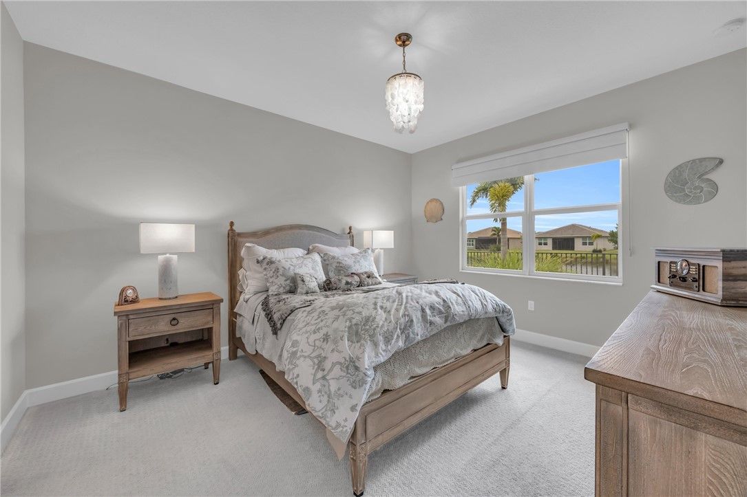 Welcome home to this coastal Osprey model, featuring 2 beds, 2 bath & a den. This light, bright, home features wood-like tile in the main living area and hurricane rated impact windows and doors, adorned with custom Hunter Douglas blinds. The kitchen is fit for a chef, with quartz countertops, stylish backsplash, stainless steel appliances, natural gas stove, 42-inch white shaker cabinets with crown molding, undermount lighting, and built-in pantry. The spacious primary suite features lake views, dual closets, and an ensuite bathroom with quartz counters, dual vanities and large shower.