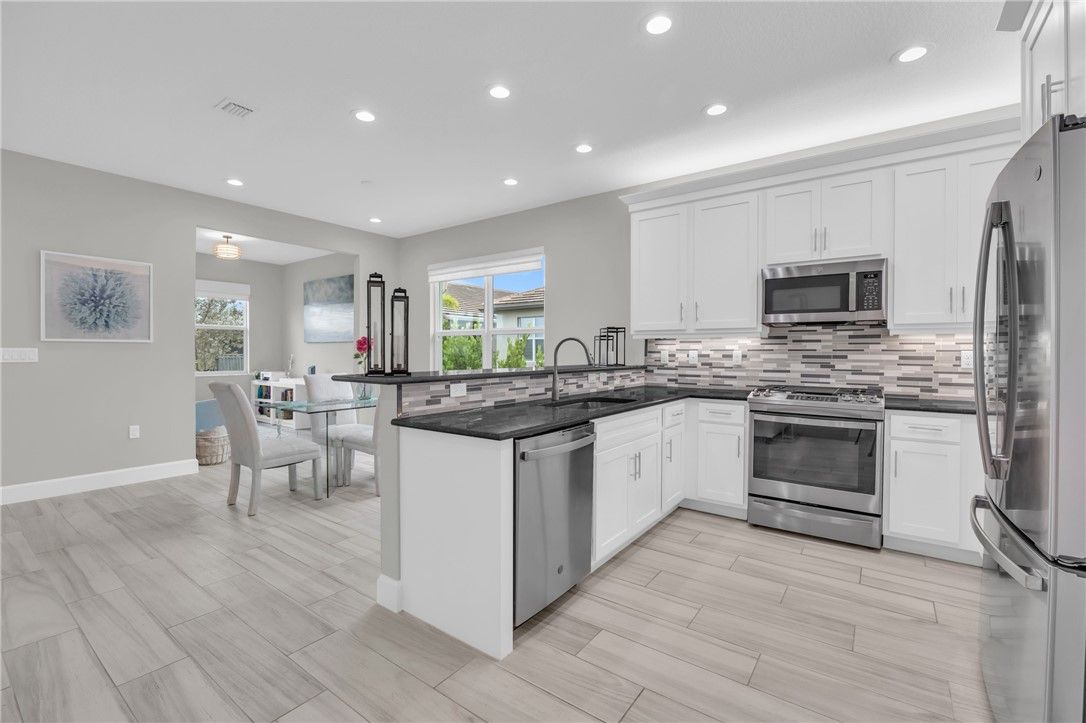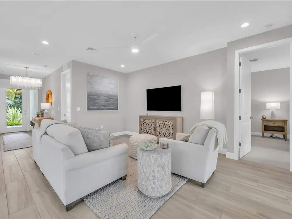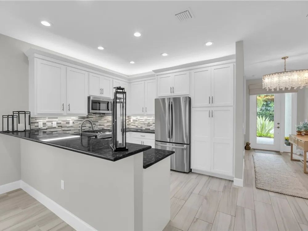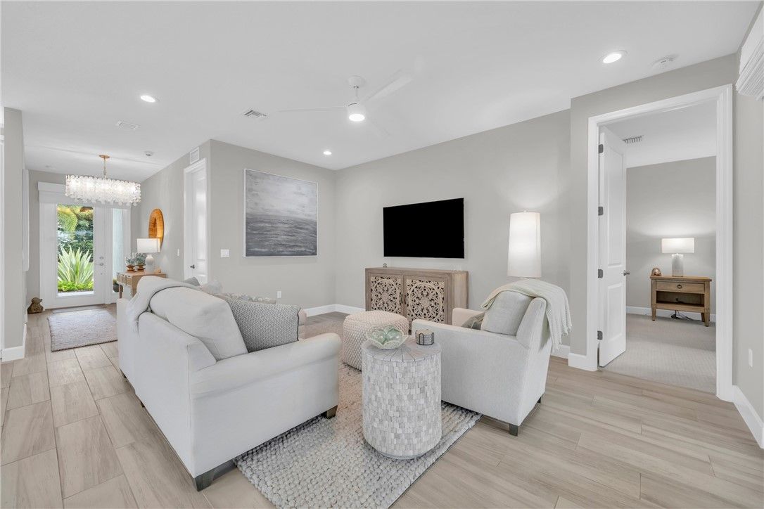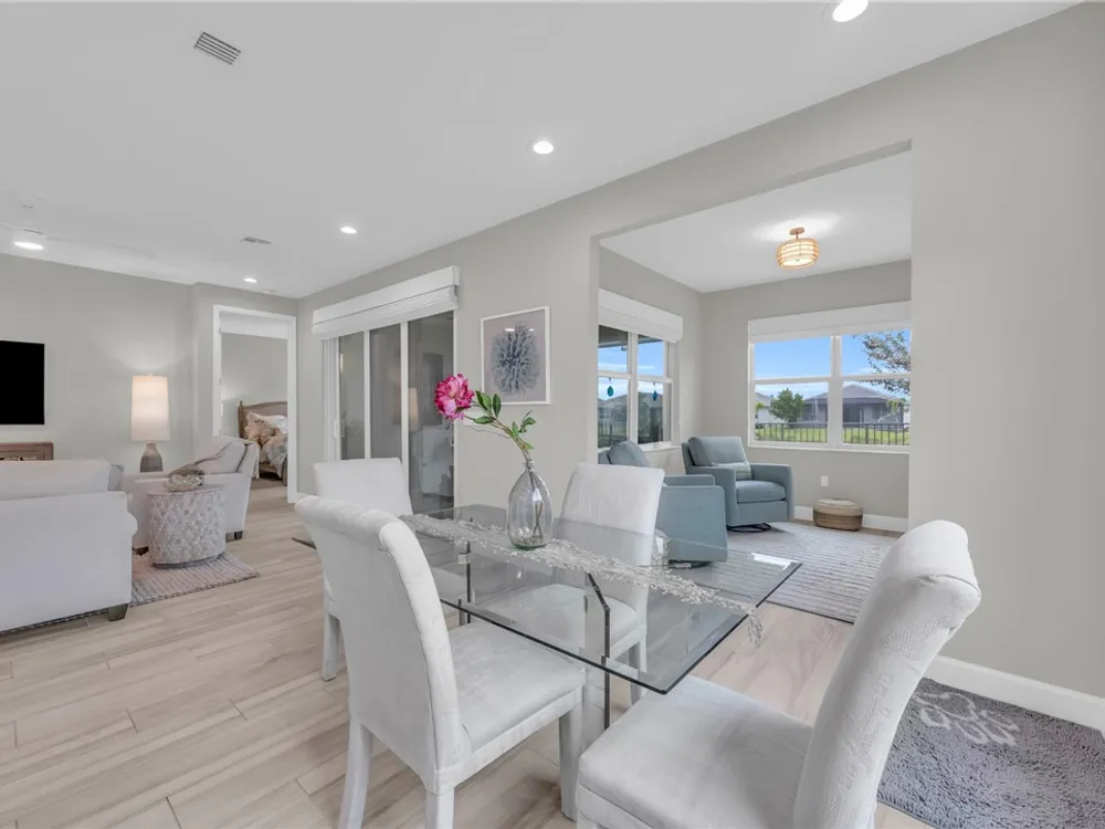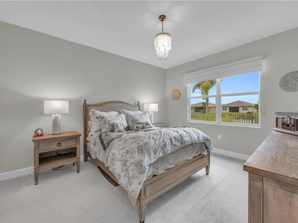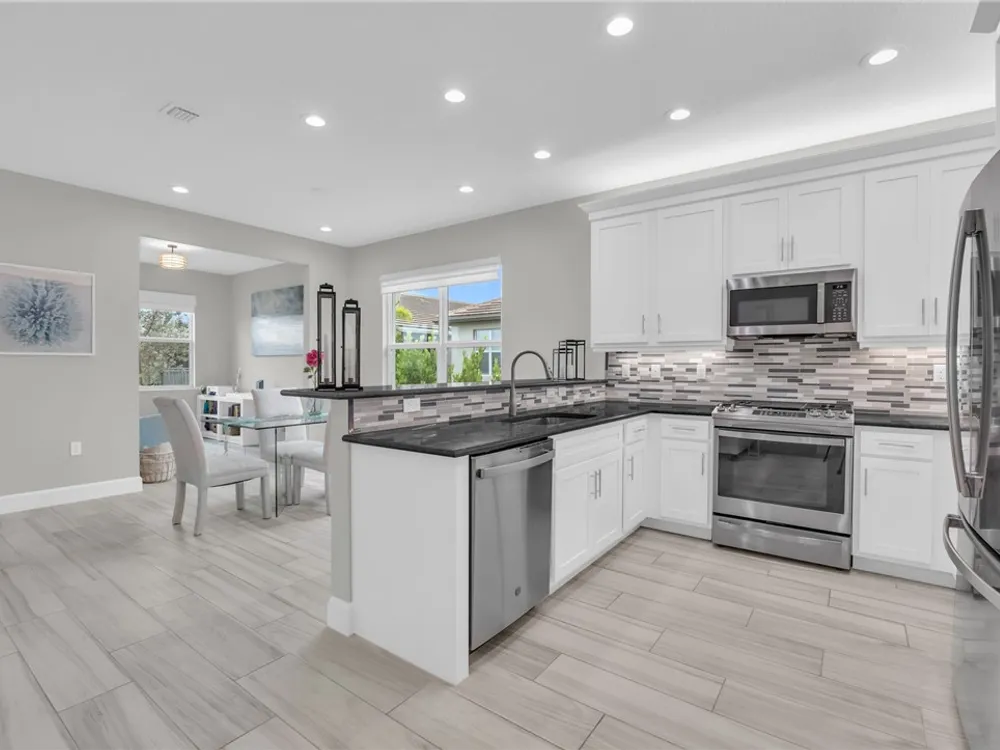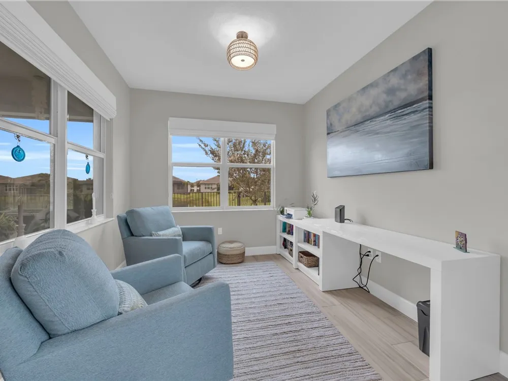 Welcome home to this coastal Osprey model, featuring 2 beds, 2 bath & a den. This light, bright, home features wood-like tile in the main living area and hurricane rated impact windows and doors, adorned with custom Hunter Douglas blinds. The kitchen is fit for a chef, with quartz countertops, stylish backsplash, stainless steel appliances, natural gas stove, 42-inch white shaker cabinets with crown molding, undermount lighting, and built-in pantry. The spacious primary suite features lake views, dual closets, and an ensuite bathroom with quartz counters, dual vanities and large shower.