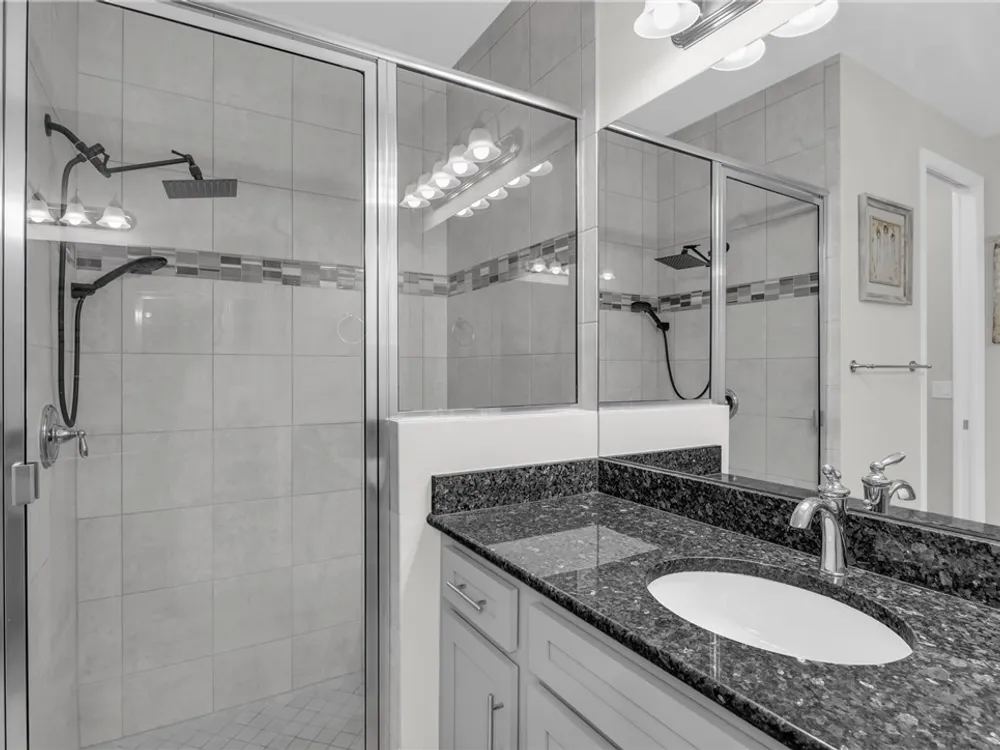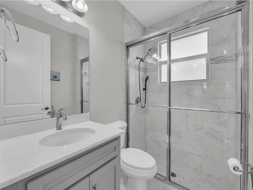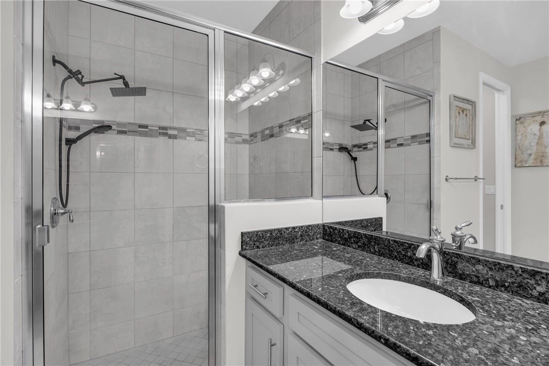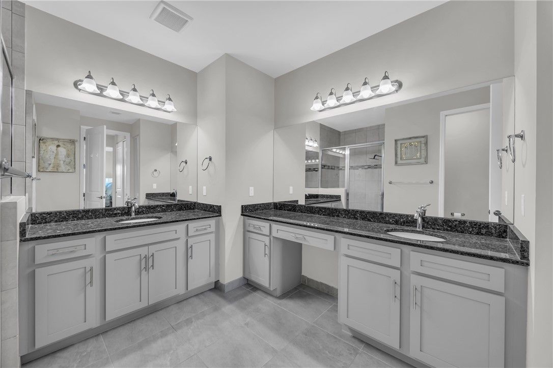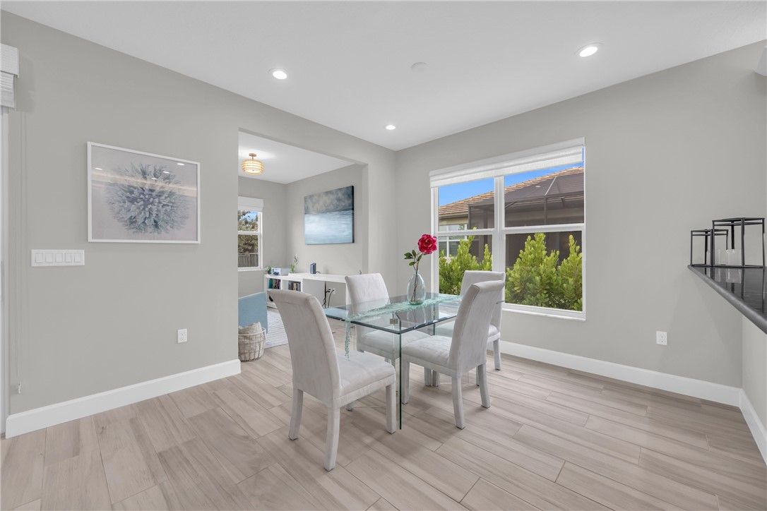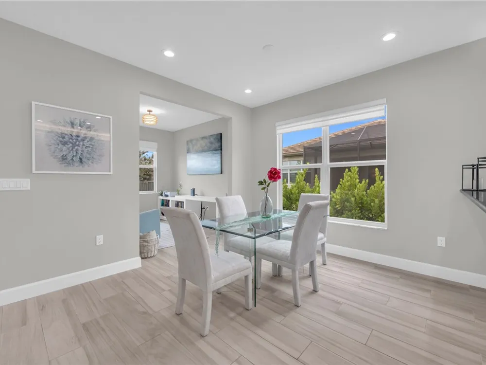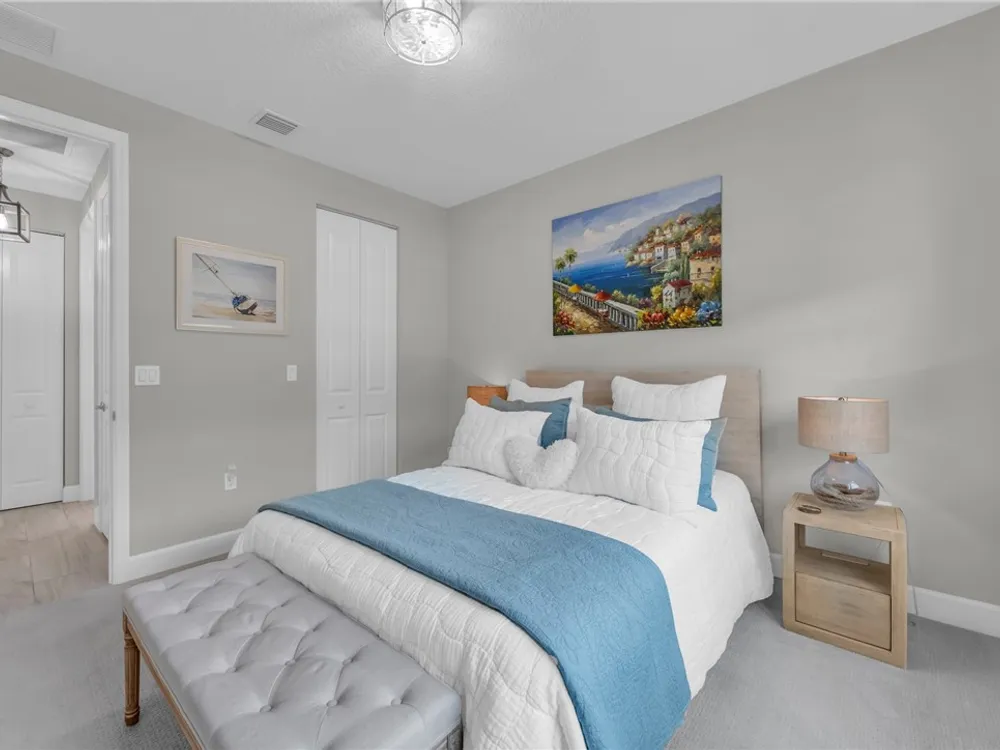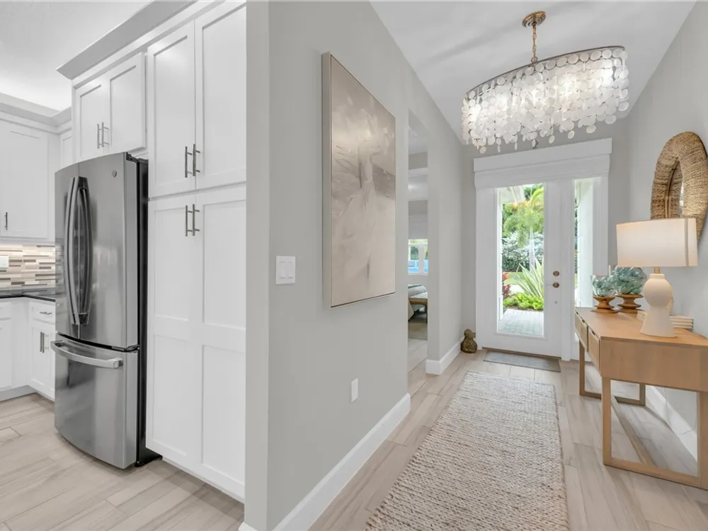 Welcome home to this coastal Osprey model, featuring 2 beds, 2 bath & a den. This light, bright, home features wood-like tile in the main living area and hurricane rated impact windows and doors, adorned with custom Hunter Douglas blinds. The kitchen is fit for a chef, with quartz countertops, stylish backsplash, stainless steel appliances, natural gas stove, 42-inch white shaker cabinets with crown molding, undermount lighting, and built-in pantry. The spacious primary suite features lake views, dual closets, and an ensuite bathroom with quartz counters, dual vanities and large shower.