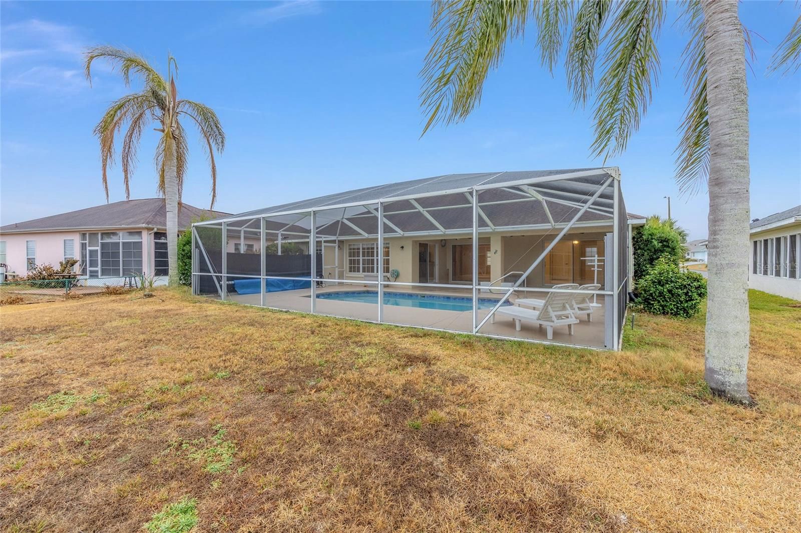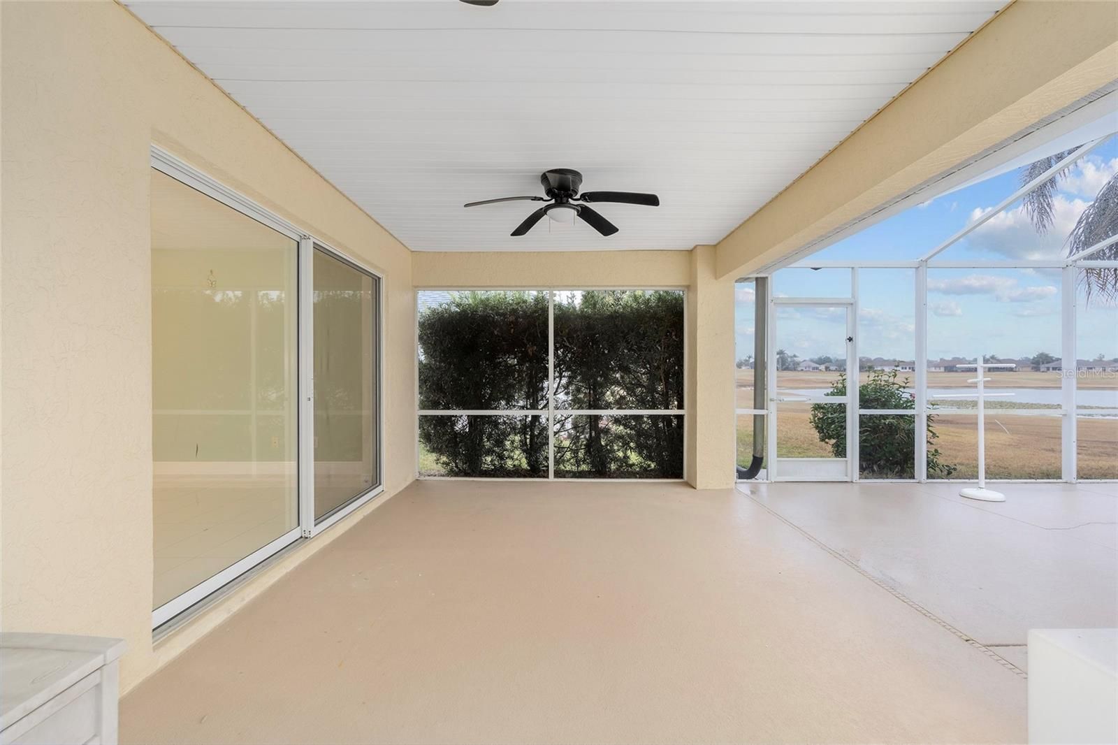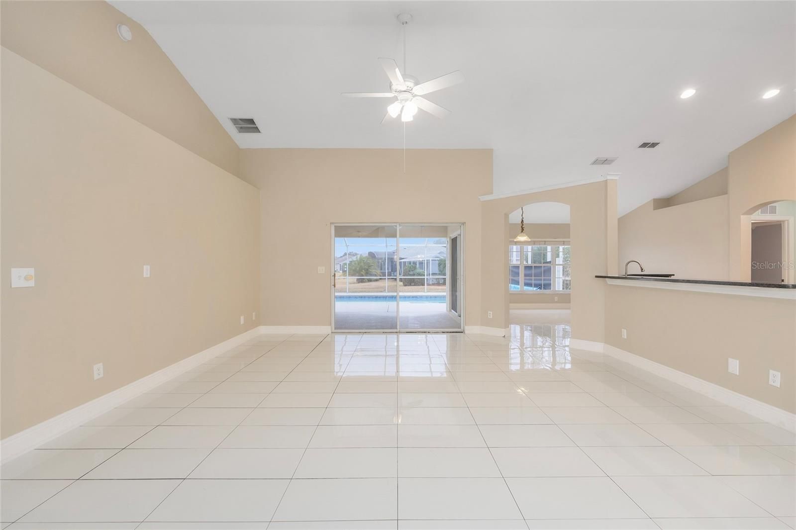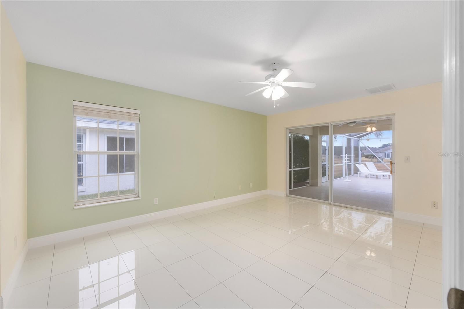 Pool home with golf course and pond views, located in Stonecrest, a gated 55+ community in Summerfield—just minutes from The Villages. This spacious 3-bedroom home offers 1,815 square feet of living space under air, plus outstanding outdoor living with a large rear patio, screened birdcage, expansive pool decking, and a crystal-clear swimming pool. The pool has newer gunite, tile coping, movable privacy shades, solar heat system, retractable pool blanket on rollers, a remote-controlled color-changing LED pool light and more, perfect for evening enjoyment and entertaining. Inside, the home features tile and laminate flooring throughout—no carpet. The open kitchen overlooks the living area and was updated in 2026 with granite countertops, a new sink, faucet, and garbage disposal. Additional highlights include stainless steel appliances, a built-in pantry, and a skylight that fills the kitchen with natural light. The primary suite features sliding glass doors that open directly to the pool patio, two separate walk-in closets, and a spacious en-suite bathroom with a jetted soaking tub, a walk-in tiled shower, and dual sinks—each with its own vanity. Additional features include a two-car garage, indoor laundry room, welcoming front foyer, and a covered front porch. Built with durable concrete block and stucco construction, this well-maintained home includes a new hip roof in 2018 and a new 3.5-ton Carrier HVAC system in 2015. Stonecrest is a highly desirable 55+ golf course community known for its active, amenity-rich lifestyle, offering four pools (one indoor), pickleball courts, softball, an 18-hole championship golf course, the Broad Stripes Golf & Social Club, miles of scenic walking paths, rolling pastures and meadows, and over 80 clubs and activities. A convenient golf-cart bridge provides easy access to The Villages. Schedule your private showing today and experience the Stonecrest lifestyle for yourself.