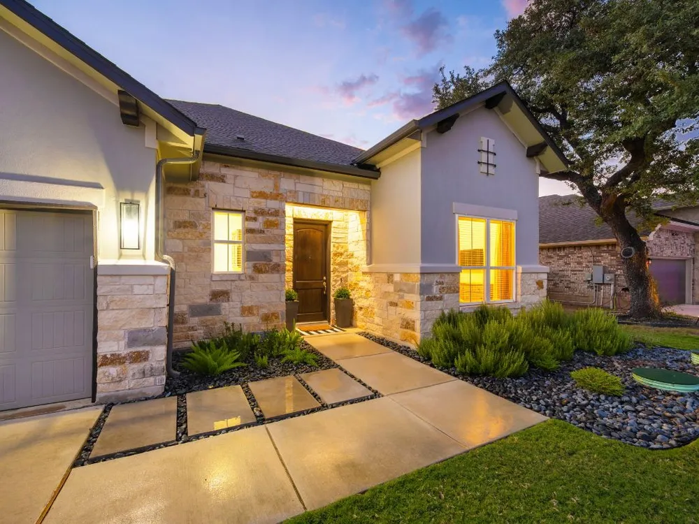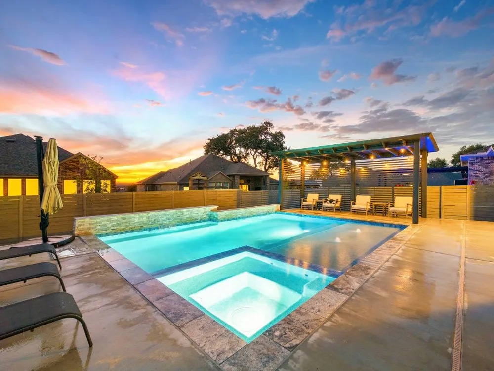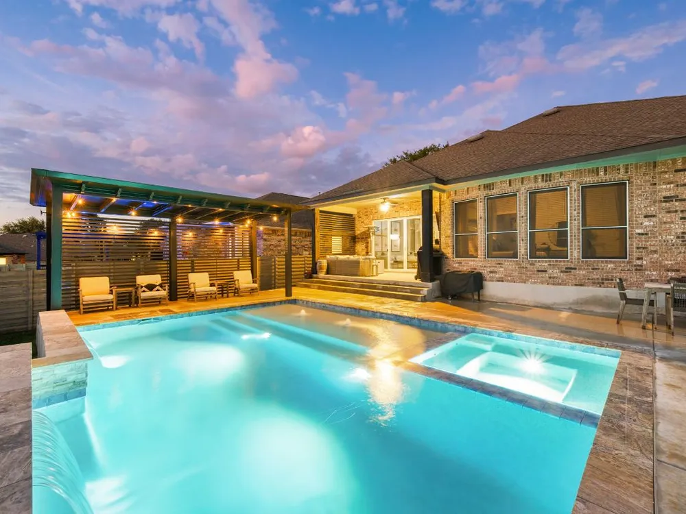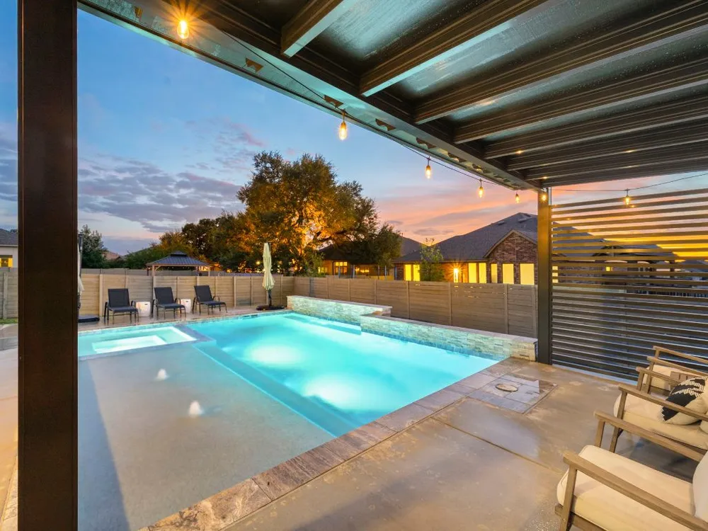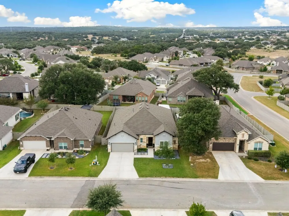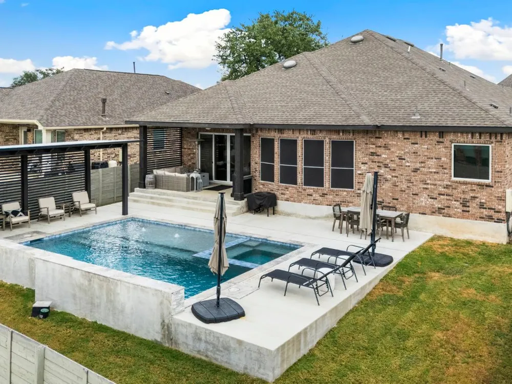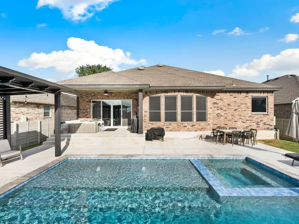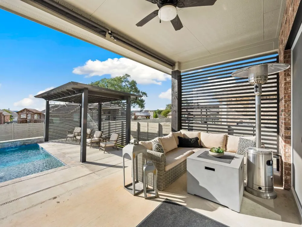 Experience effortless Hill Country living in this stunning single-story home nestled in The Grove at Vintage Oaks—one of New Braunfels’ most sought-after communities. Spanning 2,935 square feet, this 4-bedroom, 3.5-bath residence features an open, light-filled floor plan designed for both comfort and connection. The expansive family room with soaring ceilings flows seamlessly into a chef-inspired kitchen and breakfast nook, while a separate dining area provides the perfect space for gatherings and celebrations. A dedicated office offers flexibility for work or creative pursuits, and every room reflects thoughtful craftsmanship and an inviting sense of space. Step outside to your private backyard oasis, where a heated pool, relaxing spa, and shaded pergola create the ultimate retreat for year-round enjoyment. Whether hosting friends or savoring quiet evenings under the stars, this home offers the ideal balance of luxury and leisure. Located in a world-class neighborhood renowned for its resort-style amenities—including multiple pools, a lazy river, fitness center, sports courts, trails, and community events—this residence blends everyday comfort with the best of Hill Country living. Welcome home to The Grove at Vintage Oaks, where style, serenity, and community come together beautifully.