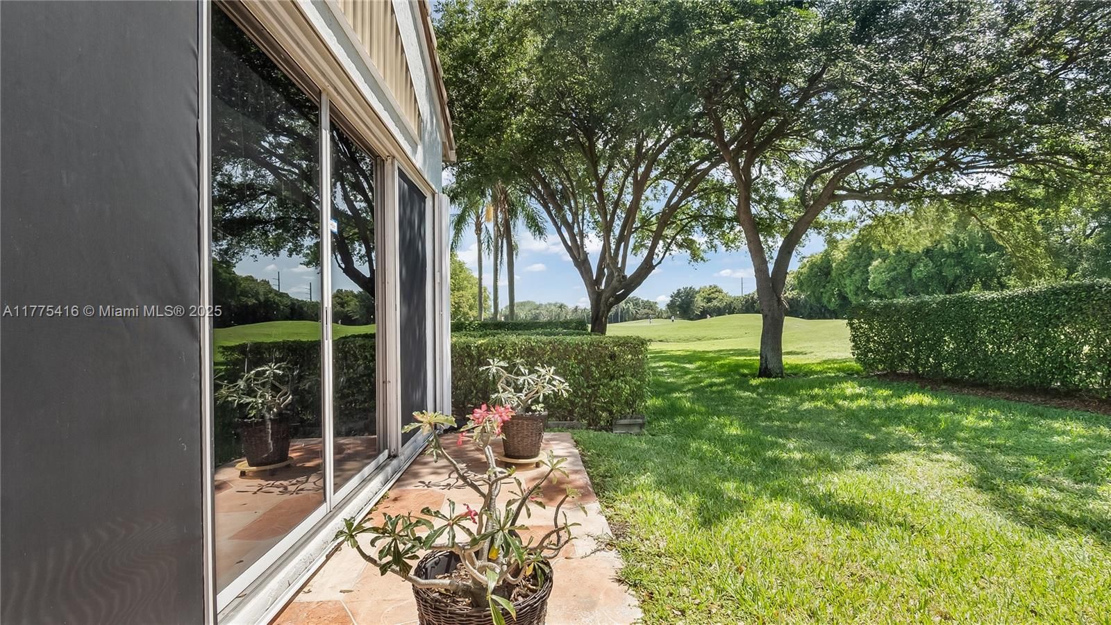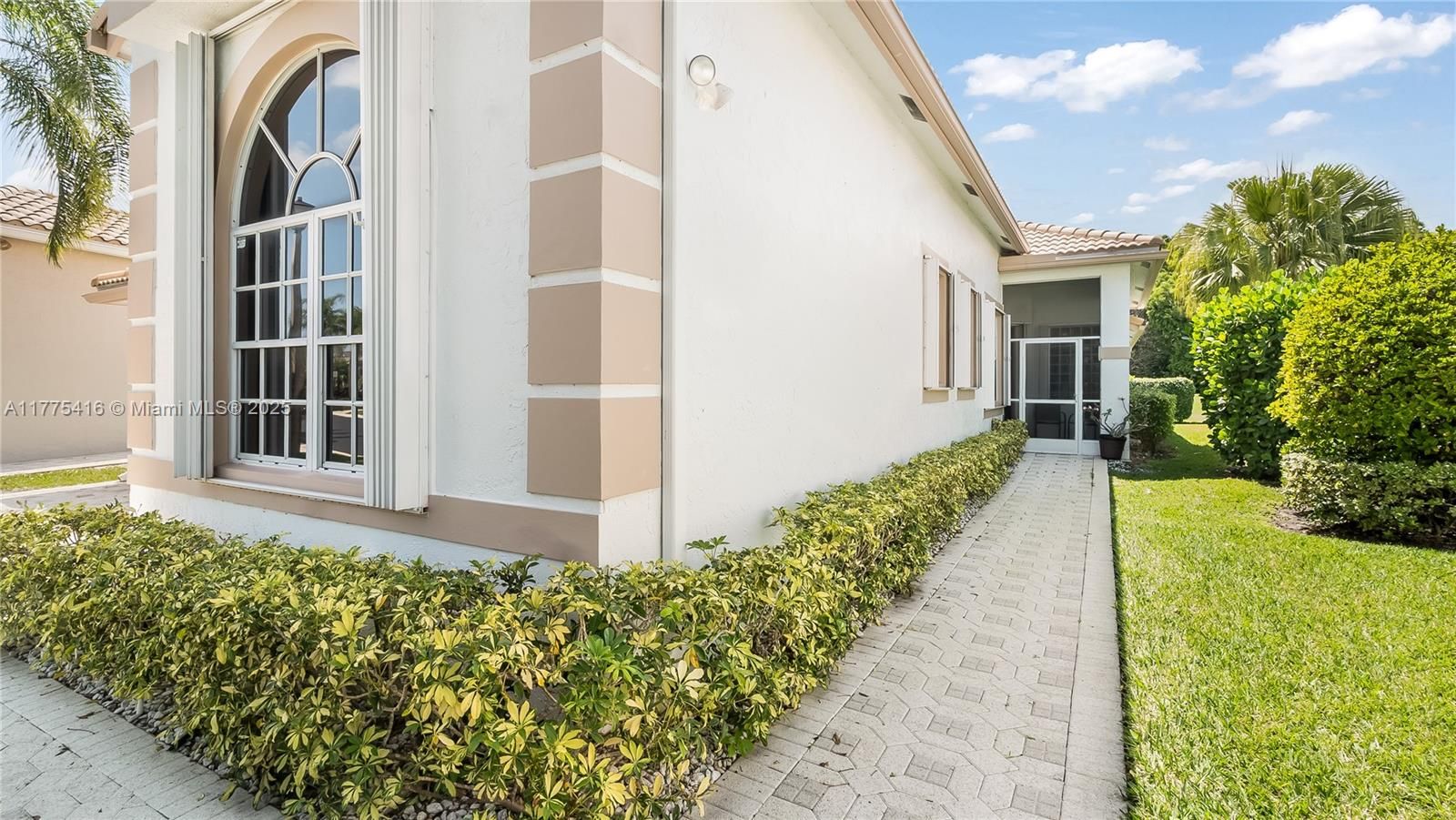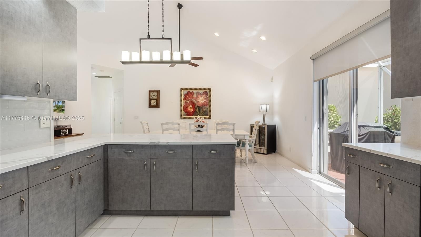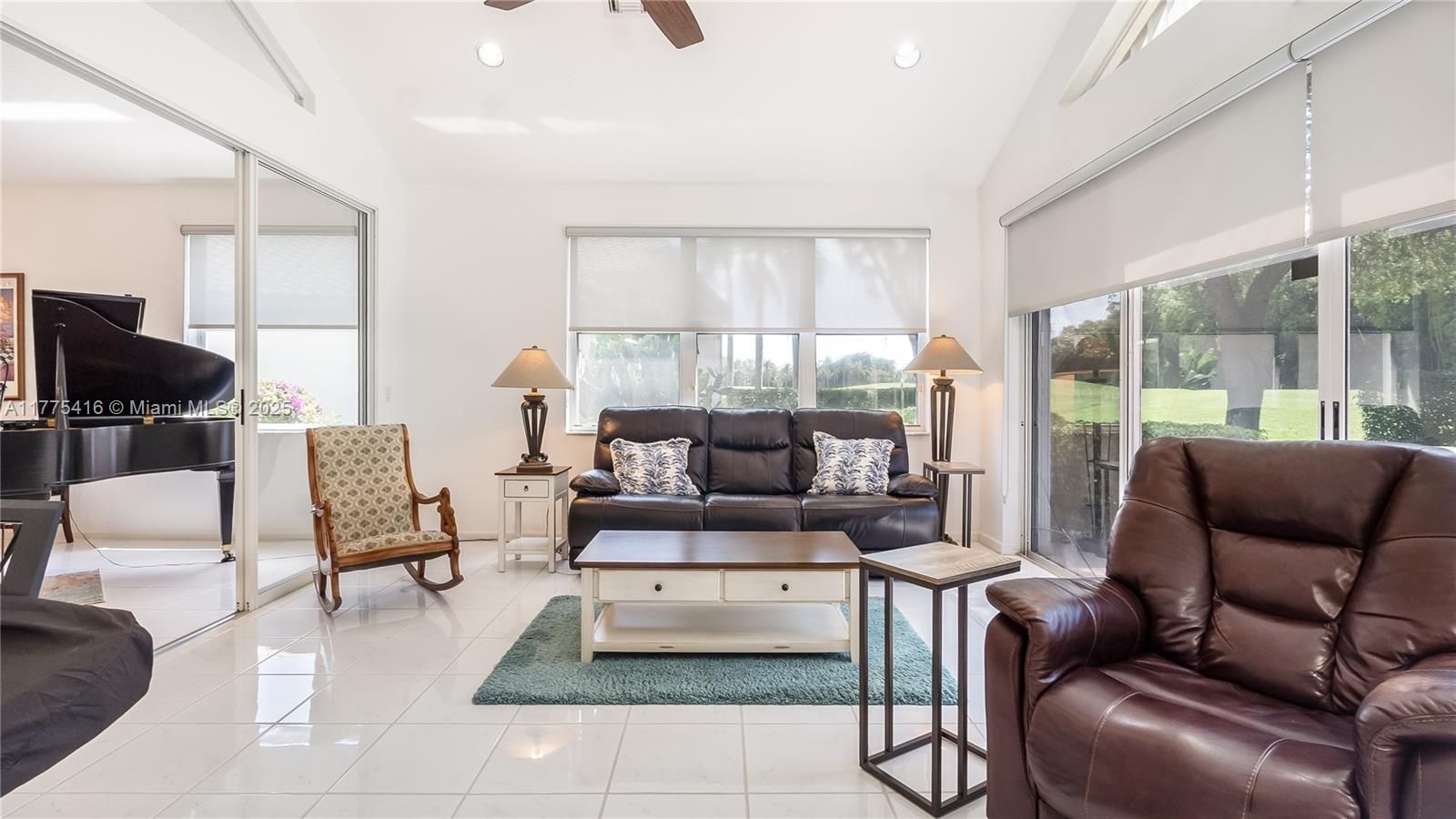This beautifully updated 3 bedroom, 2.5 bath home is situated on the golf course, overlooking the scenic 16th tee. Featuring an expansive open floor plan with soaring vaulted ceilings, this home offers a bright and airy living space.The modern kitchen with 48" gray cabinetry, glass subway tile backsplash, quartz countertops, and stainless steel appliances. The home is equipped with hurricane accordion shutters and generator ready. White tile flooring throughout with laminate flooring in the master bedroom. The oversized master suite features a spacious walk-in closet with custom built-ins, and bathrooms have been fully renovated with sleek, modern finishes. Residents enjoy resort-style amenities, including a clubhouse, swimming pool, hot tub and clubroom. This is a guard gated community.
