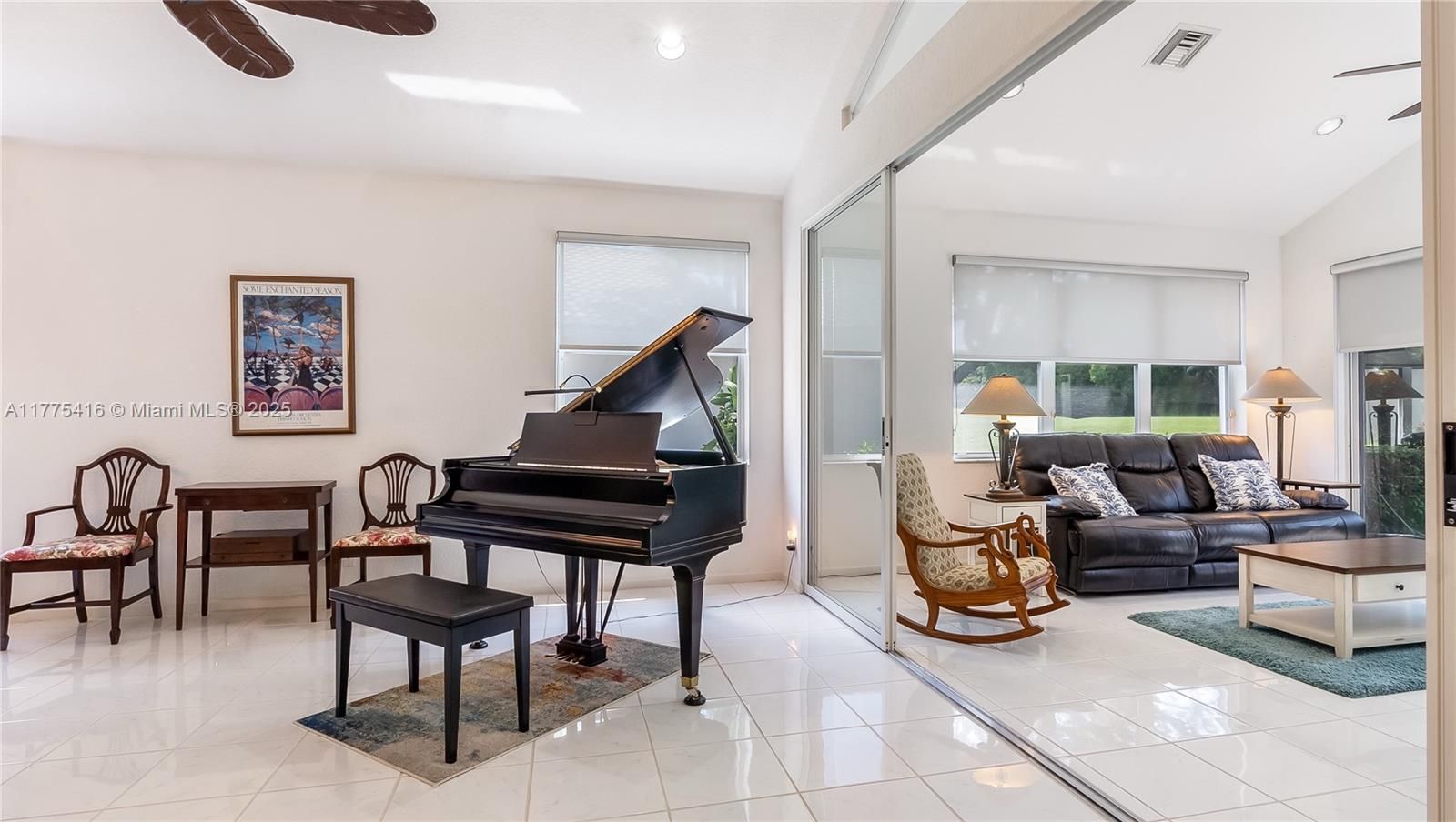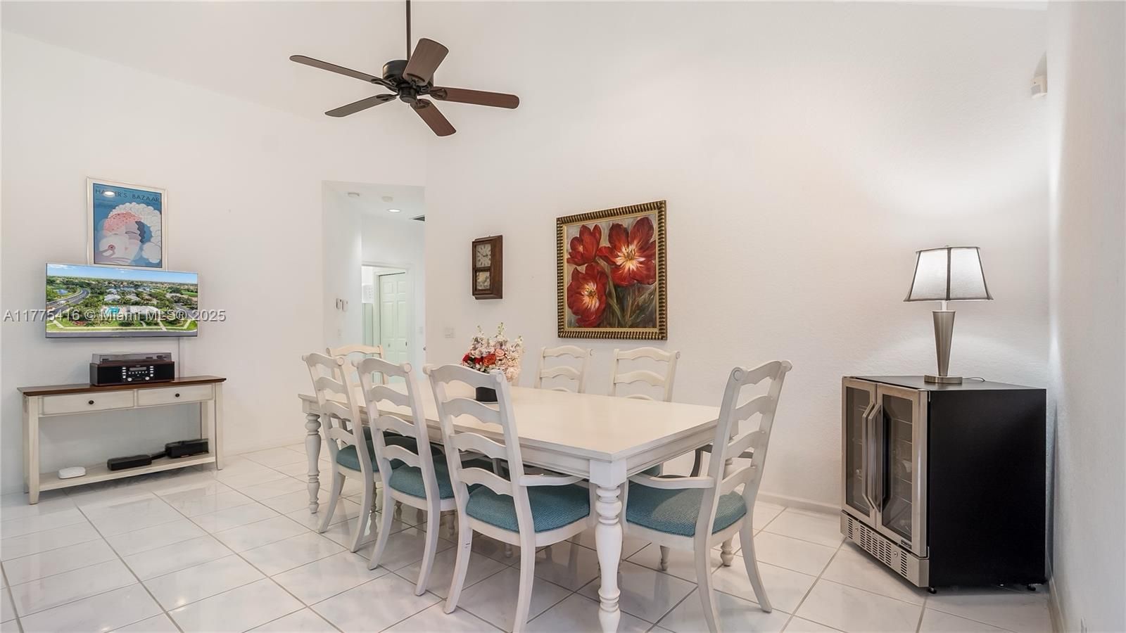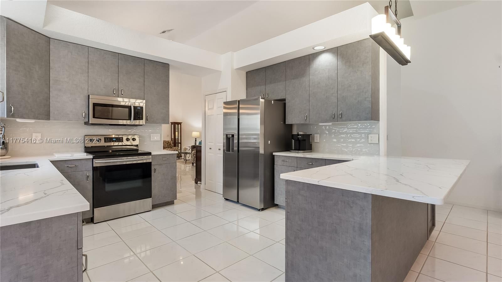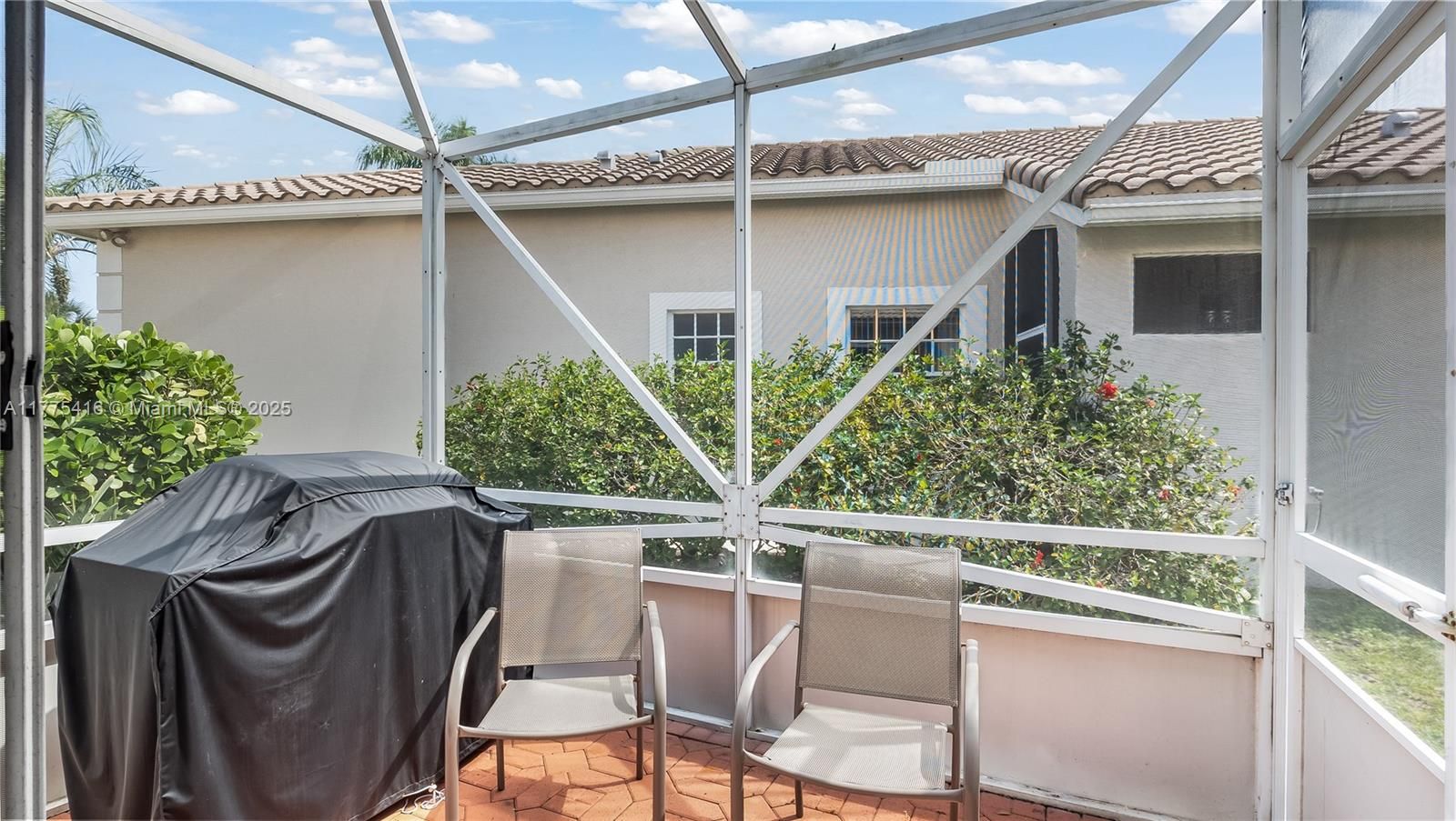 This beautifully updated 3 bedroom, 2.5 bath home is situated on the golf course, overlooking the scenic 16th tee. Featuring an expansive open floor plan with soaring vaulted ceilings, this home offers a bright and airy living space.The modern kitchen with 48" gray cabinetry, glass subway tile backsplash, quartz countertops, and stainless steel appliances. The home is equipped with hurricane accordion shutters and generator ready. White tile flooring throughout with laminate flooring in the master bedroom. The oversized master suite features a spacious walk-in closet with custom built-ins, and bathrooms have been fully renovated with sleek, modern finishes. Residents enjoy resort-style amenities, including a clubhouse, swimming pool, hot tub and clubroom. This is a guard gated community.
