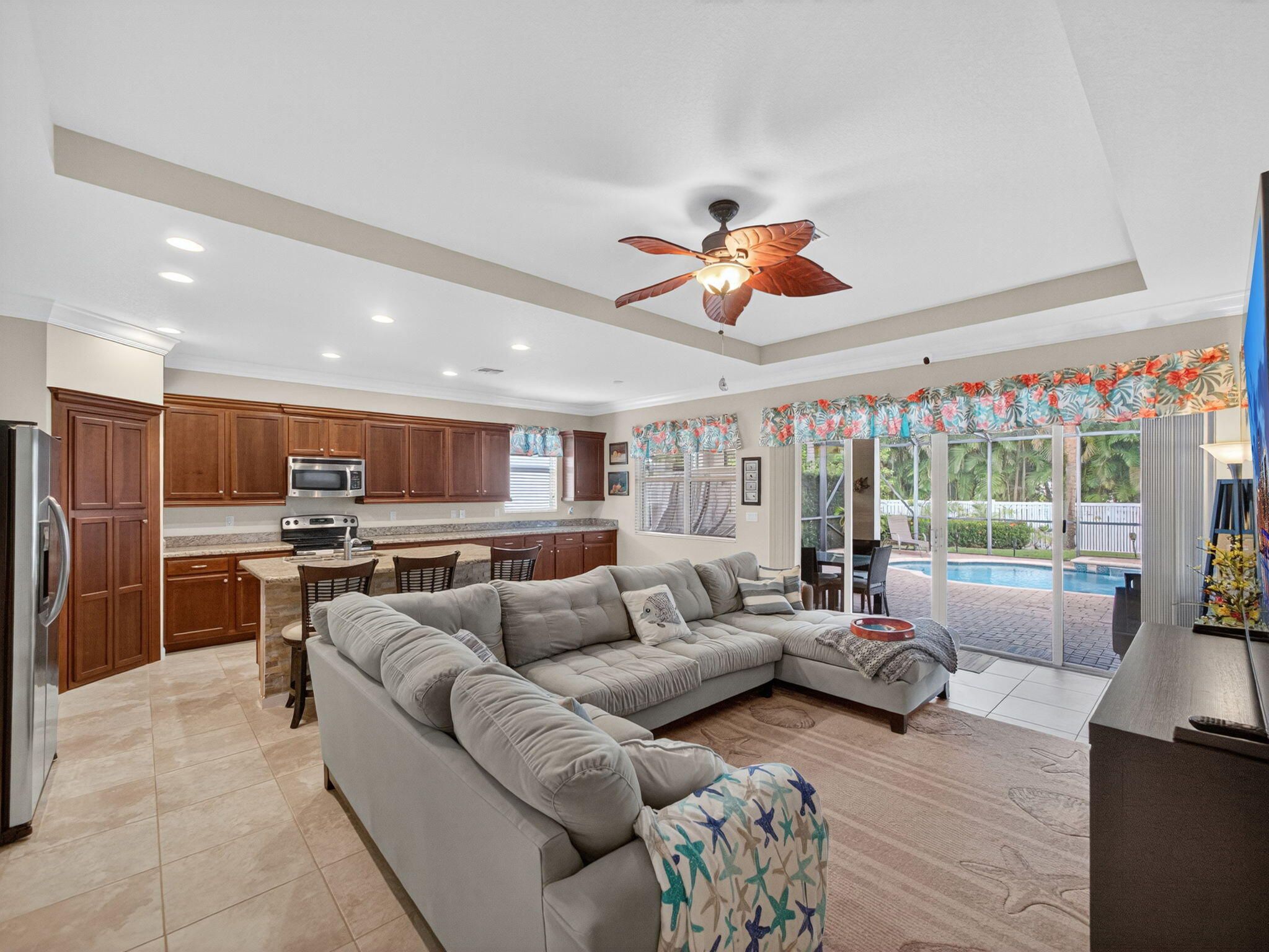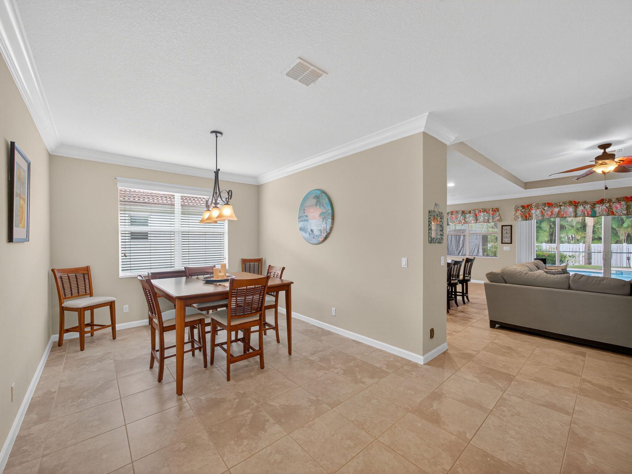 Discover the perfect blend of comfort and style in this CBS-built Coral Reef model, featuring 3 bedrooms plus a den and 2.5 bathrooms. This thoughtfully designed split floor plan offers both privacy and functionality, with the largest main bedroom suite available among first-story homes in the community. Step outside to your private backyard retreat, complete with a heated pool, screen enclosure, and lush privacy landscaping with fencing--ideal for relaxing or entertaining. The oversized covered patio provides ample space for outdoor dining and year-round enjoyment. Inside, the spacious kitchen impresses with abundant cabinetry, perfect for the home chef. Whether you're hosting friends or enjoying a quiet evening in your tranquil oasis, this home delivers exceptional comfort.