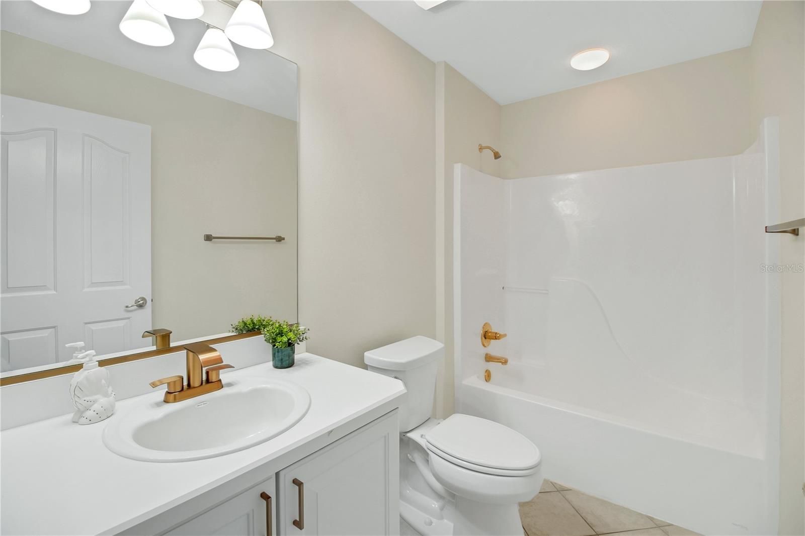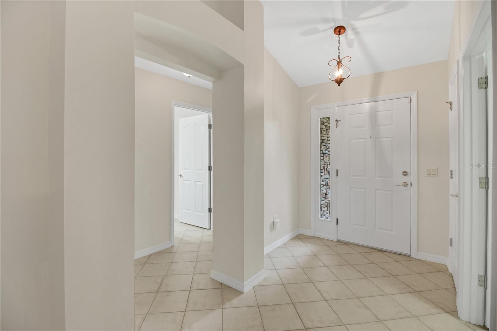 Welcome to this BOND PAID, beautifully updated and freshly painted 3-bedroom, 2-bathroom POOL home featuring a 2-car plus golf cart garage, located in The Villages. Step inside to discover tile and new luxury vinyl plank flooring throughout—no carpet anywhere. The kitchen shines with crisp white cabinetry, new quartz countertops, newer stainless steel gas range, and a new stainless steel microwave and newer stainless steel gas stove and refrigerator, making it both stylish and functional. The spacious primary suite offers a large walk-in closet and an ensuite bathroom with new light fixtures, hardware, and faucet. The oversized laundry room provides ample space for storage and organization. Outdoors, enjoy Florida living at its best in the screened lanai and pool area, perfect for relaxing or entertaining. No rear neighbors adds extra privacy. Additional highlights include a brand new water heater, newly painted driveway, new landscaping, roof replaced in 09/2020, and AC replaced in 2020. Ideally located close to Spanish Springs Square, this home offers convenience, comfort, and an exceptional lifestyle.