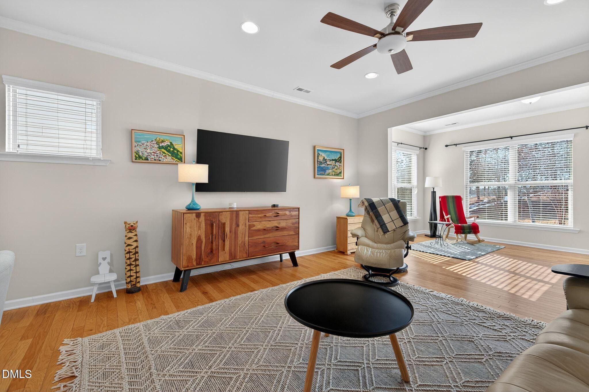 Charming one level, low maintenance home in one of Raleigh's most desirable 55+ communities! This beautiful home features a spacious eat-in kitchen with granite counters, upscale cabinetry and plenty of storage and counter space. Enjoy the pleasure of cooking on the BOSCH range! The spacious open floorplan is filled with natural light! The sunroom off the great room extends the living space and opens to the expansive views of the natural areas behind the house. Enjoy the magnificent sunsets from the patio! Hardwoods thru-out, all appliances convey. The large primary suite features a trey ceiling, dual vanity bath with step in shower and custom closet. The second bedroom, has a custom closet for use as flex space and has an adjacent full bath next to it. This welcoming community offers resort style amenities with indoor/outdoor pools, pickleball, tennis, fitness and hundreds of clubs and events to join! Located in the heart of the Triangle with easy access to shops and services, the airport and top notch medical!