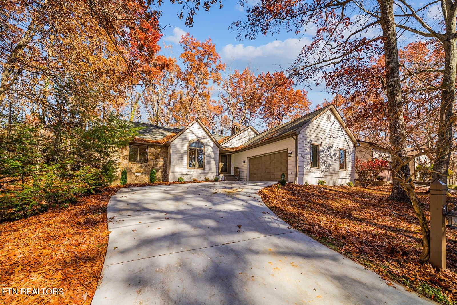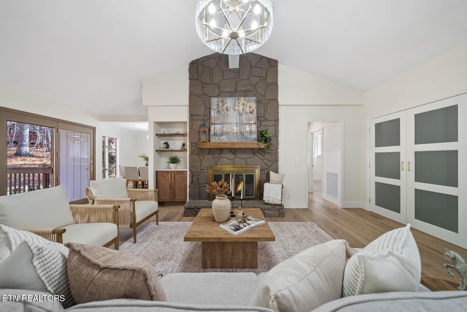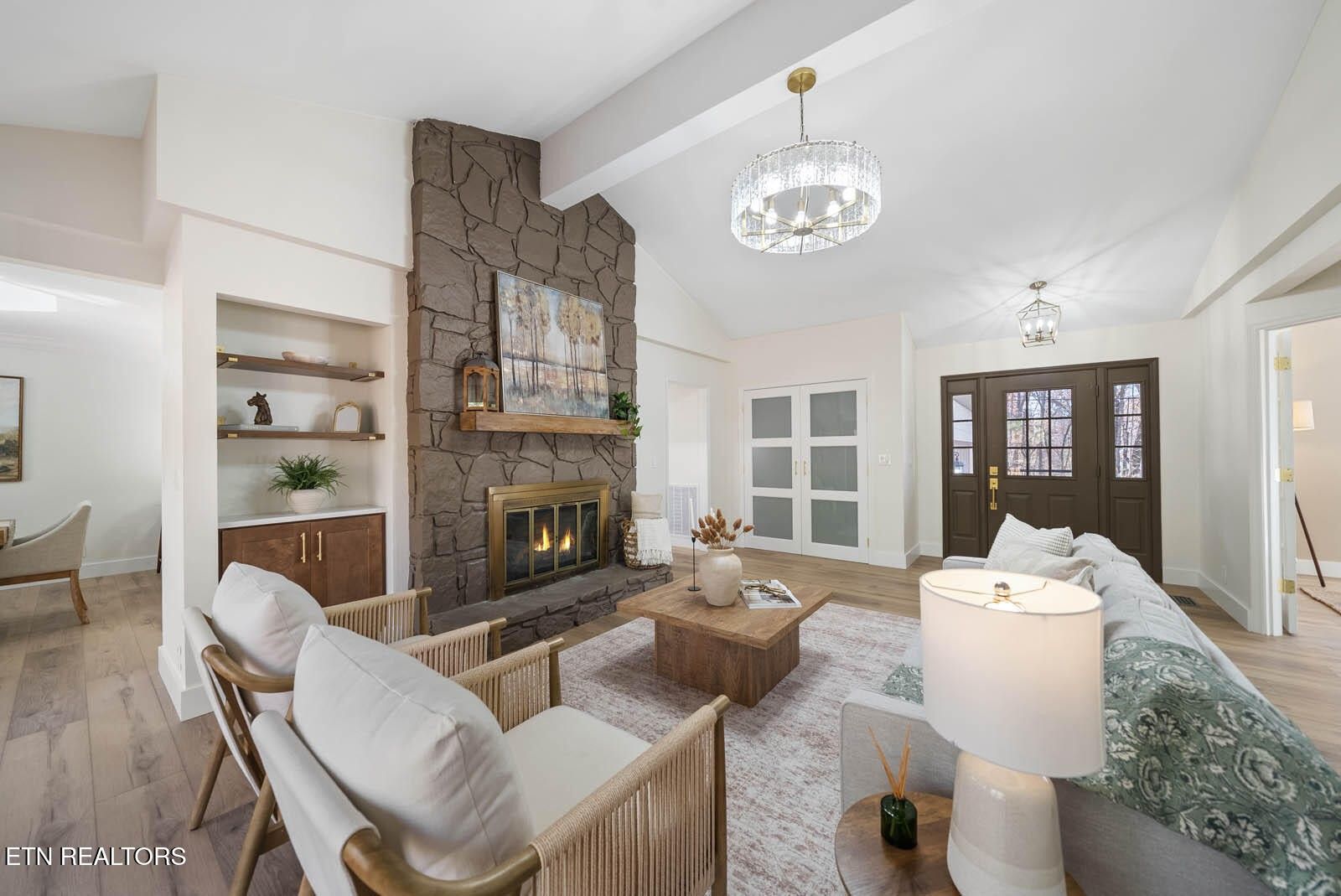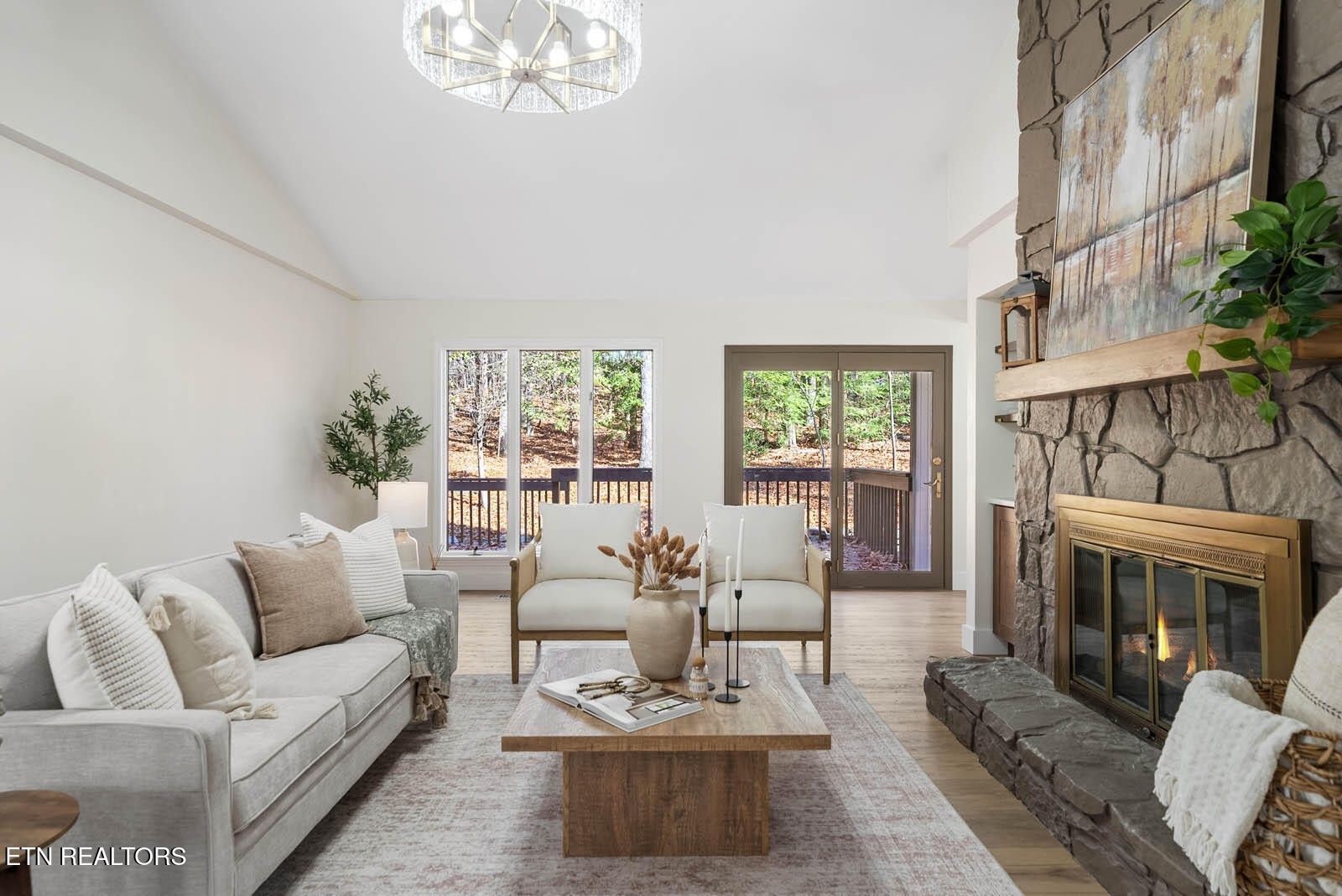 Set on a quarter-acre, this 3-bed, 2-bath home has been meticulously renovated to balance modern function with warm, intentional style. Vaulted ceilings and premium luxury-vinyl plank flooring flow throughout, framed by 6-inch baseboards and designer lighting that elevates every room. A wood-burning fireplace anchors the main living space, while frosted three-panel glass doors along the front wall conceal a custom closet organization system. The kitchen blends beauty with everyday usability—quartz countertops, stainless steel Samsung appliances, custom arched open shelving, a 34-bottle wine fridge, bar seating, and soft-close cabinetry with dimmable lighting to set the mood. The dining area leads effortlessly to the back deck, extending living outdoors. Each bedroom includes custom closet systems, and the serene primary suite delivers spa-like luxury. The bathroom centers on accessibility and elevated materials, featuring a curbless composite-stone shower and a freestanding composite-stone soaking tub, unified by sleek modern fixtures. The secondary bath echoes these finishes for a cohesive feel. An oversized laundry room with a sink offers everyday convenience and direct access to the two-car garage. Smart-home features include a Google Nest thermostat with temperature-control sensor, plus Blink video doorbell and camera—all smartphone compatible. Outdoors, low-maintenance landscaping and gutter guards keep upkeep simple. Renovation and interior design were completed by Randall Construction, LLC, a licensed general contractor. Approximately 1,699 sq. ft. on sewer, with outdoor living extended by the rear deck.