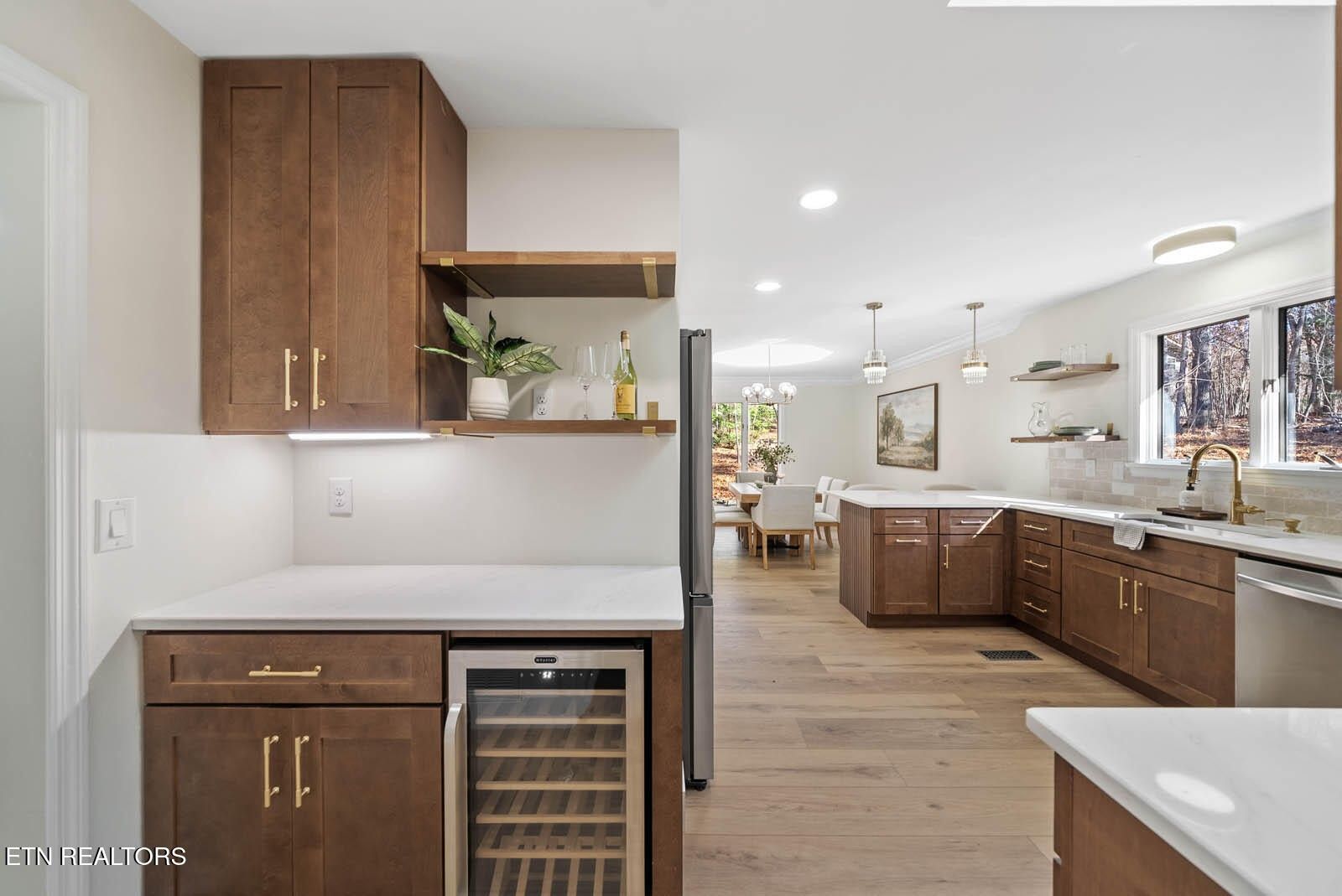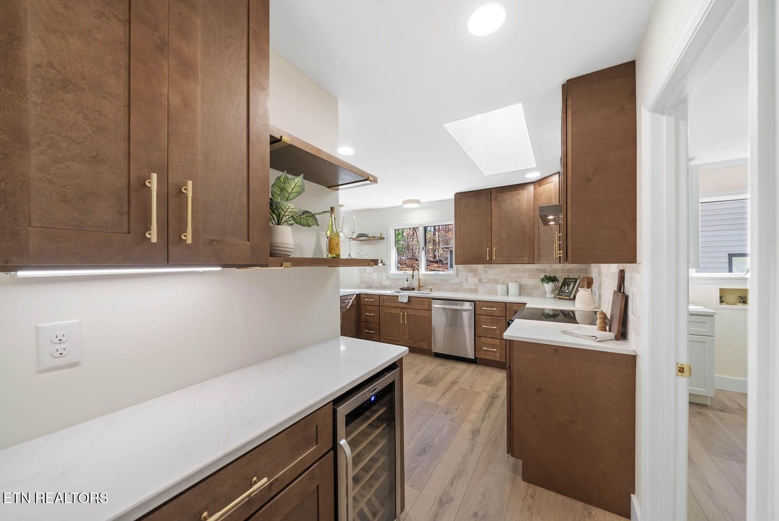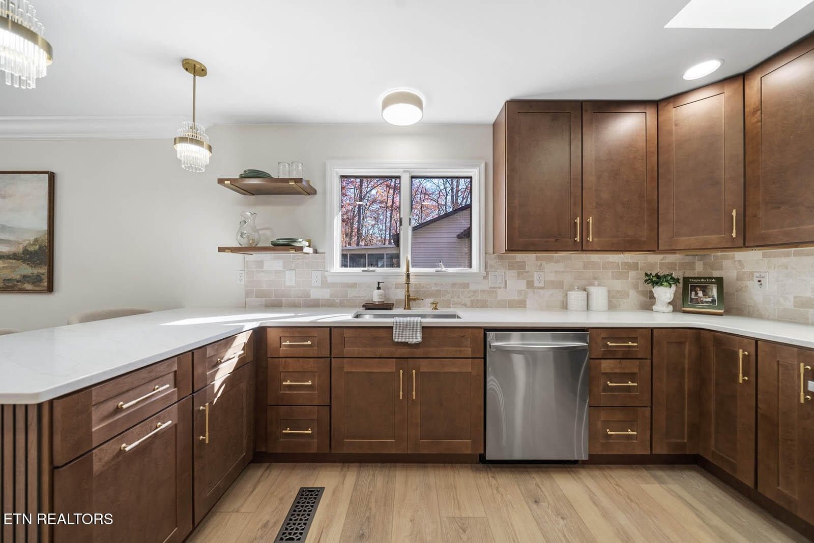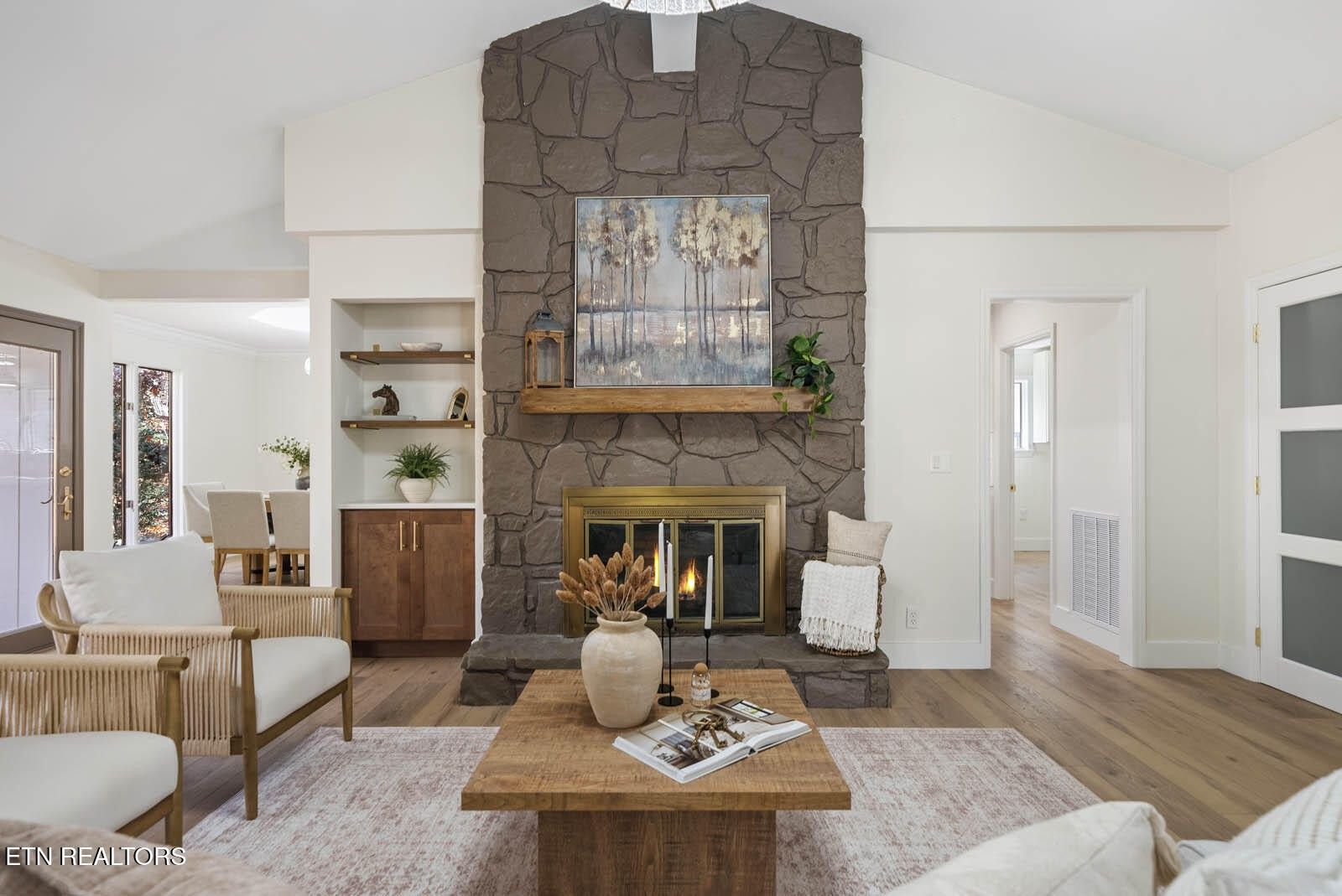 Set on a quarter-acre, this 3-bed, 2-bath home has been meticulously renovated to balance modern function with warm, intentional style. Vaulted ceilings and premium luxury-vinyl plank flooring flow throughout, framed by 6-inch baseboards and designer lighting that elevates every room. A wood-burning fireplace anchors the main living space, while frosted three-panel glass doors along the front wall conceal a custom closet organization system. The kitchen blends beauty with everyday usability—quartz countertops, stainless steel Samsung appliances, custom arched open shelving, a 34-bottle wine fridge, bar seating, and soft-close cabinetry with dimmable lighting to set the mood. The dining area leads effortlessly to the back deck, extending living outdoors. Each bedroom includes custom closet systems, and the serene primary suite delivers spa-like luxury. The bathroom centers on accessibility and elevated materials, featuring a curbless composite-stone shower and a freestanding composite-stone soaking tub, unified by sleek modern fixtures. The secondary bath echoes these finishes for a cohesive feel. An oversized laundry room with a sink offers everyday convenience and direct access to the two-car garage. Smart-home features include a Google Nest thermostat with temperature-control sensor, plus Blink video doorbell and camera—all smartphone compatible. Outdoors, low-maintenance landscaping and gutter guards keep upkeep simple. Renovation and interior design were completed by Randall Construction, LLC, a licensed general contractor. Approximately 1,699 sq. ft. on sewer, with outdoor living extended by the rear deck.