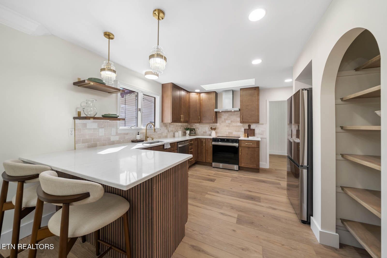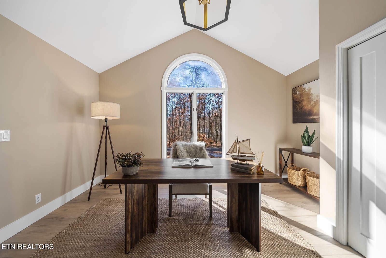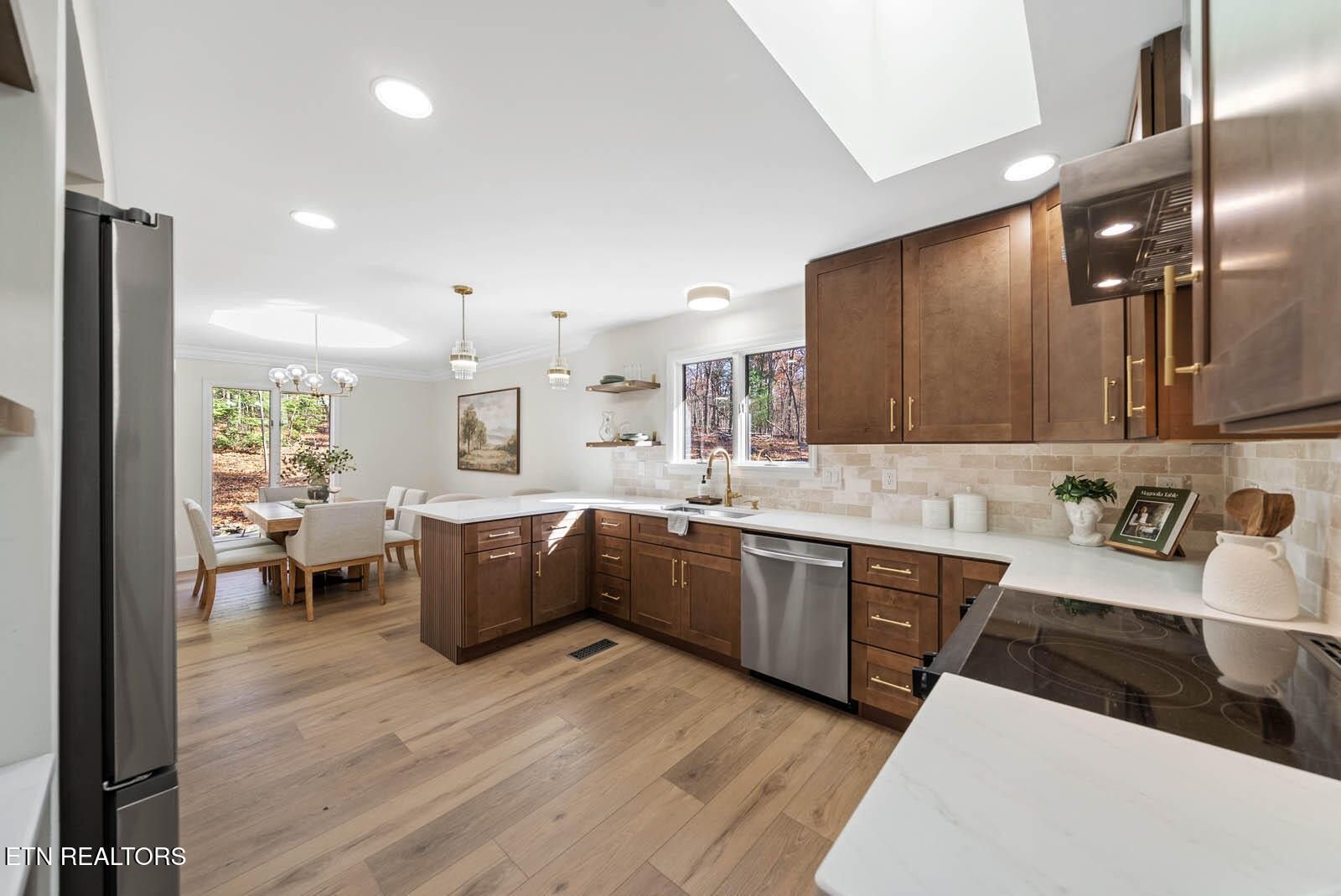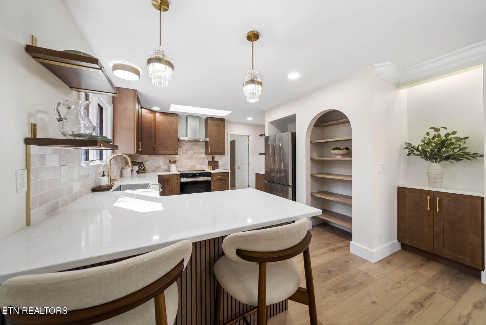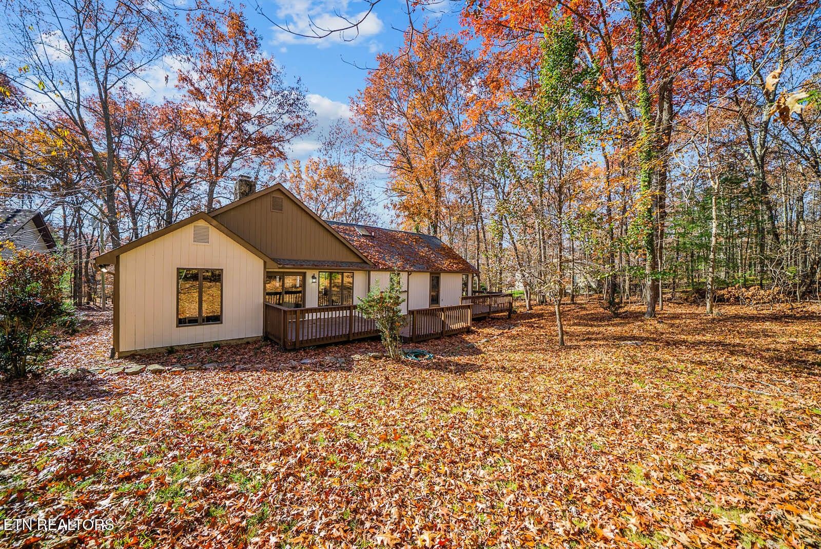 Set on a quarter-acre, this 3-bed, 2-bath home has been meticulously renovated to balance modern function with warm, intentional style. Vaulted ceilings and premium luxury-vinyl plank flooring flow throughout, framed by 6-inch baseboards and designer lighting that elevates every room. A wood-burning fireplace anchors the main living space, while frosted three-panel glass doors along the front wall conceal a custom closet organization system. The kitchen blends beauty with everyday usability—quartz countertops, stainless steel Samsung appliances, custom arched open shelving, a 34-bottle wine fridge, bar seating, and soft-close cabinetry with dimmable lighting to set the mood. The dining area leads effortlessly to the back deck, extending living outdoors. Each bedroom includes custom closet systems, and the serene primary suite delivers spa-like luxury. The bathroom centers on accessibility and elevated materials, featuring a curbless composite-stone shower and a freestanding composite-stone soaking tub, unified by sleek modern fixtures. The secondary bath echoes these finishes for a cohesive feel. An oversized laundry room with a sink offers everyday convenience and direct access to the two-car garage. Smart-home features include a Google Nest thermostat with temperature-control sensor, plus Blink video doorbell and camera—all smartphone compatible. Outdoors, low-maintenance landscaping and gutter guards keep upkeep simple. Renovation and interior design were completed by Randall Construction, LLC, a licensed general contractor. Approximately 1,699 sq. ft. on sewer, with outdoor living extended by the rear deck.