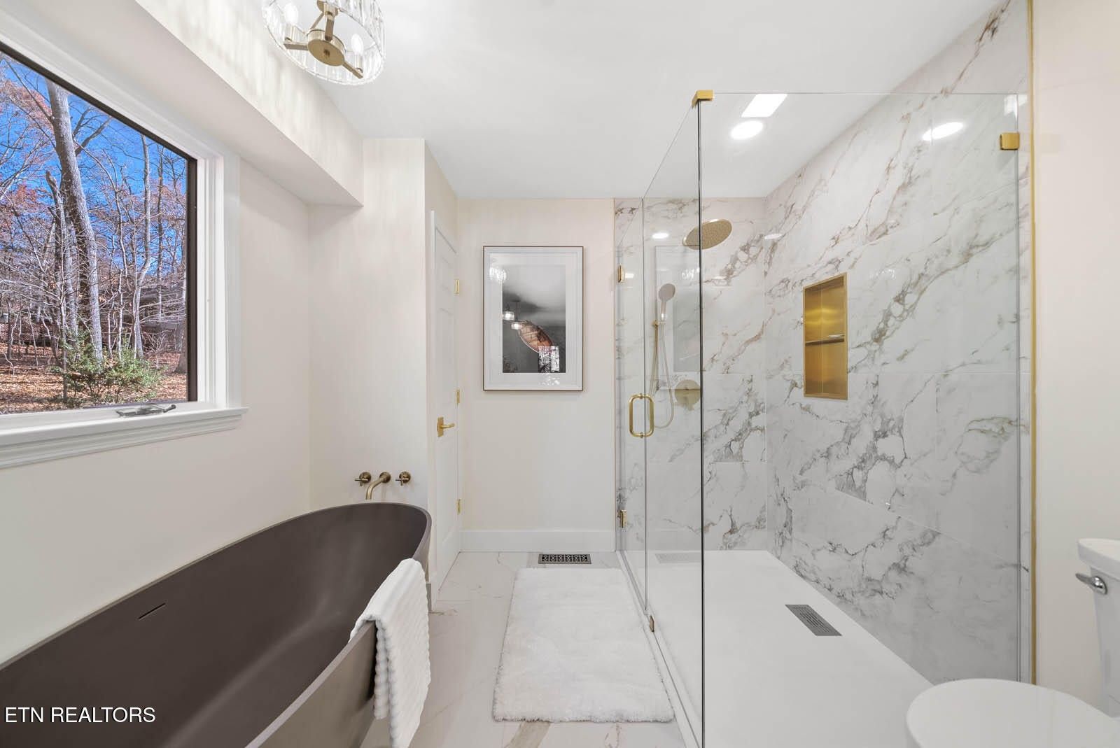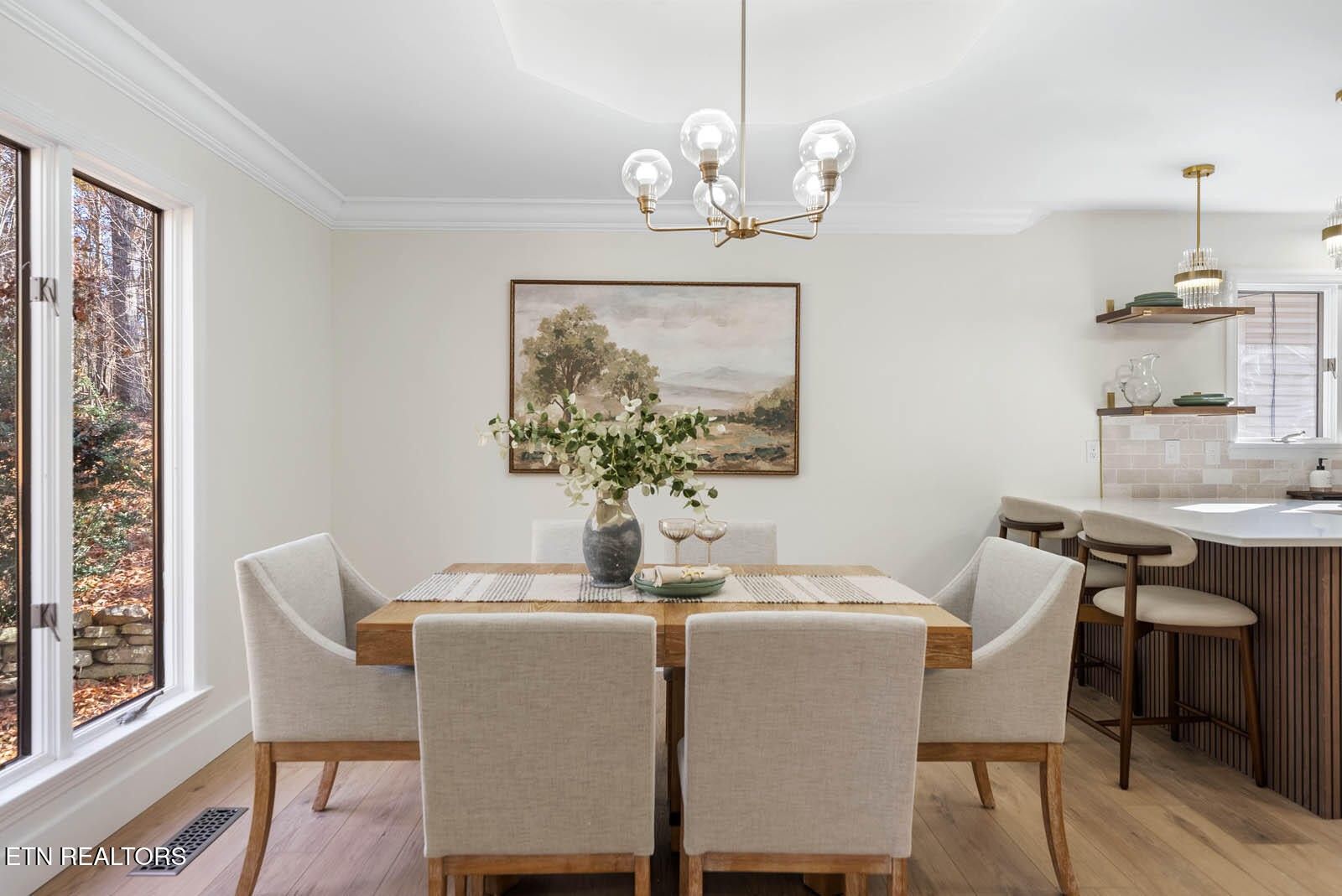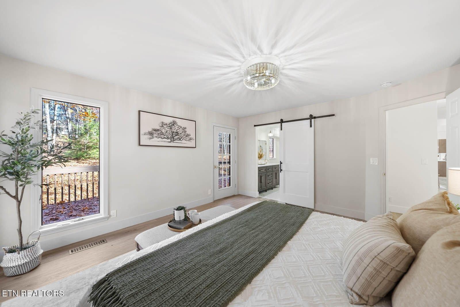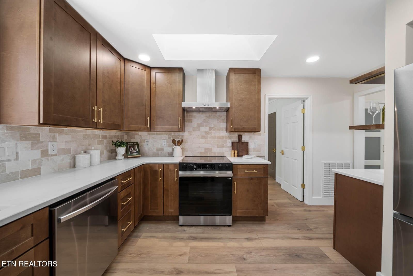 Set on a quarter-acre, this 3-bed, 2-bath home has been meticulously renovated to balance modern function with warm, intentional style. Vaulted ceilings and premium luxury-vinyl plank flooring flow throughout, framed by 6-inch baseboards and designer lighting that elevates every room. A wood-burning fireplace anchors the main living space, while frosted three-panel glass doors along the front wall conceal a custom closet organization system. The kitchen blends beauty with everyday usability—quartz countertops, stainless steel Samsung appliances, custom arched open shelving, a 34-bottle wine fridge, bar seating, and soft-close cabinetry with dimmable lighting to set the mood. The dining area leads effortlessly to the back deck, extending living outdoors. Each bedroom includes custom closet systems, and the serene primary suite delivers spa-like luxury. The bathroom centers on accessibility and elevated materials, featuring a curbless composite-stone shower and a freestanding composite-stone soaking tub, unified by sleek modern fixtures. The secondary bath echoes these finishes for a cohesive feel. An oversized laundry room with a sink offers everyday convenience and direct access to the two-car garage. Smart-home features include a Google Nest thermostat with temperature-control sensor, plus Blink video doorbell and camera—all smartphone compatible. Outdoors, low-maintenance landscaping and gutter guards keep upkeep simple. Renovation and interior design were completed by Randall Construction, LLC, a licensed general contractor. Approximately 1,699 sq. ft. on sewer, with outdoor living extended by the rear deck.