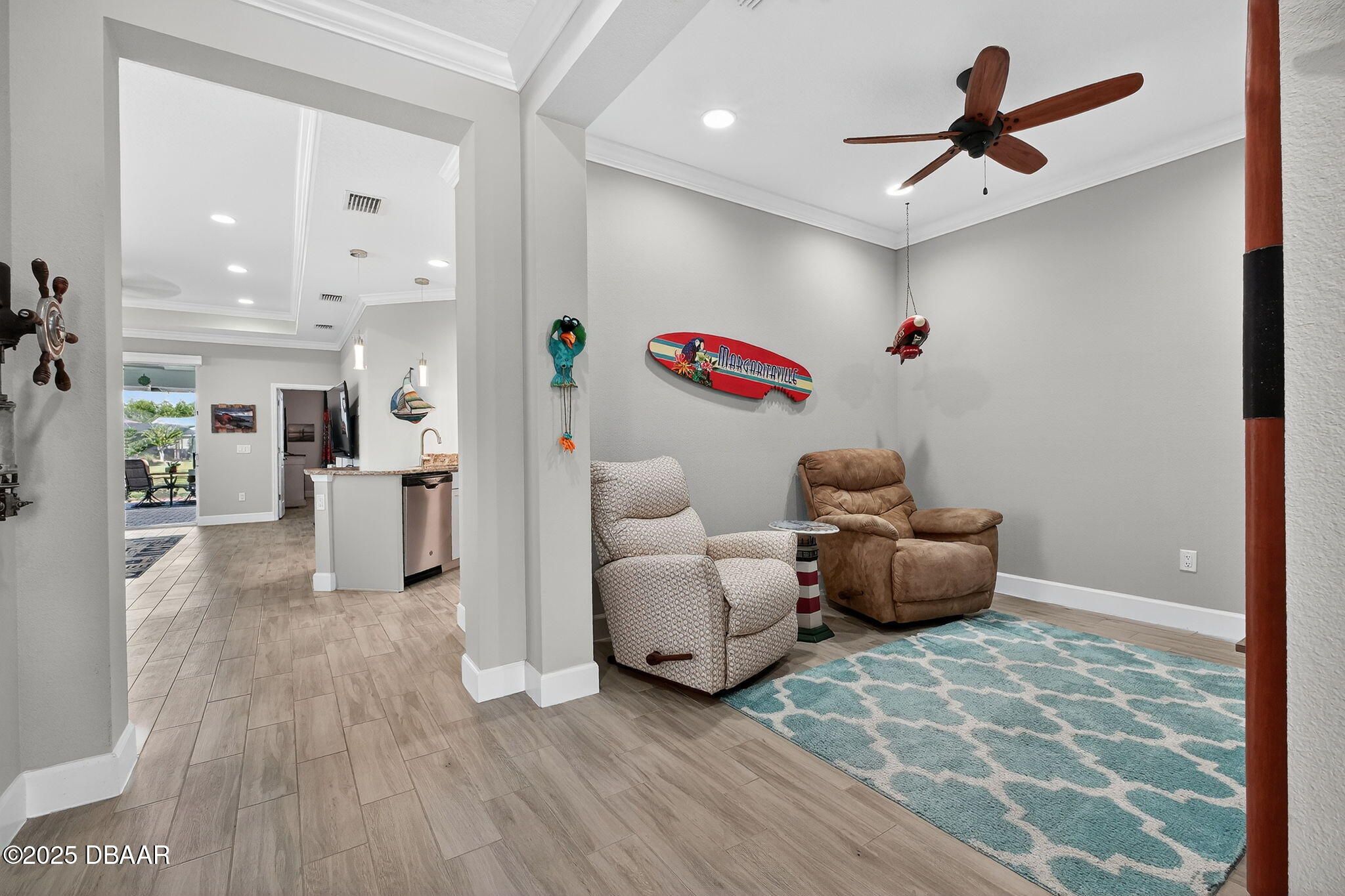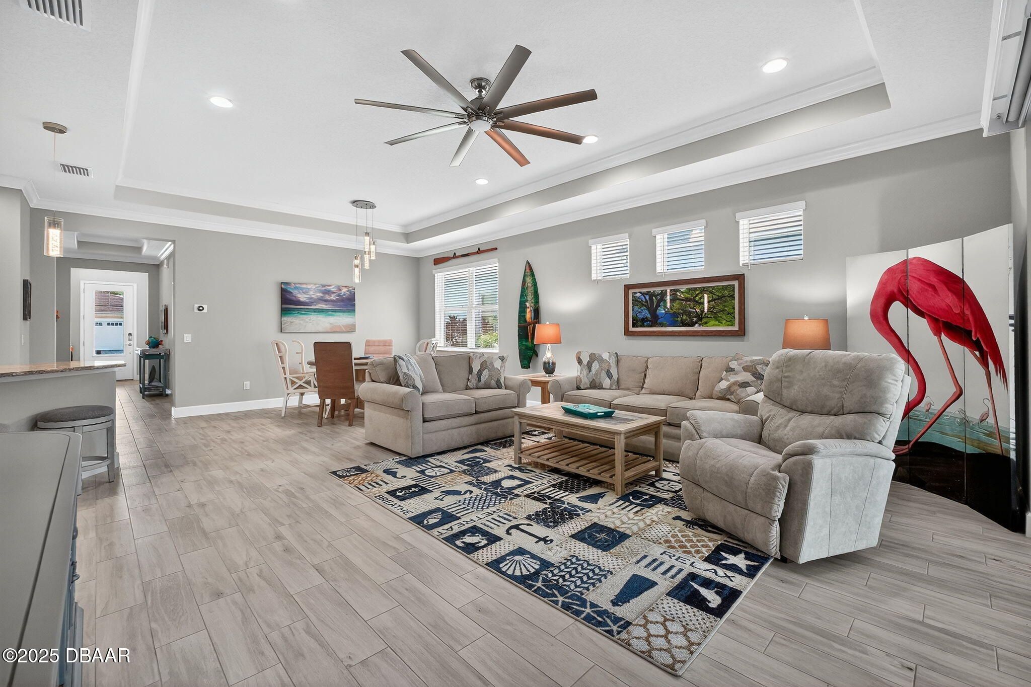 PANORAMIC WATER VIEW | LARGEST VILLA FLOOR PLAN | UNMATCHED FLEXIBILITY Experience one of the most breathtaking, unobstructed water views in Latitude Margaritaville from this exceptional villa. This is the largest villa floor plan in the community, offering 1,862 square feet of beautifully designed living space. Savor spectacular sunsets over the water from your own private sanctuary every evening. This superior layout features three true bedrooms plus a dedicated flex room. This configuration provides four separate spaces in addition to the great room, delivering a level of versatility and adaptability that surpasses even many single-family homes in the community. The residence features an expansive, Extended Lanai with Ultra View designed for relaxed luxury. The lanai boasts a Panoramic Screened-in Enclosure, remote-controlled colored lighting, a custom garden planter, and extra outlets. Inside, the sun-drenched Great Room is framed by a perfect view, controlled by wireless remote blinds on the sliders. Your new home has been meticulously maintained and upgraded for comfort and efficiency, featuring: ~ Kitchen & Bath: Gourmet Kitchen with designer under and above cabinet lights. Primary Suite features custom barn doors for the closet and a built-in medicine cabinet in the en-suite bath. ~ Utility & Low-Maintenance: Highly efficient HVAC system with a permanent, rinse-monthly filter, a low-maintenance HVAC pump, and an extra AC capacitor. It also includes a whole-house surge protector in the circuit breaker cabinet, and full gutters down the side of the home. ~ Highly Upgraded Garage: Extra- insulated garage with a vent fan, full wall of storage cabinets, a utility sink, dedicated water spigot under the circuit breaker box for easy car washing, and a separate golf cart outlet. Extra insulation in the garage attic and on the garage door provides superior climate control. ~ Security & Convenience: Includes a Blink front doorbell camera, a convenient magnetic door latch on the laundry room door, and a motion-detection light switch in the laundry room. As part of the Latitude Margaritaville lifestyle, residents enjoy access to world-class amenities including resort-style pools, a state-of-the-art fitness center, pickleball, dining, and the private Oceanfront Beach Club with complimentary shuttle service. This exceptional villa in the world famous 55+ Latitude Margaritaville, offering premier views and the most versatile floor plan available, combines refined finishes with practical, high-value upgrades. Don't miss out on this show-stopper: schedule your private tour today!