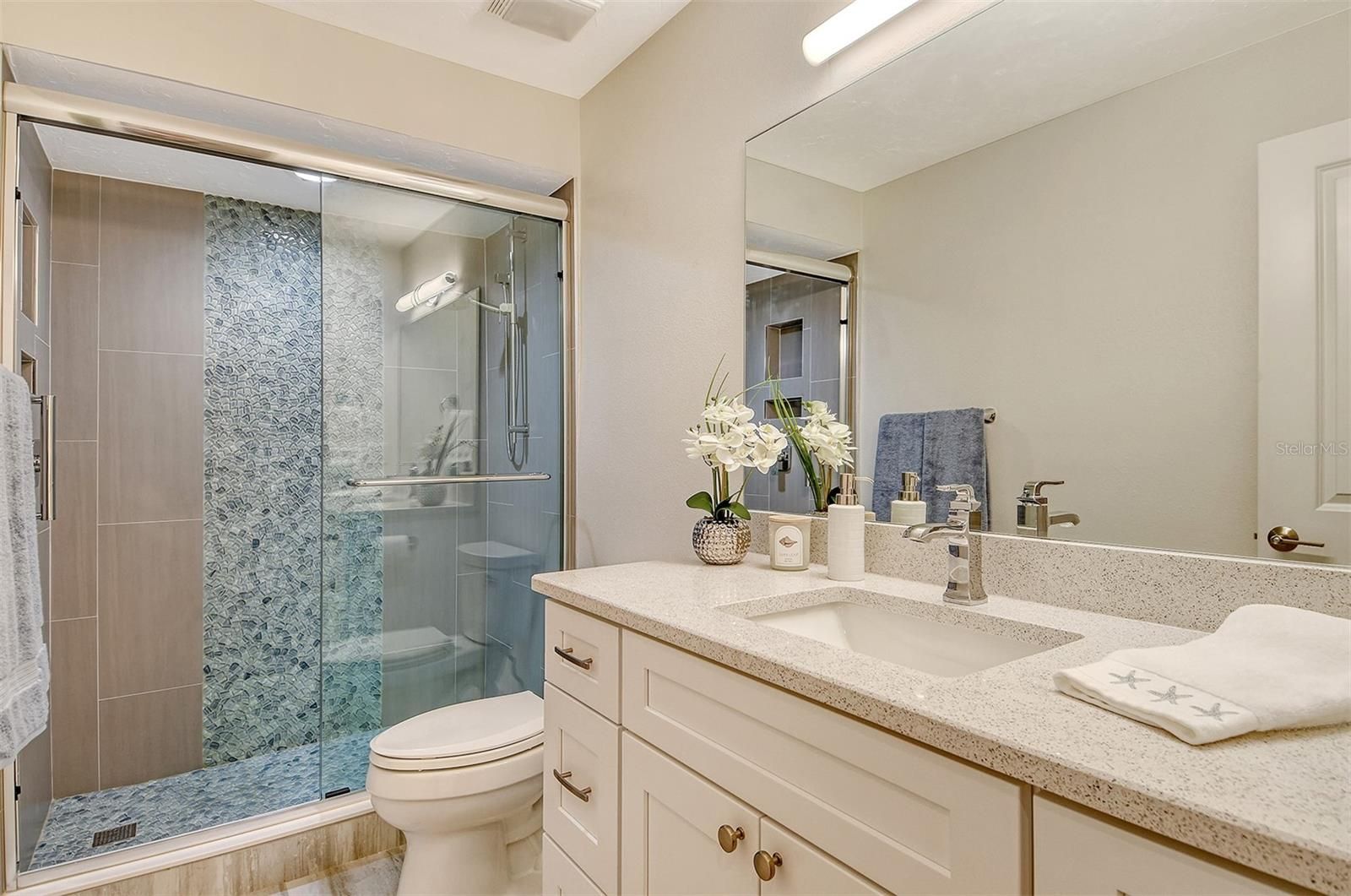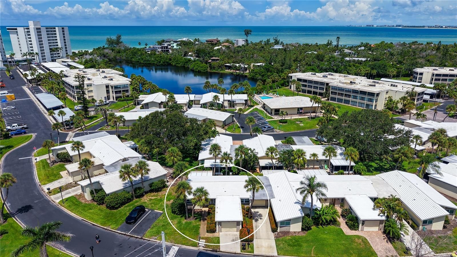 One or more photo(s) has been virtually staged. LOVELY REMODELED VILLA JUST STEPS FROM THE SAND! This 2 bed/2 bath villa in the premiere GULF FRONT property of Whispering Sands is the perfect island getaway. Remodeled in 2025, this villa features all NEW luxury vinyl plank flooring, paint, baseboards, trim, molding, and all new interior doors. The NEW galley kitchen is a true highlight, offering stylish soft close cabinetry, granite countertops, stainless Whirlpool appliances, a side by side fridge with icemaker/dispenser, stainless farmhouse sink, and recessed and under-cabinet lighting. Both bathrooms have been refreshed with new granite counters, cabinets, vanities, and fixtures for a clean, contemporary feel. You’ll enjoy the ease of indoor-outdoor living with a tiled screened lanai – perfect for your morning coffee or evening relaxation. It could be further enclosed with windows or sliders and turned into a sunroom. This villa also features a nice skip trowel ceiling finish and plantation shutters. One car garage with NEW 2025 full sized Maytag WASHER & DRYER. NEW 2025 VILLA ROOF. 2025 HVAC system and 2025 water heater. Ideally located just around the corner from Whispering Sands’ two sparkling heated pools, clubhouse (currently in the beginning stages of being remodeled and which will include a fitness center), NEW beachside Tiki Hut, shuffleboard, and 800' of your own private beach on the Gulf — perfect for enjoying Siesta Key’s world famous quartz sand and spectacular sunsets! When you're not luxuriating in the pool or going for a dip in the Gulf, step out of your front door and walk to shopping and dinner! Whispering Sands is situated right around the corner from the colorful boutiques and fine restaurants of Siesta Key Village. Embrace the island lifestyle! Whether as a year-round residence or a vacation retreat, this maintenance free Gulfside villa combines ease, style, comfort - and a great investment - in one of Siesta Key’s finest Gulf front properties.