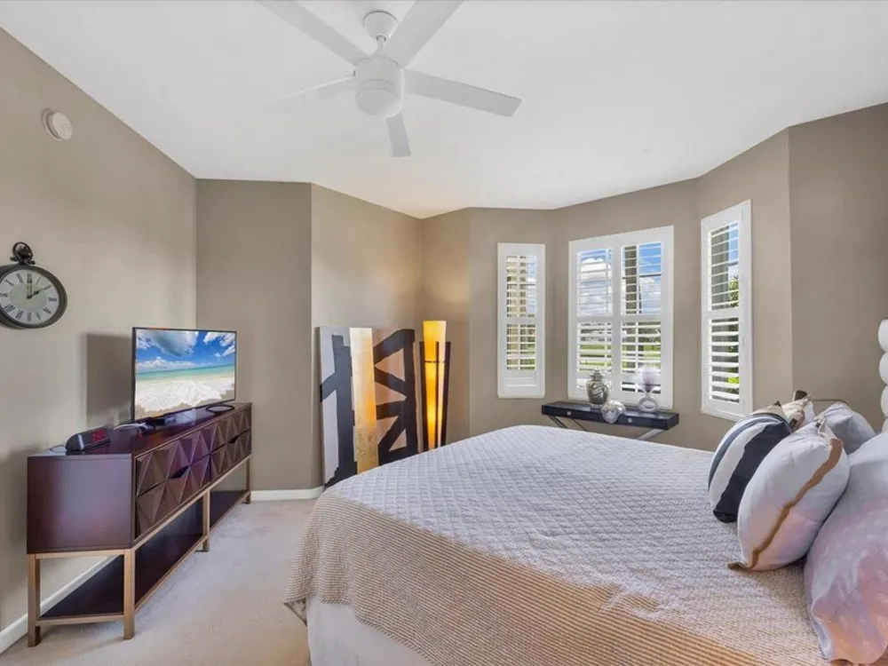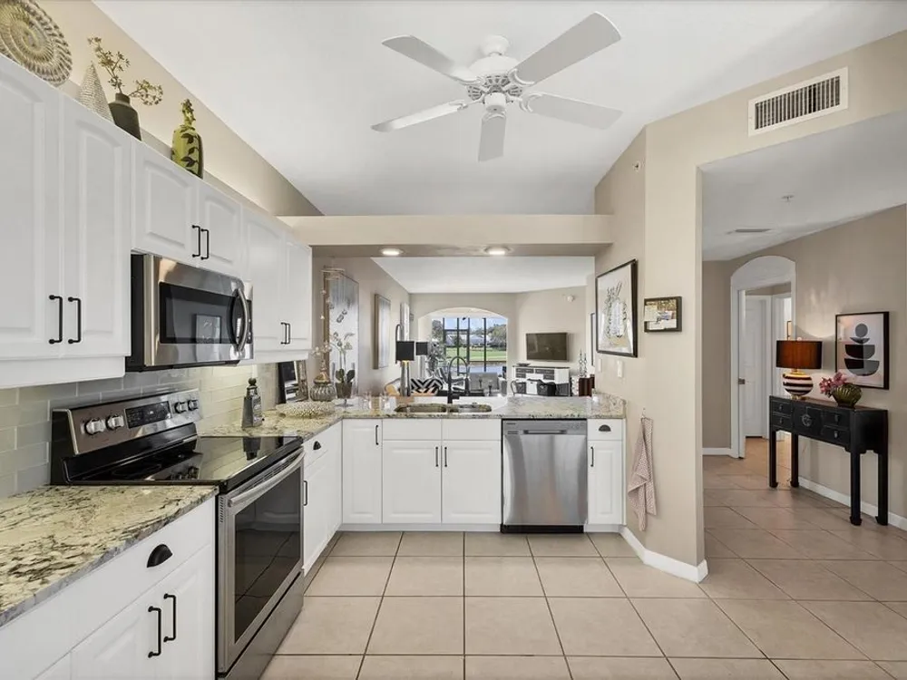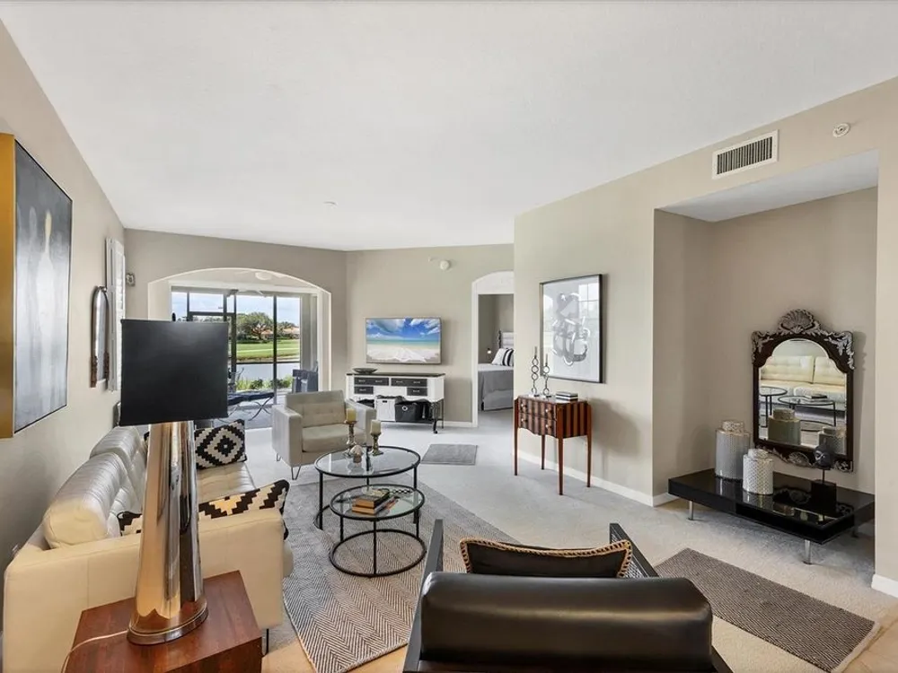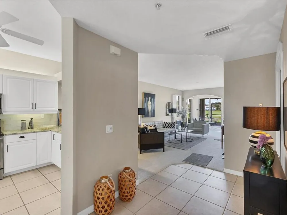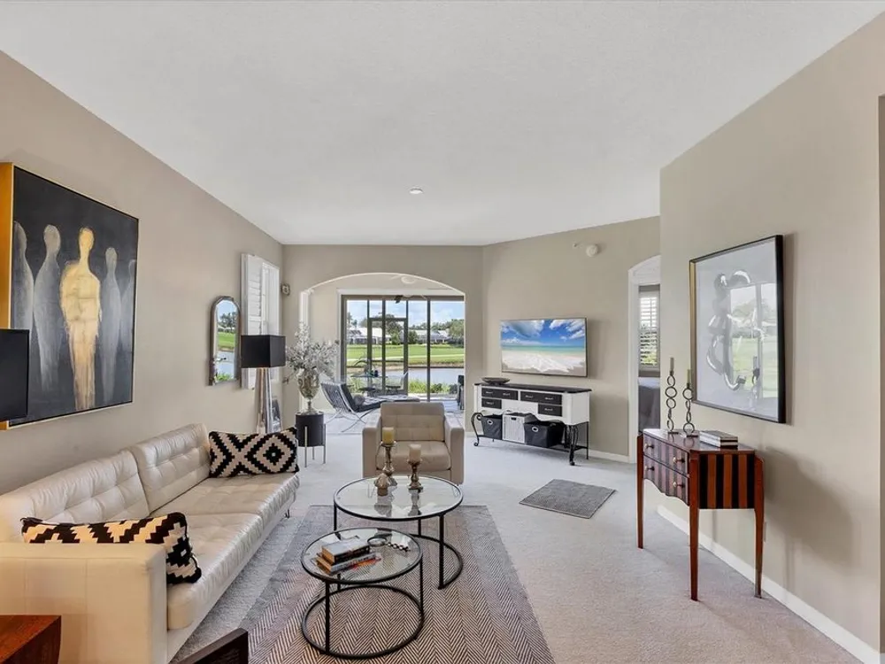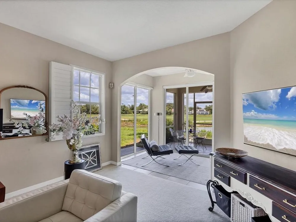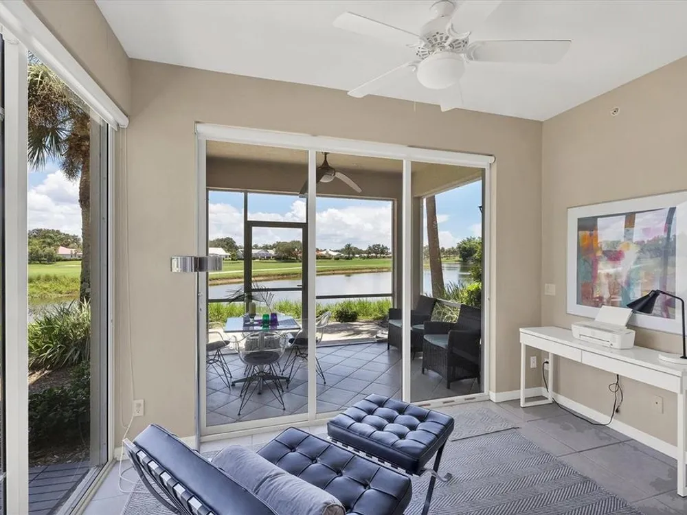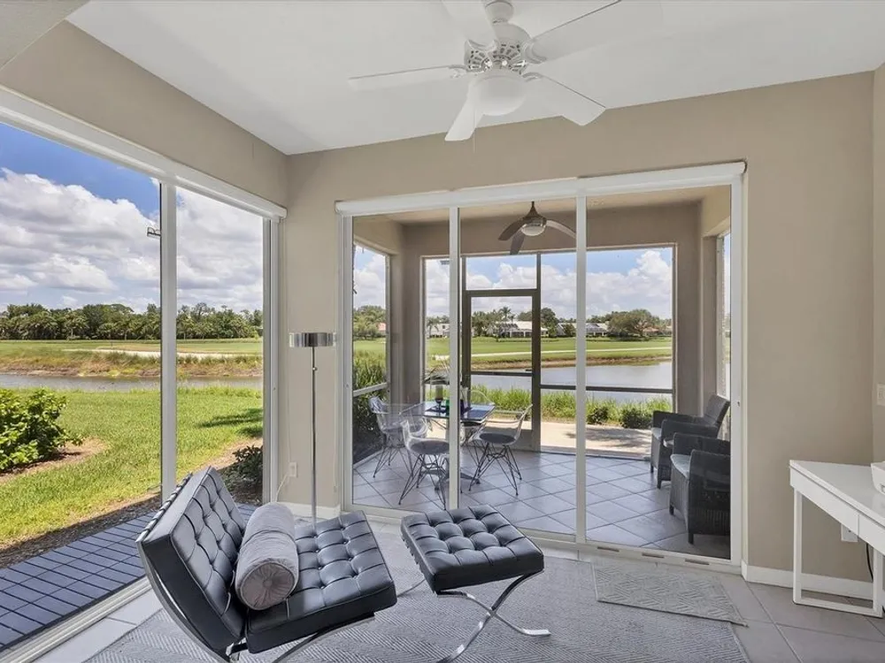 Live in style with unmatched views! Enter into elegance with this beautifully furnished and tastefully decorated ground-floor condominium, offering panoramic views of the shimmering lake and lush golf course. In the sought-after Fairway Glen at St. Andrews Park within The Plantation Golf & Country Club, this spacious residence combines comfort, style, and a spectacular setting. Inside, you'll find a large kitchen with stainless steel appliances and granite countertops and an inviting dining area, a bright and airy living room, and an adjoining bonus space, ideal as a cozy reading nook or a den for work or hobbies, all while enjoying the breathtaking scenery. Go outside to the screened-in porch and unwind with your morning coffee or evening drink as you soak in the peaceful views. This amazing and immaculate and hardly lived in property features two generously sized bedrooms and two full baths, offering privacy and flexibility. A one-car garage, an additional designated parking spot plus guest parking provides convenience and practicality. Air conditioning is only 2 years old. Meet your friends and neighbors at one of the pools or dine at the elegant clubhouse's regarded restaurant. For more activities, you can enjoy optional memberships to the prestigious Plantation Golf & Country Club, which offers access to golf, tennis, pickleball, bocce ball and a state-of-the-art fitness center with personal trainers. Ideally near shopping, dining and just minutes from Venice's pristine sandy beaches, this is the ideal home for seasonal or year-round living. Also, a short ride to the vibrant downtown district with its quaint shops, cafes and restaurants.