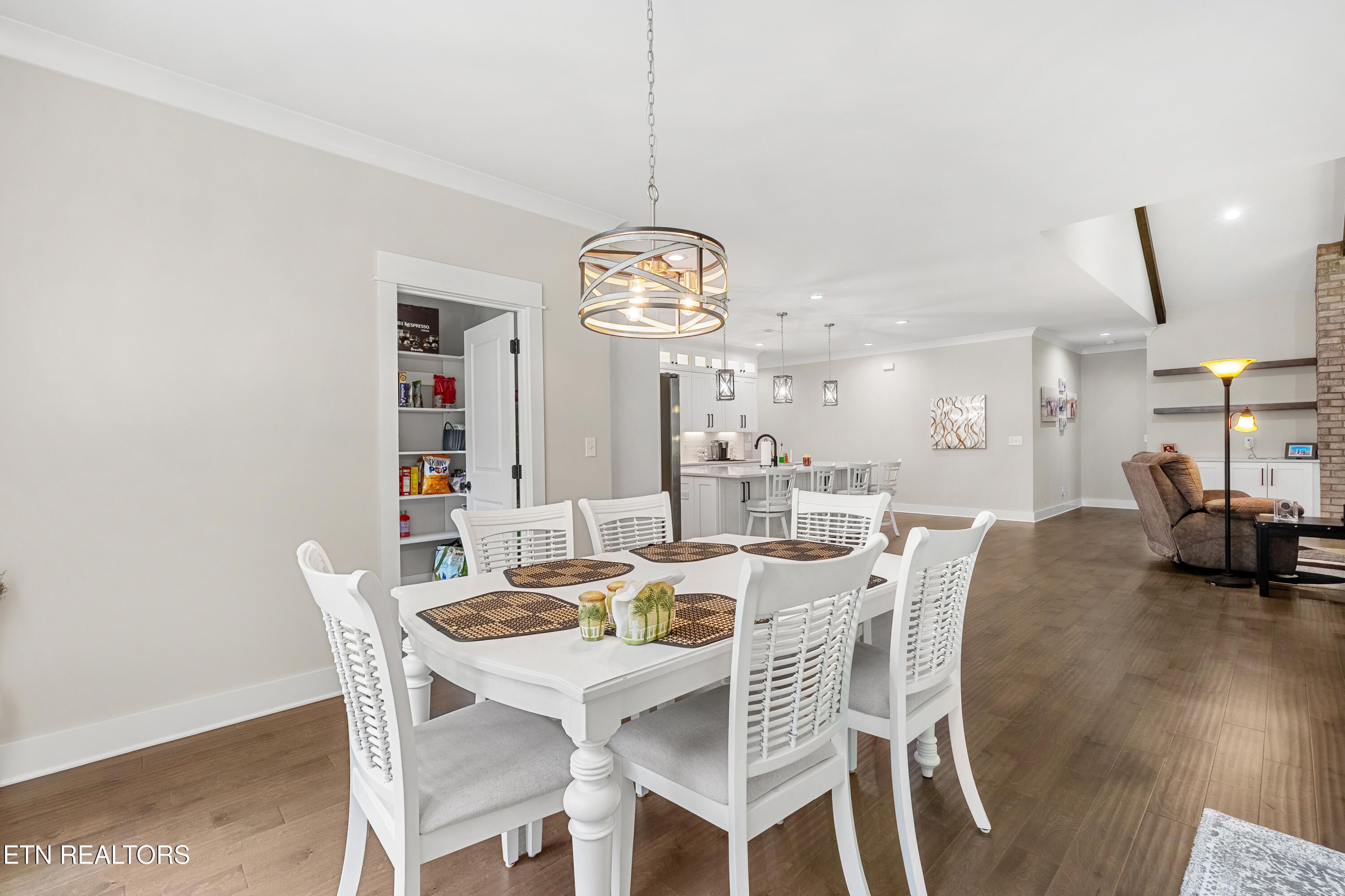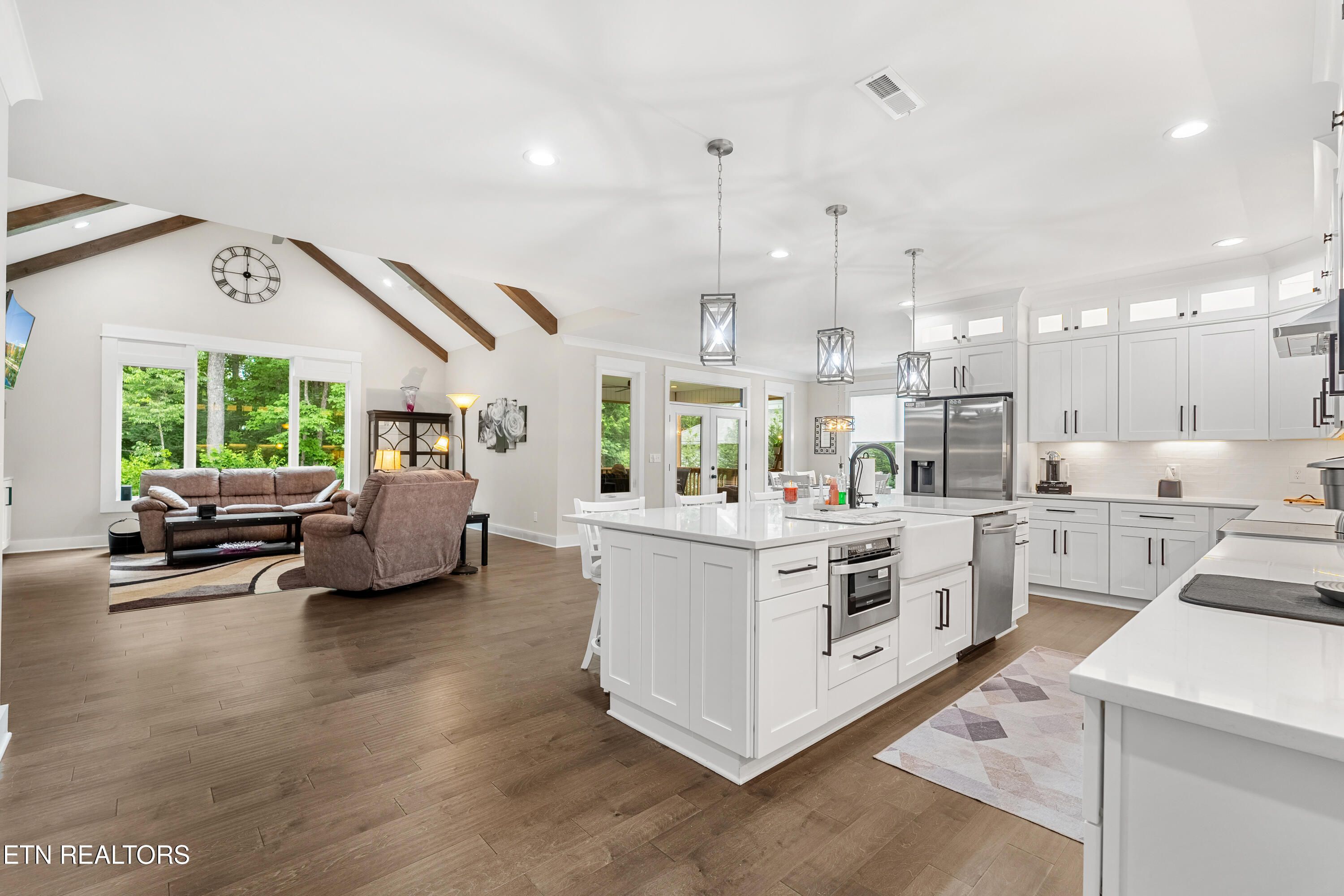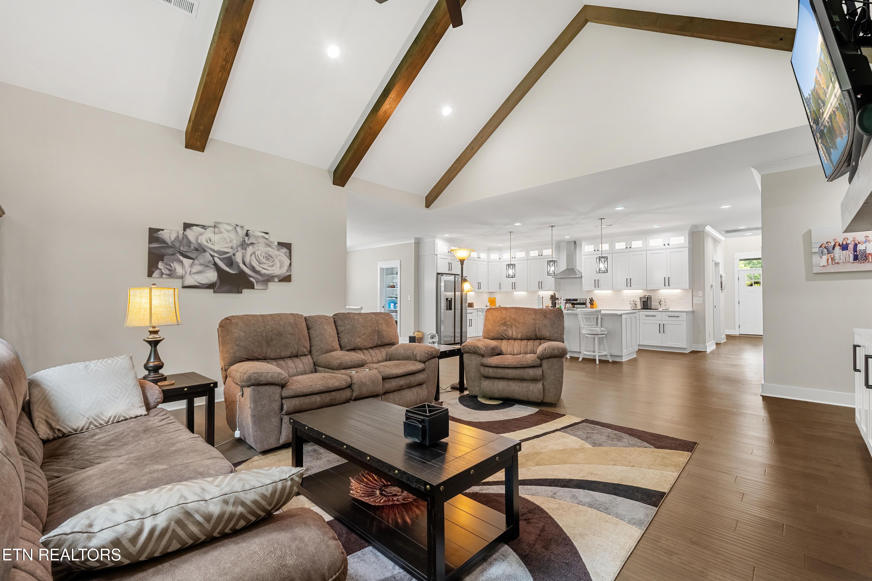 Come and Enjoy all the Recreational Amenities Tellico Village Has to Offer! This beautiful Rancher has a thoughtfully designed open concept floor plan with 3BR, 2BA. High end finishes throughout. Hardwood flooring, crown molding, large open living room with vaulted ceiling complete with wood beams. A brick fireplace is the focal point of this room. A very spacious Chef's Kitchen with custom cabinets with dramatic down lighting, very large quartz Island, and quartz countertop, stainless steel appliances, and a large walk-in pantry. A lovely dining area is adjacent to the kitchen which gives you ample room for a lovely dining table and chairs. The large primary suite with trey ceilings, walk-in closet, primary bathroom complete with dual sinks, quartz countertops, glass walk-in shower with luxury tile, shower niche, a spa-like soaking tub and elegant fixtures throughout. Two spacious guest rooms share a well appointed bathroom with shower/tub combo with a glass enclosure, double sinks and quartz counter tops. The laundry room comes with LG washer and dryer, custom cabinets for plenty of storage, and a convenient utility sink with quartz countertop. The spacious two car garage has a newly installed garage heater, allowing you to use this space comfortably all year long. The screened in patio overlooks the professionally landscaped level lot that backs up to POA property This provides added privacy instead of looking at another home. The home is protected with gutter guards, which makes gutter maintenance a breeze. A reverse osmosis RO system is installed, which removes water contaminates, giving you improved quality drinking water through the home. This quality home has too many features to list. It is a must see.