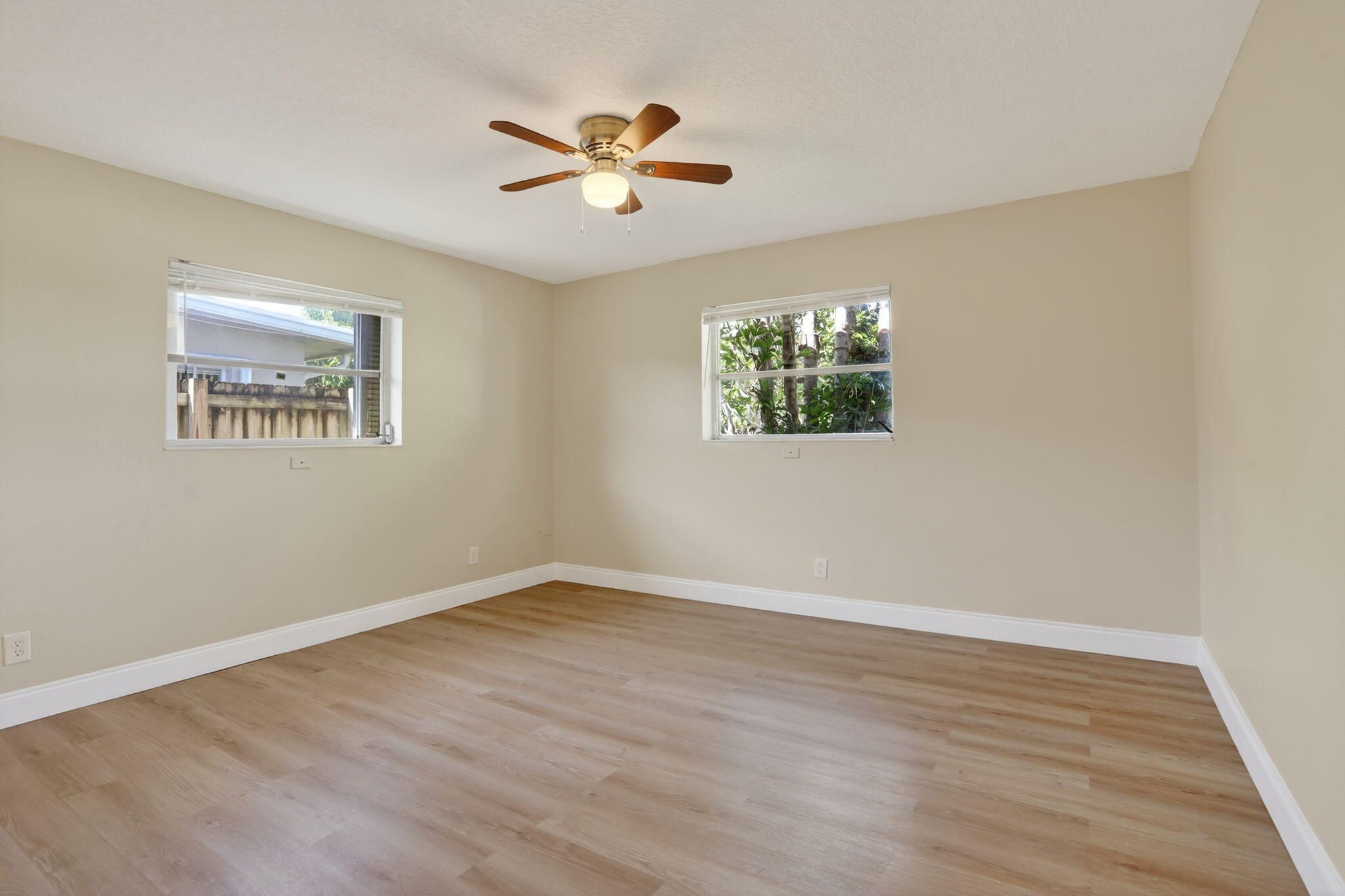 Discover the charm of this delightful 2-bedroom, 2-bathroom home, perfectly situated on a spacious corner lot with a privacy fence. Inside, you'll find a versatile bonus room ideal for a den or home office, along with a generous Florida room where you can unwind while enjoying views of the lush backyard and tranquil waterway. Freshly painted inside and out, this home features updated travertine kitchen countertops, four new ceiling fans, and new vinyl flooring in both bedrooms, offering comfort and style throughout. Ready to move-in. Located in this vibrant 55+ community, you'll enjoy access to a clubhouse, pool, fitness room, and more all just minutes from shopping and dining.