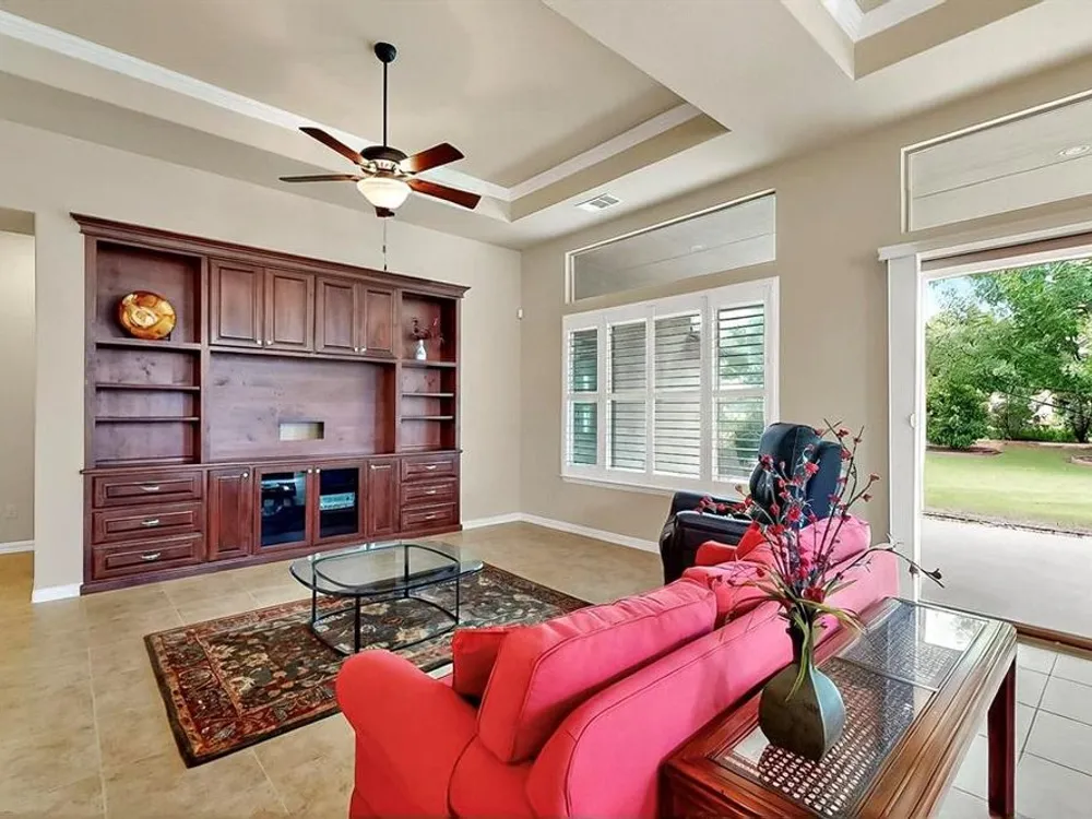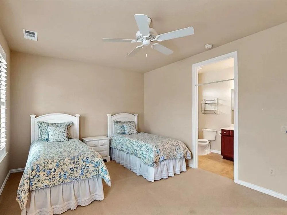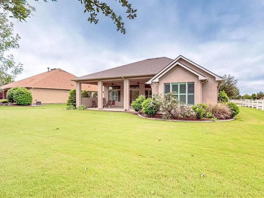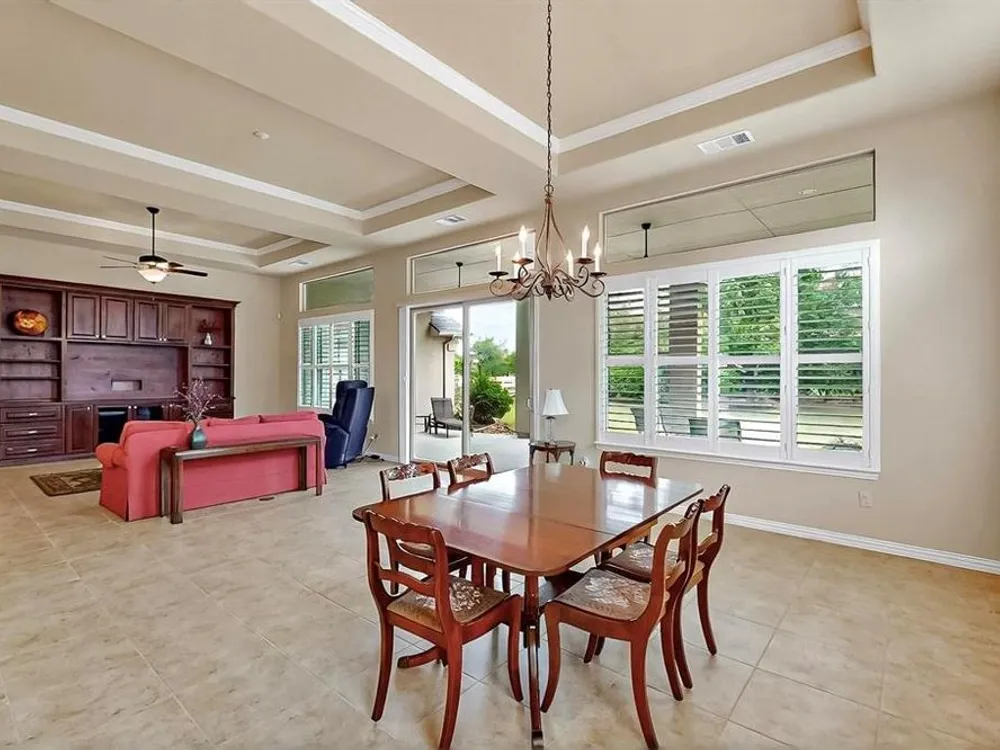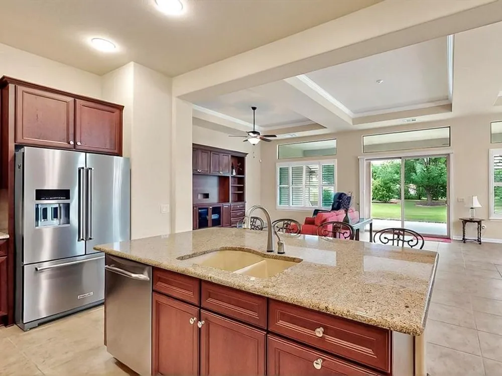 Beautifully positioned on a corner lot, this elegant Rialta home blends timeless stucco and stone detailing with refined interior finishes. Plantation shutters, crown molding, and tile flooring create a sophisticated ambiance throughout.The kitchen impresses with granite countertops, pantry, roll-out shelving, tasteful backsplash, gas cooktop, Blanco sink with a touch-activated faucet, and a spacious island, perfect for both cooking and entertaining. The open-concept living area features a custom built-in entertainment center and three tray ceilings, flowing seamlessly into the dining space for effortless gatherings.Retreat to the spacious primary suite with its own tray ceiling, boxed bay window, dual vanities, and a fully customizable walk-in closet. The secondary bedroom enhances comfort for your guests with an ensuite bathroom. The dedicated flex room offers a quiet, well-lit space ideal for remote work or creative projects.The laundry room offers added convenience with a built-in sink and abundant cabinet storage. The extended 3 car garage gives you flexibility and ample space. Step outside to the wide covered patio with a gas stub, surrounded by mature trees and lush landscaping—your own peaceful outdoor oasis.Ready to explore all Robson Ranch has to offer? Enjoy quick access to the Michelle Way entrance for added ease and connectivity, as well as being a short distance from the dog park, horseshoe pits and gardening boxes. From world-class golf courses and fitness centers to social clubs and recreational activities, there’s something for everyone at Robson Ranch. Become a part of this stunning community today!