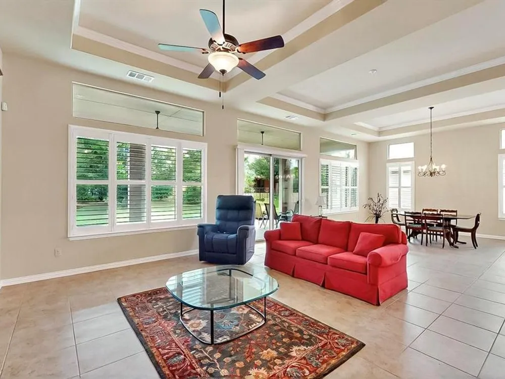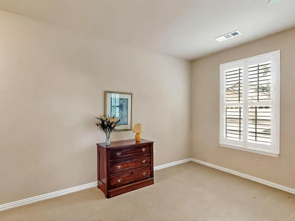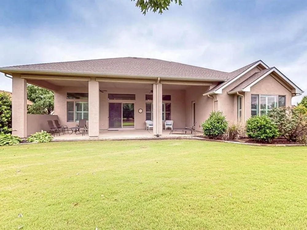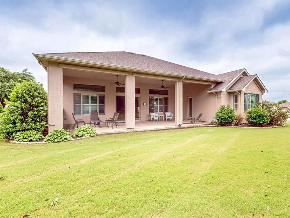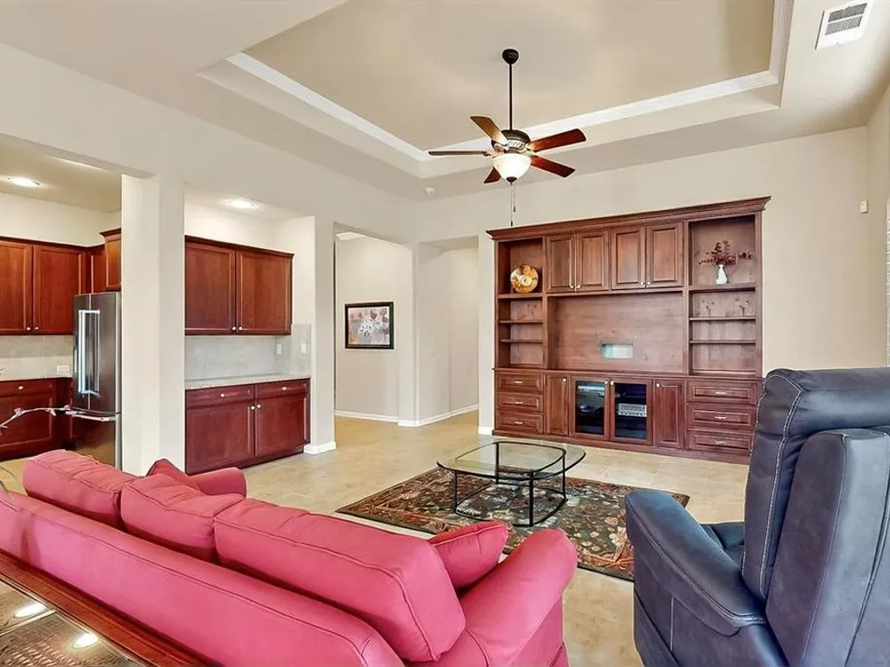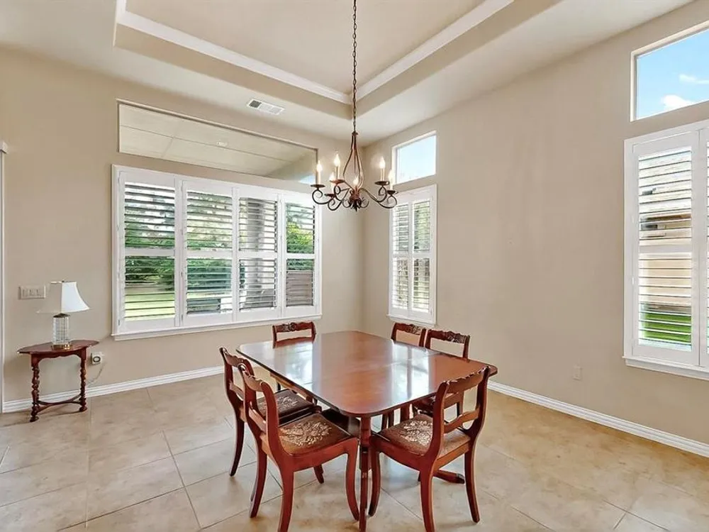 Beautifully positioned on a corner lot, this elegant Rialta home blends timeless stucco and stone detailing with refined interior finishes. Plantation shutters, crown molding, and tile flooring create a sophisticated ambiance throughout.The kitchen impresses with granite countertops, pantry, roll-out shelving, tasteful backsplash, gas cooktop, Blanco sink with a touch-activated faucet, and a spacious island, perfect for both cooking and entertaining. The open-concept living area features a custom built-in entertainment center and three tray ceilings, flowing seamlessly into the dining space for effortless gatherings.Retreat to the spacious primary suite with its own tray ceiling, boxed bay window, dual vanities, and a fully customizable walk-in closet. The secondary bedroom enhances comfort for your guests with an ensuite bathroom. The dedicated flex room offers a quiet, well-lit space ideal for remote work or creative projects.The laundry room offers added convenience with a built-in sink and abundant cabinet storage. The extended 3 car garage gives you flexibility and ample space. Step outside to the wide covered patio with a gas stub, surrounded by mature trees and lush landscaping—your own peaceful outdoor oasis.Ready to explore all Robson Ranch has to offer? Enjoy quick access to the Michelle Way entrance for added ease and connectivity, as well as being a short distance from the dog park, horseshoe pits and gardening boxes. From world-class golf courses and fitness centers to social clubs and recreational activities, there’s something for everyone at Robson Ranch. Become a part of this stunning community today!