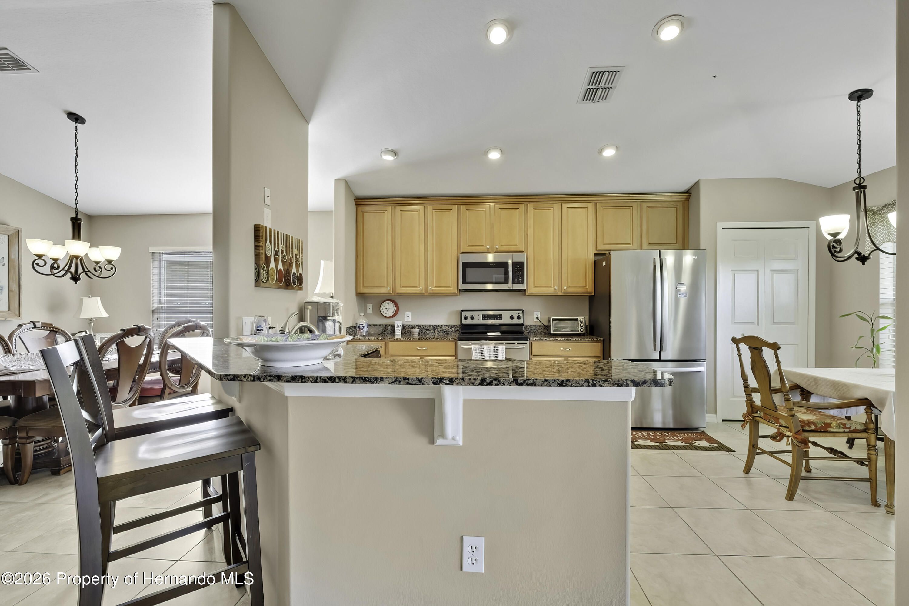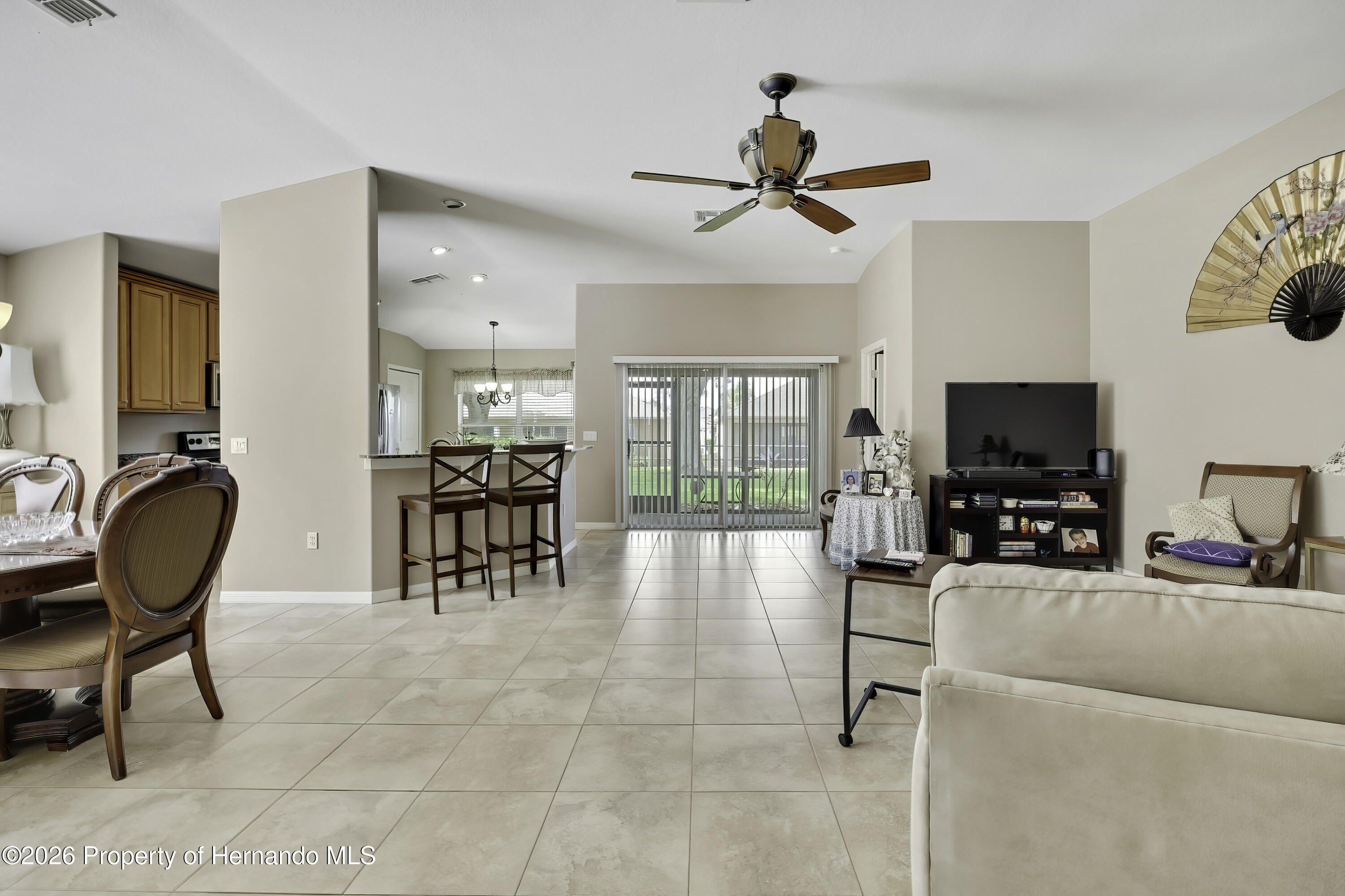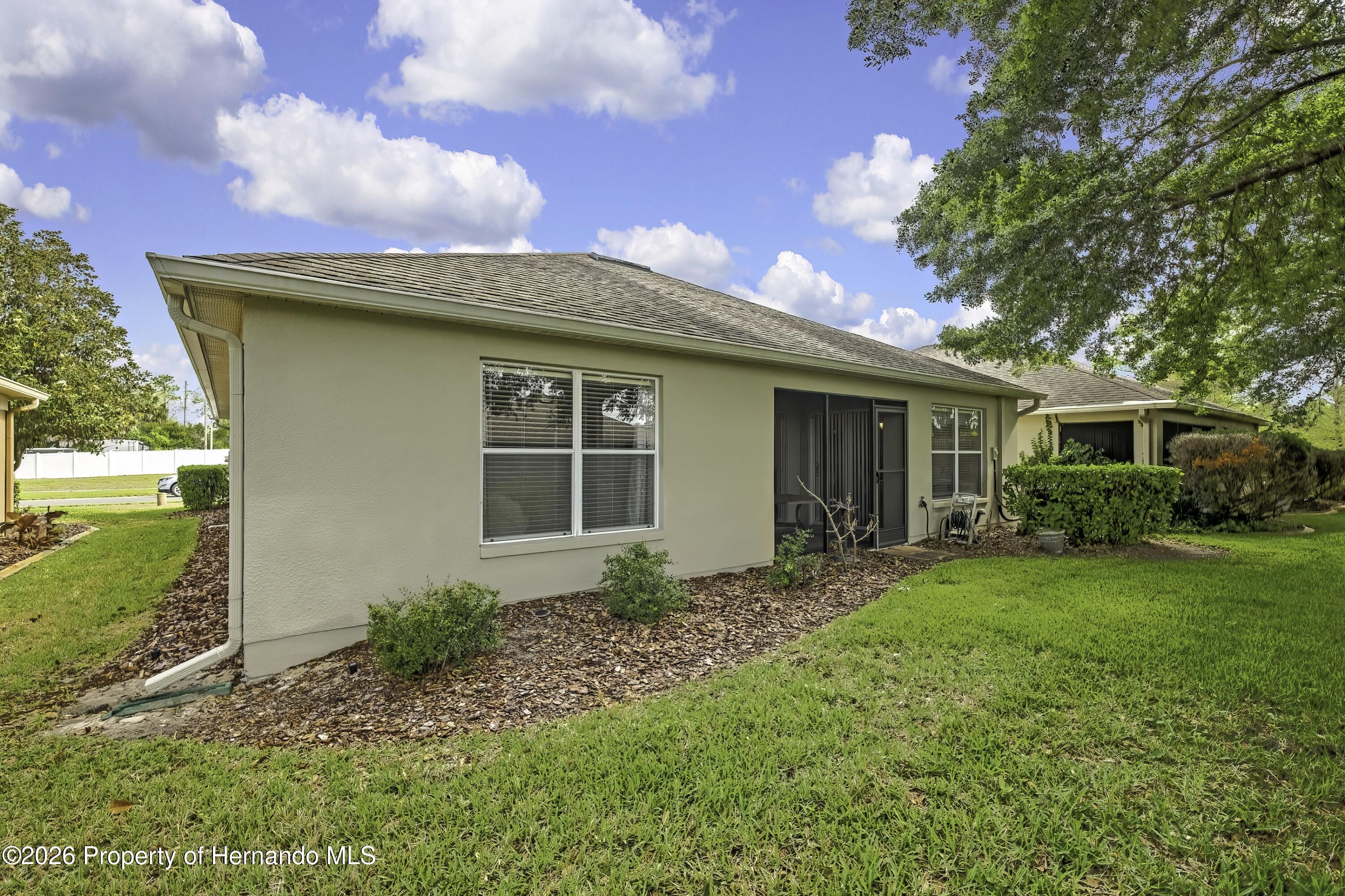From the moment you walk in you will appreciate the bright and welcoming feel of this home in guard gated 55+ Golf community! This spacious 2 Bedroom 2 Bath home offers beautiful tile flooring throughout the main living areas, creating a seamless, modern look. The open floor plan offers plenty of room to enjoy family or just spend a quiet evening. Inside you'll appreciate the vaulted ceilings and the openness of the Great Room and Dining Room. Kitchen features stainless appliances that are included, Granite countertops, abundant wood cabinets, bar stool countertop. Storage shouldn't be a problem in this home because it has a pantry and a laundry room. The primary bedroom offers a large walk-in closet and ensuite. The screened patio off the kitchen is perfect for enjoying the evening without being bothered by bugs. The landscape is immaculate and there is an irrigation system to keep the plants watered. There is plenty to appreciate about this home and it is centrally located with a short drive to shopping, entertainment, waterfront, and dining options. The Heritage Pines community is impeccably kept. The golf course is very well-maintained offering 18-hole championship golf course. This is a premier active 55+ community featuring beautiful sit-down restaurant and bar. A large resort-style heated swimming pool and spa, tennis, cards, bocce, shuffleboard, and more activities than anyone could possibly do! A HUGE fitness center with state-of-the-art fitness equipment offering many activities from Yoga to Tai Chi, a beautiful billiards room, and an amazing card room. Heritage Pines offers a variety of amenities for residents.