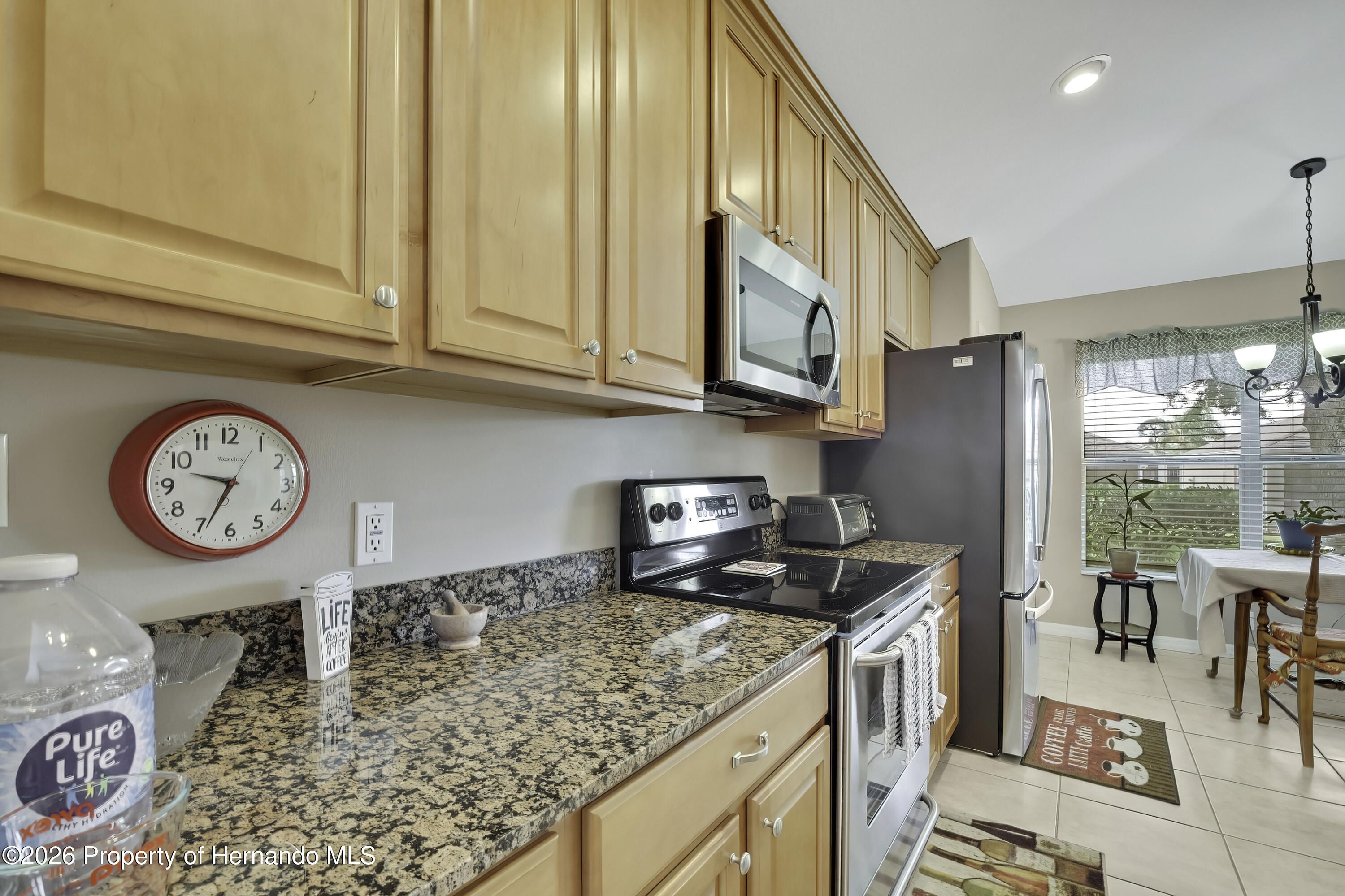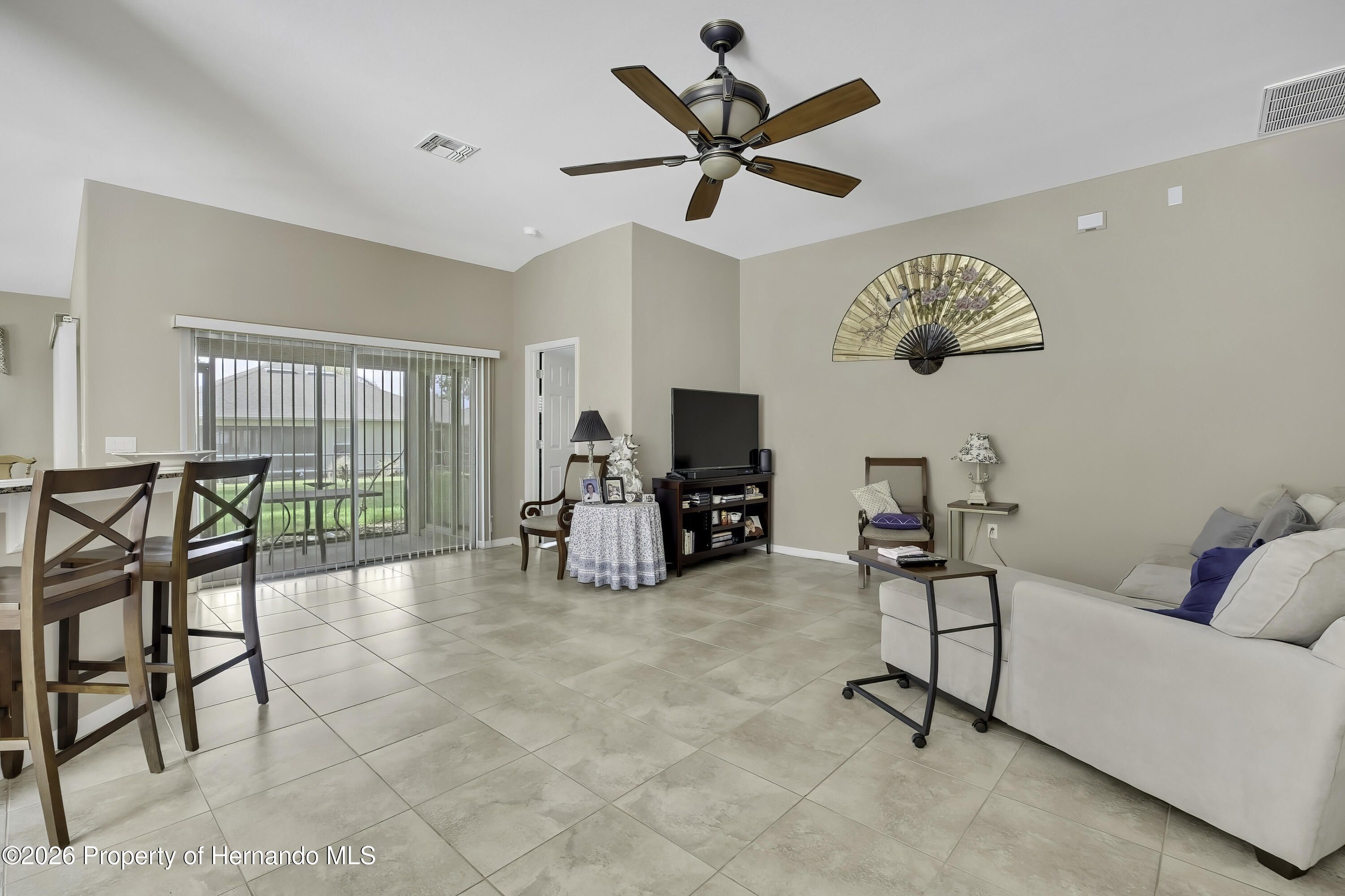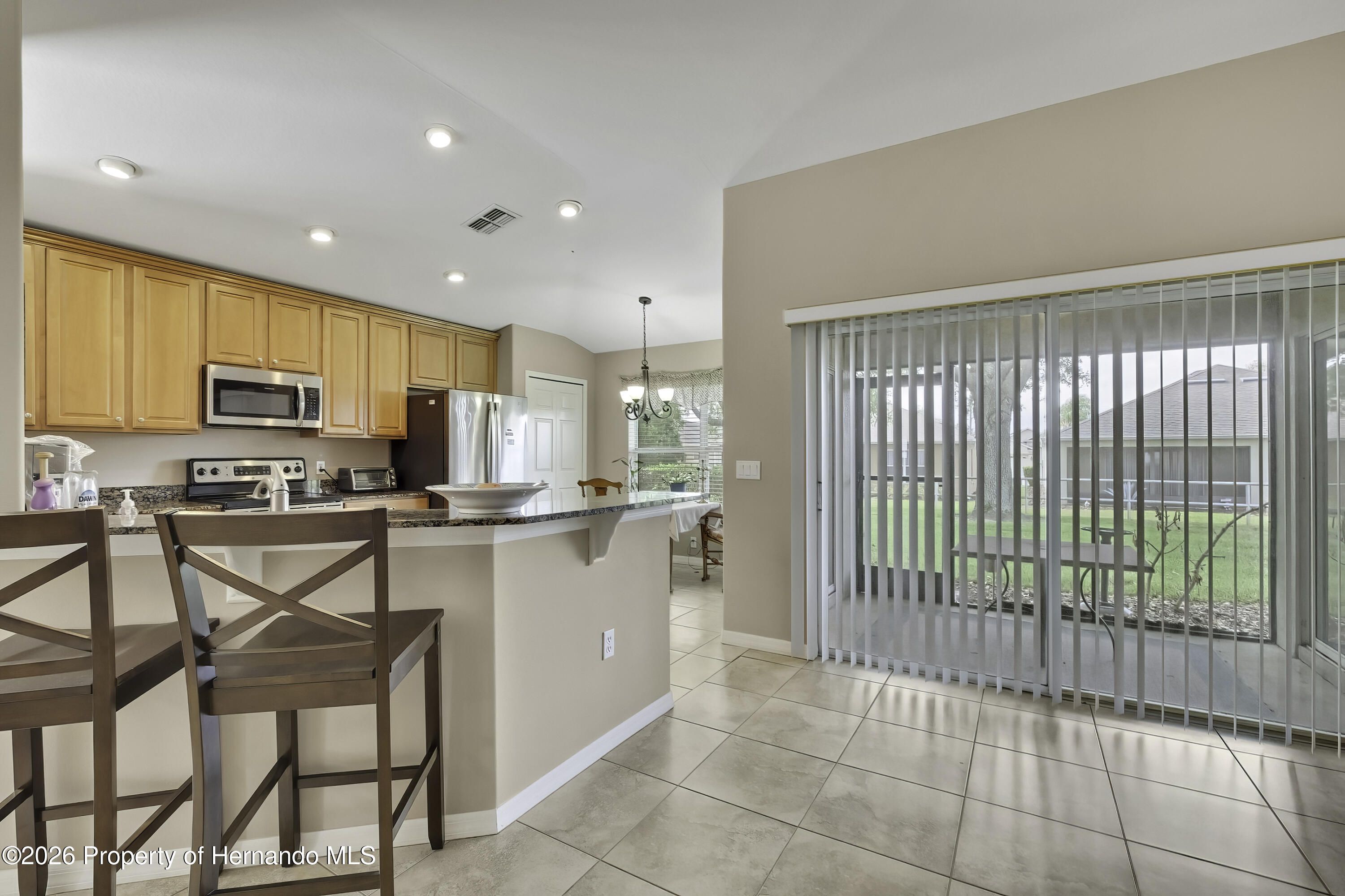 From the moment you walk in you will appreciate the bright and welcoming feel of this home in guard gated 55+ Golf community! This spacious 2 Bedroom 2 Bath home offers beautiful tile flooring throughout the main living areas, creating a seamless, modern look. The open floor plan offers plenty of room to enjoy family or just spend a quiet evening. Inside you'll appreciate the vaulted ceilings and the openness of the Great Room and Dining Room. Kitchen features stainless appliances that are included, Granite countertops, abundant wood cabinets, bar stool countertop. Storage shouldn't be a problem in this home because it has a pantry and a laundry room. The primary bedroom offers a large walk-in closet and ensuite. The screened patio off the kitchen is perfect for enjoying the evening without being bothered by bugs. The landscape is immaculate and there is an irrigation system to keep the plants watered. There is plenty to appreciate about this home and it is centrally located with a short drive to shopping, entertainment, waterfront, and dining options. The Heritage Pines community is impeccably kept. The golf course is very well-maintained offering 18-hole championship golf course. This is a premier active 55+ community featuring beautiful sit-down restaurant and bar. A large resort-style heated swimming pool and spa, tennis, cards, bocce, shuffleboard, and more activities than anyone could possibly do! A HUGE fitness center with state-of-the-art fitness equipment offering many activities from Yoga to Tai Chi, a beautiful billiards room, and an amazing card room. Heritage Pines offers a variety of amenities for residents.