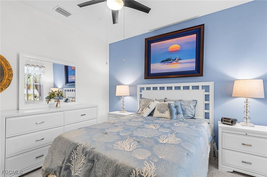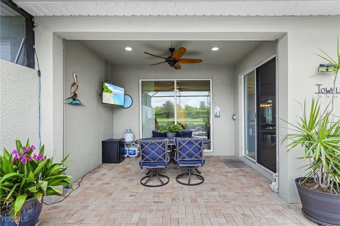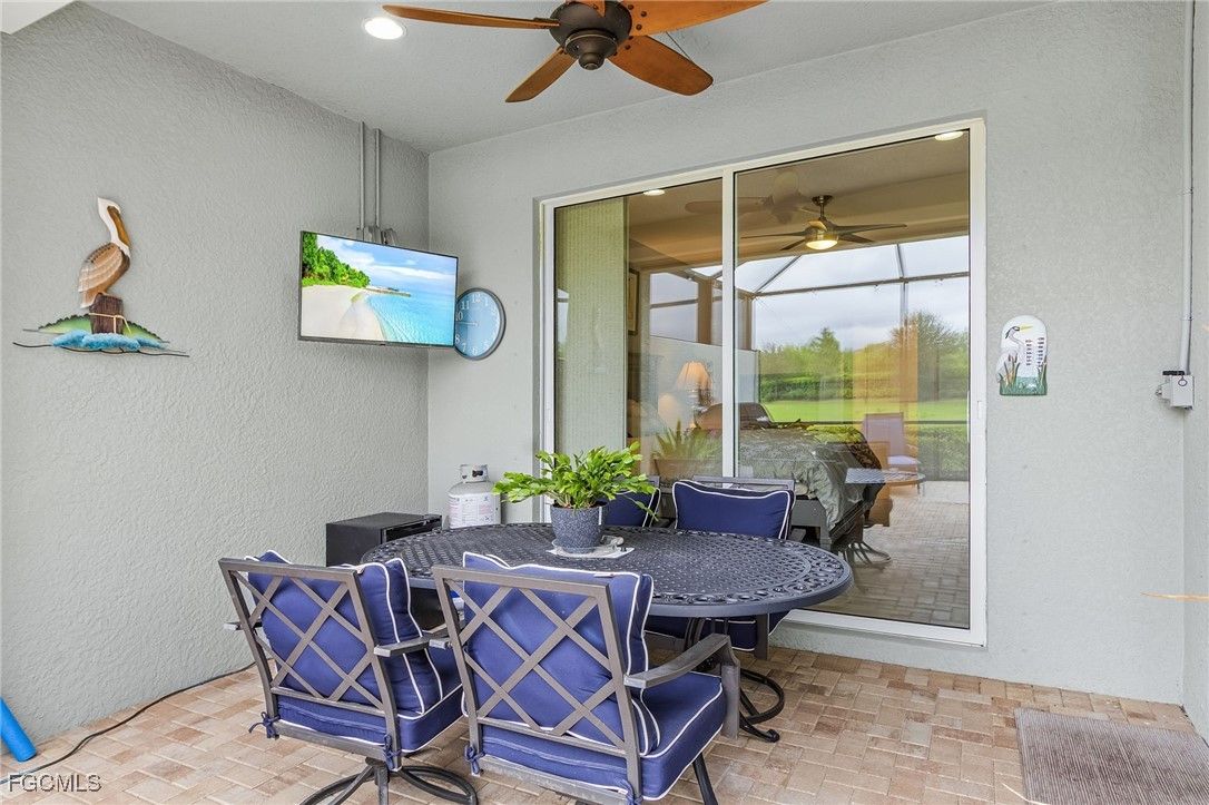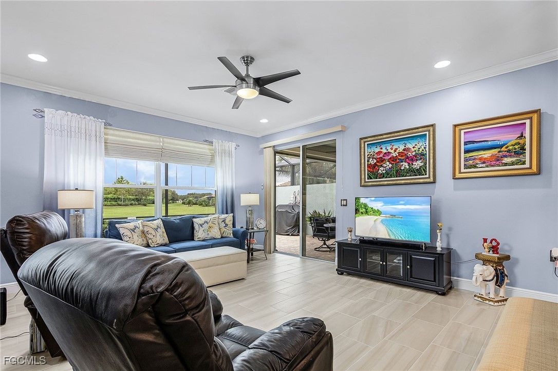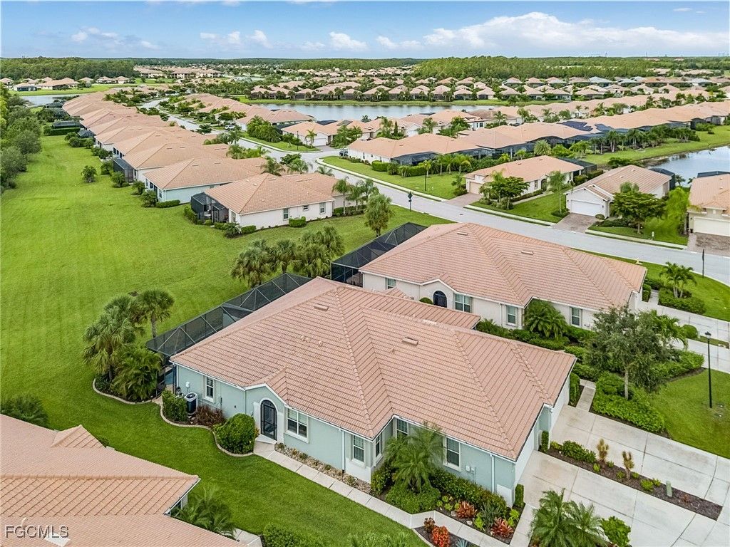 A must see villa with a great backyard setting to enjoy the screened lanai with private pool and additional lighting. There is a screened slider on the lanai that leads to the living room with crown molding and remote Roman Shades. This 3 Bedroom home boasts many upgrades starting with a screened entry with glass insert front door. There are tile floors through the main living area, Luxury Vinyl Plank flooring in the Primary and new carpet (2025) in the guest rooms. The Kitchen has beautiful two tone cabinets with under cabinet lighting, an Island and wine bar with pull out shelves, additional cabinetry in the eating area plus a Keurig coffee maker with a direct line. There are newer LG appliances with transferable coverage (5/2026). Other upgrades: Hurricane Shutters, whole home water purifier and RO (2020), Hot Water Heater (2021), HVAC with UV Light (2024), new pool pump (2024) and all LED lighting. The interior was painted (2024), exterior painted (2025), roof baffles and vents resealed (2024), fresh landscaping (2024) roof cleaned (2025) and tile floors sealed (10/2025) with a 5 year transferable warranty. There is a portable whole home generator (2024) and lanai TV that will convey with the home. This home has it all where you can move right in and start to enjoy your new resort lifestyle. Pelican Preserve is a nationally recognized active adult 55+ community with endless amenities including the Flip Flops outdoor restaurant, 3 pools, Tennis, Pickleball, Bocce, Softball, Fitness, Movie Theater, Billiards, Hobby Rooms, Amphitheater, Destinations indoor restaurant, plus many special events throughout the year. The Brokke Center includes a Library, Card Rooms and Coffee Center for socializing with friends. Pelican Preserve has a 27 hole Private Golf Club with optional memberships. Pelican Preserve is a short drive to RSW Airport and many shops and restaurants and the gulf coast beaches. It's time to call this your next home. Some furniture is available in a separate bill of sale.