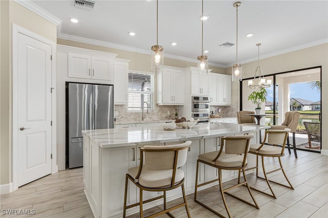 ** Lowest Priced Lazio Model in Esplanade** Welcome to your new beautiful 3-bedroom, 2-bathroom home located in the sought-after Esplanade Lake Club community. No expense was spared in this bright, open concept, gourmet kitchen featuring a large Quartz island, pantry, natural gas stove, extended bar & casual dining area. The master suite features dual vanities, a glass shower, walk-in closet and bay windows overlooking the lake. Guests and family will appreciate the two spacious en-suite bedrooms with an option to convert the den into a 4th bedroom or study. Esplanade Lake Club offers world class amenities such as a resort-style pool, lakefront beach, fitness center, Bahama Bar & Grille , tennis, pickleball, bocce courts, dog parks, boating, kayak launch and walking trails. Close to Gulf Coast Town Center (target, Costco), RSW & I-75.