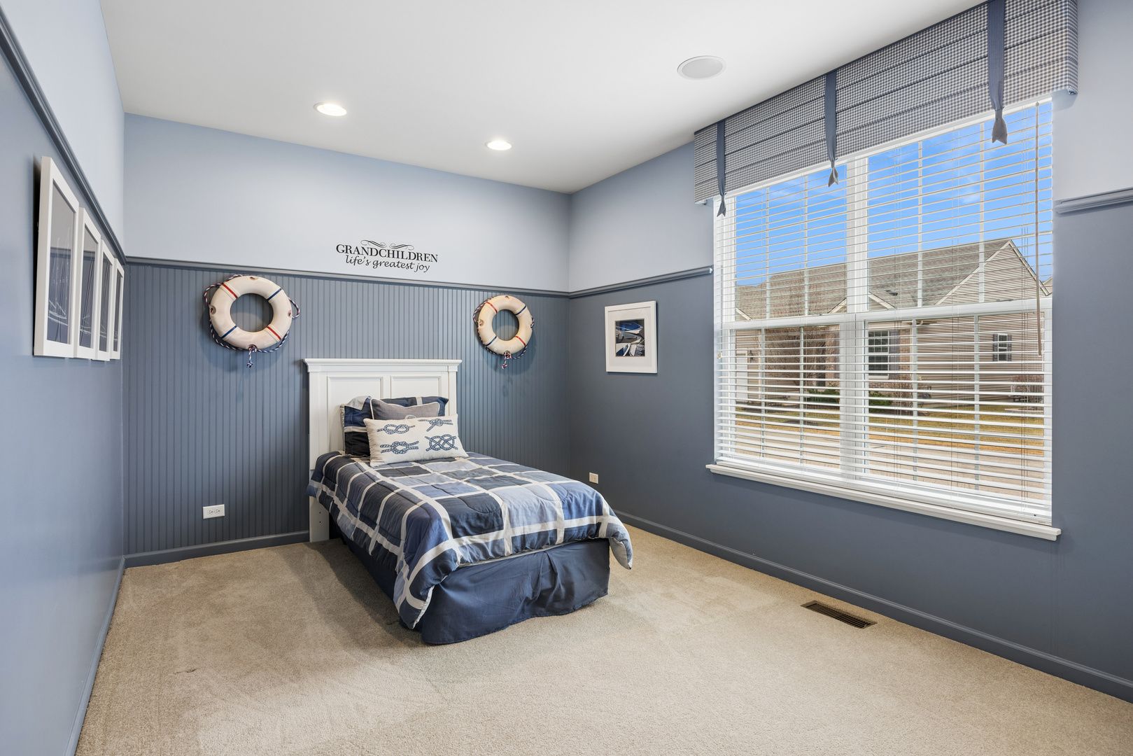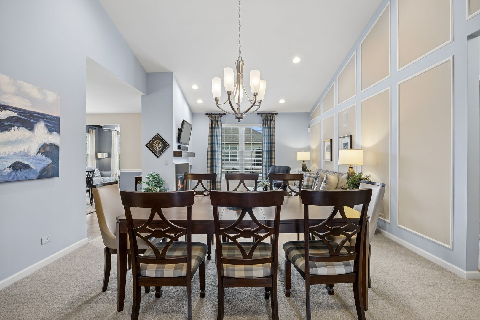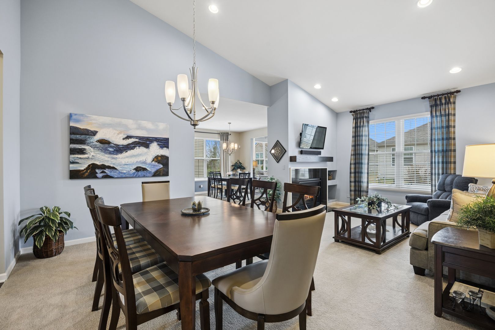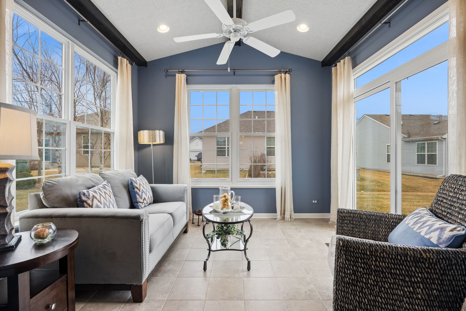 Welcome to easy, resort-style living in this beautiful former builder's model located in a sought-after 55+ community! This thoughtfully designed home offers exceptional upgrades and a bright, open layout perfect for both relaxing and entertaining. Step inside to the stunning living room featuring a soaring cathedral ceiling and cozy fireplace, creating a warm and inviting focal point. The dining area just off the living room makes hosting gatherings effortless. The fabulous kitchen is a chef's delight with a center island, ample cabinetry, and a sunny eating area. Just beyond the kitchen is a charming sunroom with a vaulted ceiling, the perfect spot to enjoy morning coffee or unwind with a book. A sliding glass door leads to the patio, offering a great space for outdoor relaxation. The spacious primary suite is a true retreat with a bump-out window, elegant tray ceiling, and a luxurious private bath featuring double sinks, a soaking tub, separate shower, walk-in closet, and the added luxury of heated bathroom floors. Two additional bedrooms provide flexible space for guests, a home office, or hobby room. A 2-car garage adds convenience and extra storage. Enjoy the lifestyle you deserve with resort-style amenities including a clubhouse, pool, fitness center, and scenic walking trails-all designed to make every day feel like a getaway. This exceptional home combines comfort, style, and community living all in one wonderful package. Don't forget to check out the 3D interactive floor plan. Seller will convey existing plat of survey.