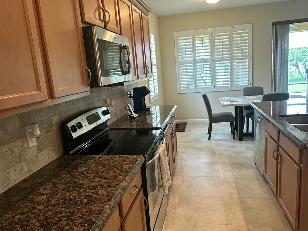 Join Florida's luxury lifestyle in this highly sought after community of Town Park in Tradition. A family oriented development with superior amenities, wide sidewalks, dog parks, tennis courts, kids splash fountains, resort style pool and more. Beautifully designed 3 bed/2/bath home secure with guarded gates. Features tile floors in main areas/GROUT JUSTED cleaned with an open modern kitchen, granite countertops, stainless steel appliances, and an island. The living room's vaulted ceilings provide a spacious feel, the dedicated office/den provides added versatility or 3rd bedroom. Primary suite boasts two walk-in closets, with an oversized tile shower, duel sinks & separate toilet area. laundry room w/new washer/dryer & sink. Exterior of home just painted 6/1725, new fridge-Jan 2025.