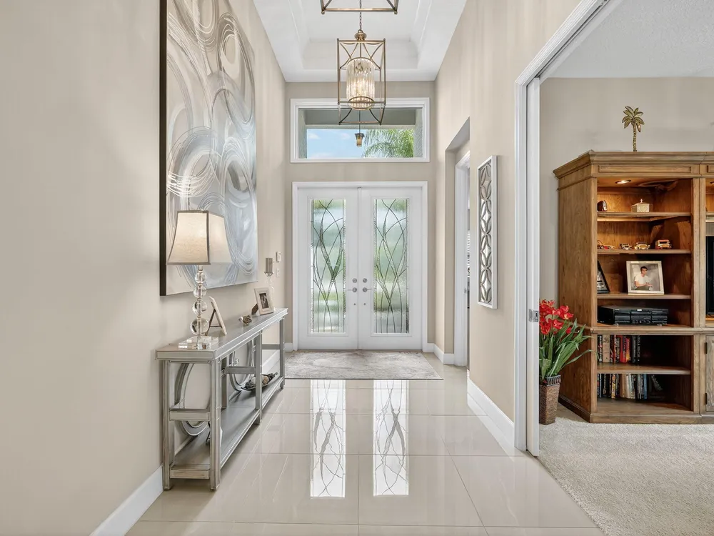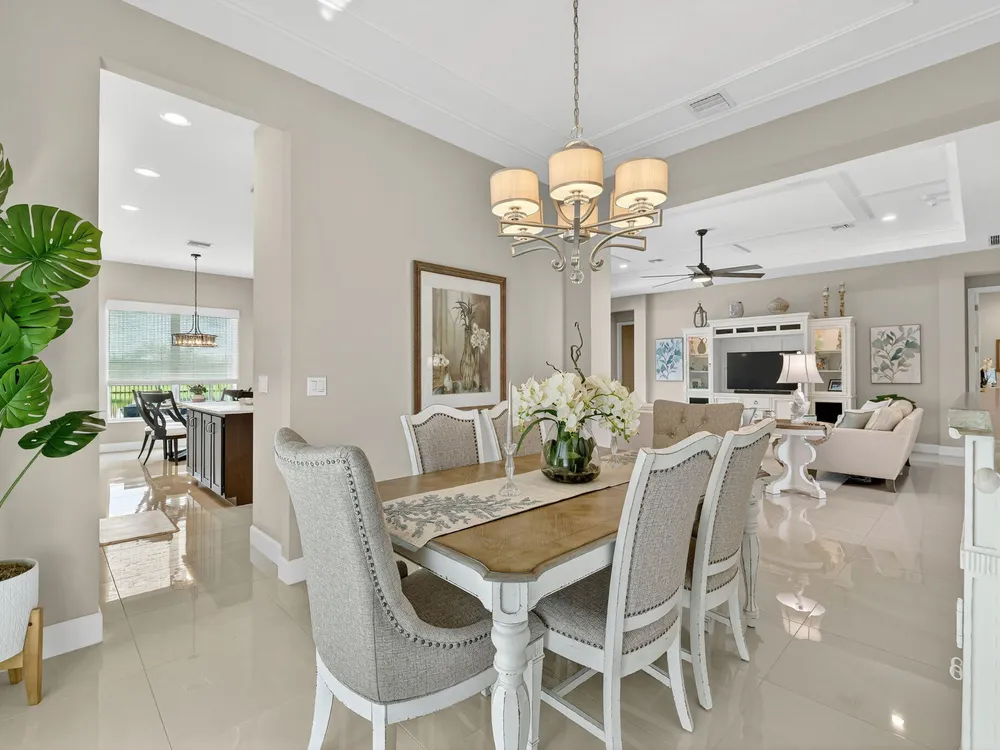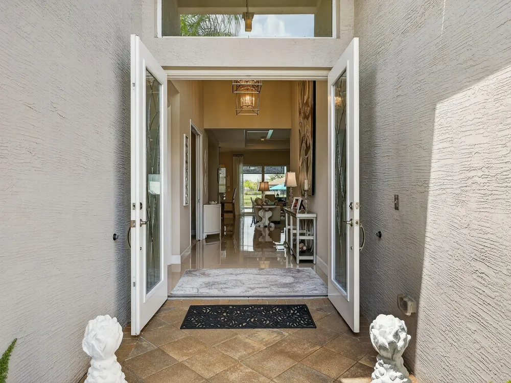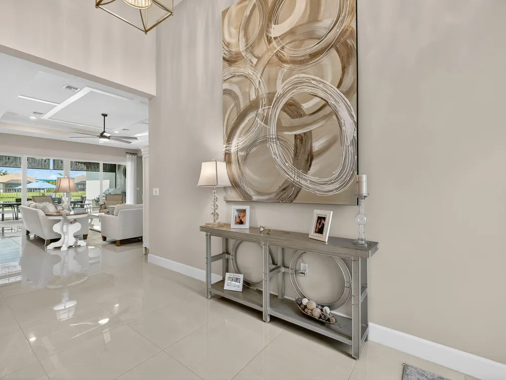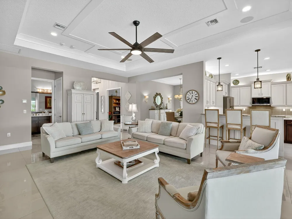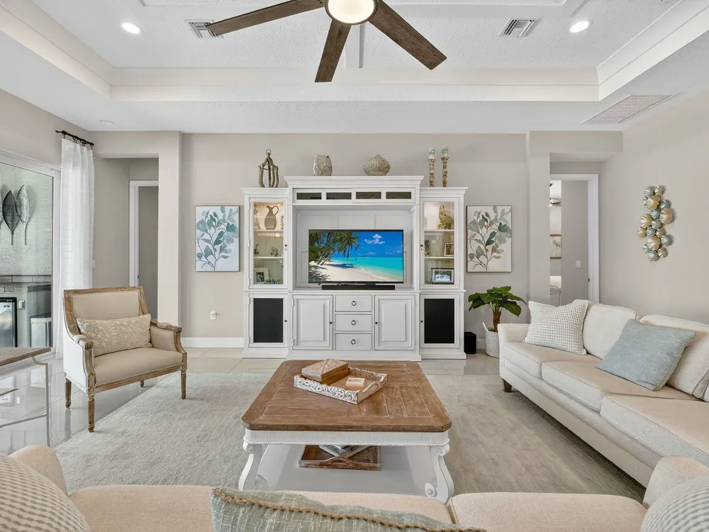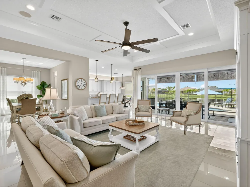 Experience Luxury Living at its finest, in a lakefront Julia Model at Valencia Cay in Riverland. A spectacular grand entrance features a custom glass double door entrance into a large foyer with a coffered ceiling and designer lighting. This home features 3 Bedrooms, Plus Den, 3.5 baths, with a 3-car garage. Elegant and thoughtfully designed, you will not be disappointed. This stunning residence combines modern comfort, sophisticated style and resort-style living, making it the perfect retreat for those seeking an active and luxurious lifestyle here in Florida. The Julia Model boasts spacious interiors, open concept living and high-end finishes throughout. An expansive great room with custom millwork and a coffered ceiling is ideal for formal and relaxed entertainment.