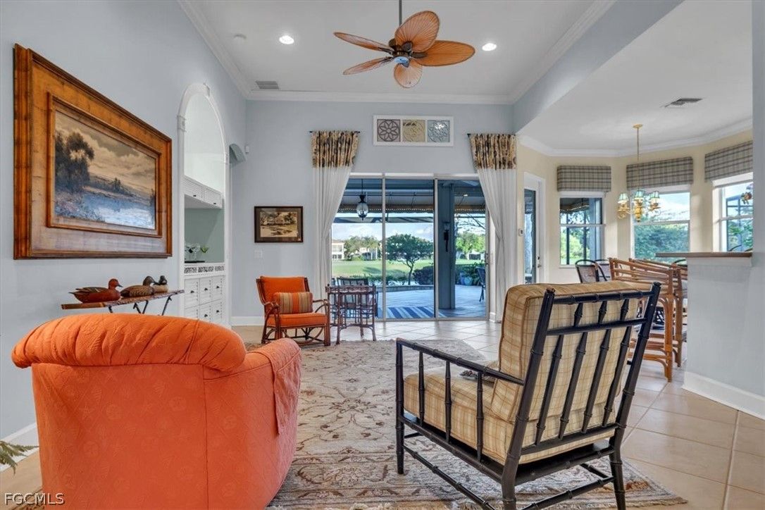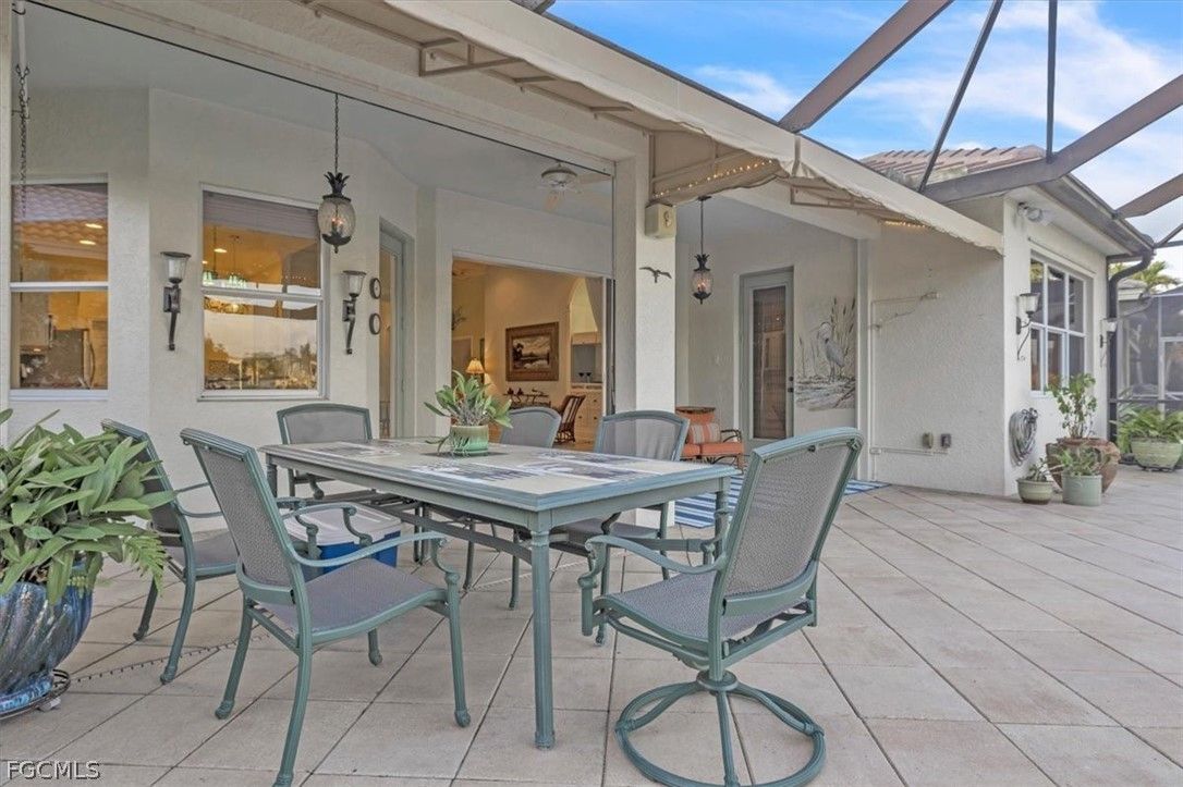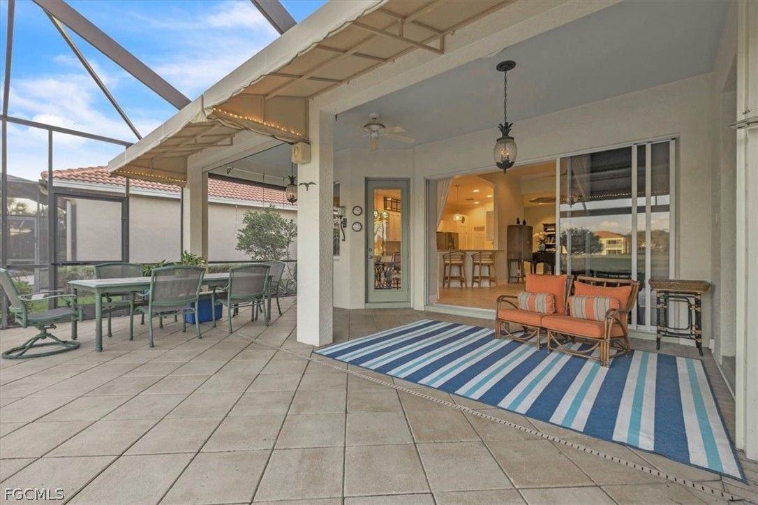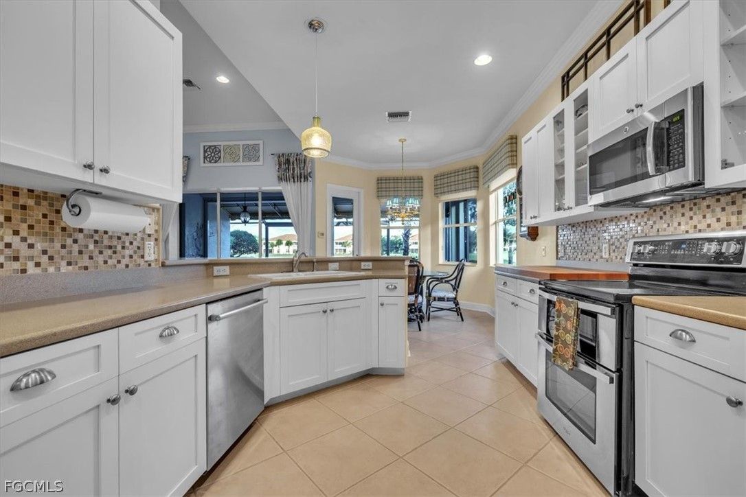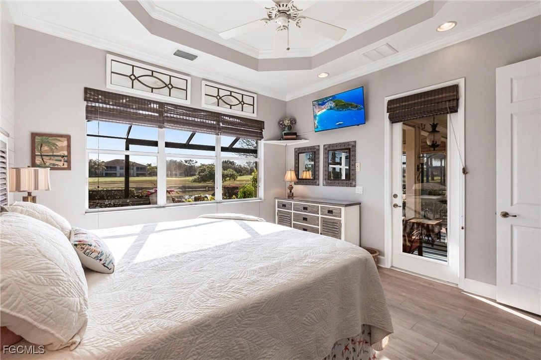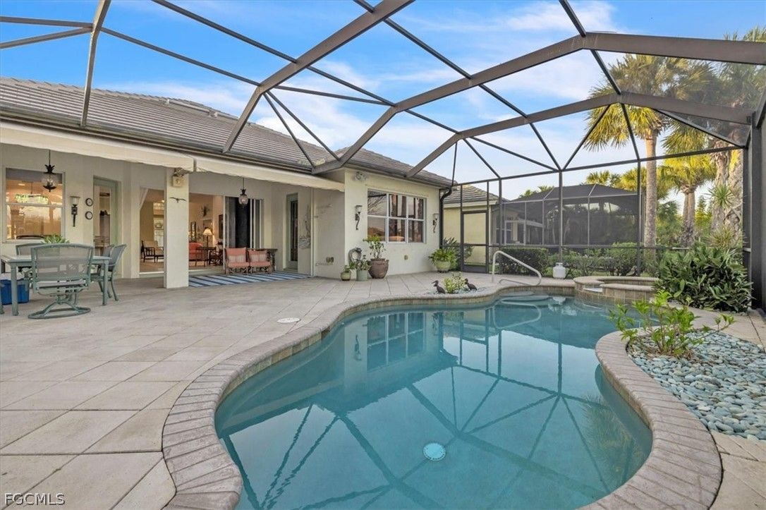 MAJOR PRICE REDUCTION. MOTIVATED SELLERS BRING OFFERS. A rare opportunity to own a stunning home with breathtaking views of the golf course and lake. This home is filled with upgrades and features, with sellers having invested over $110,000 in improvements, making it virtually move-in ready. The property offers 1840 sq. ft. of living space, including 2 bedrooms, a den, and 2 baths, as well as an expansive lanai with an eastern rear exposure. Some of the standout features of this property include a brand NEW ROOF completed in 2025, maple cabinet refacing in the kitchen, an attractive backsplash in the kitchen, removal of original columns in the dining room for a more open feel, oak flooring in the den, LVP flooring in the bedrooms, crown molding, tray ceilings, newer AC, refrigerator, and pool heater, a phantom door at the front entrance, custom cabinetry throughout the home for added storage, enhanced lighting and fan fixtures, and attractive window treatments. Upon entering the home, the open feel is immediately noticeable. The den and guest bedroom are both spacious, with the den offering flexibility as a flex room. The master bedroom features an attractive shiplap wall, access to the lanai, and spacious closets. The master bathroom boasts dual sinks, a vanity, and a separate tub and walk-in shower. The lanai area has been updated with hurricane storm shutters, an awning that extends the shaded area for more undercover space, picture window screens on two sides of the cage to enhance views of the golf course and lake, and an attractive pool/spa structure. This home is located in the Verandah Community, a gated community which offers a wide array of amenities for its members, including 2 championship golf courses designed by Jack Nicklaus and Bob Cupp, tennis, pickleball, a state-of-the-art fitness center with an attendant, bocce, kayaks, a dog park, playground, 9 miles of walking and jogging paths, multiple restaurants, and a full activity calendar of events, classes, and fun programs. With all of these unique features and upgrades, this home is perfect for entertaining family and friends. Come see this home before it is gone. Don't miss out on the opportunity to secure your place in paradise!