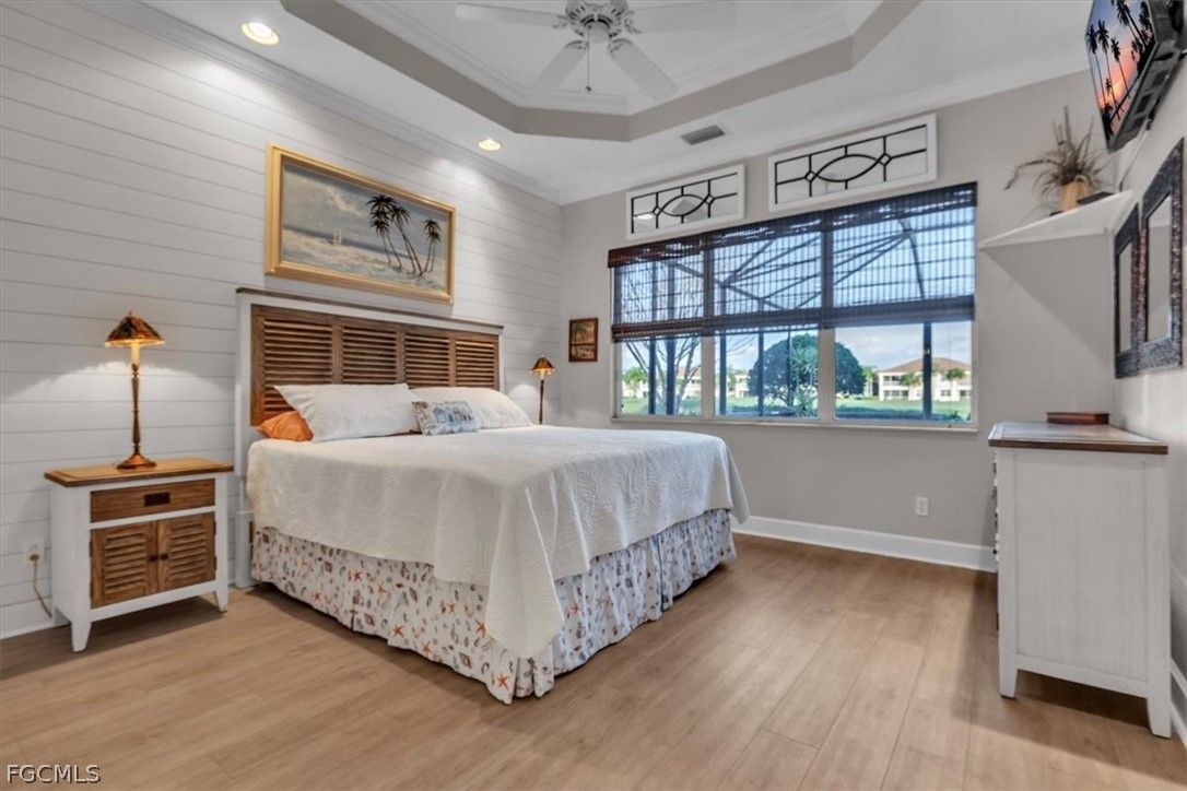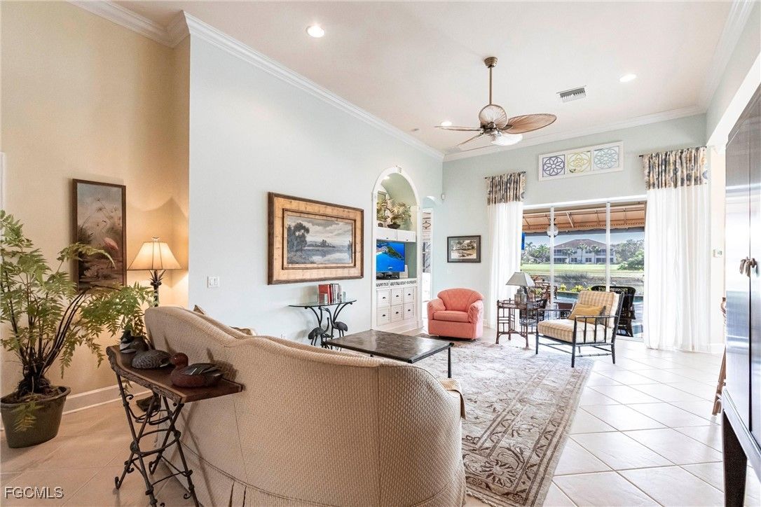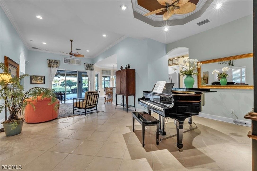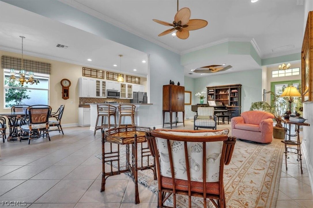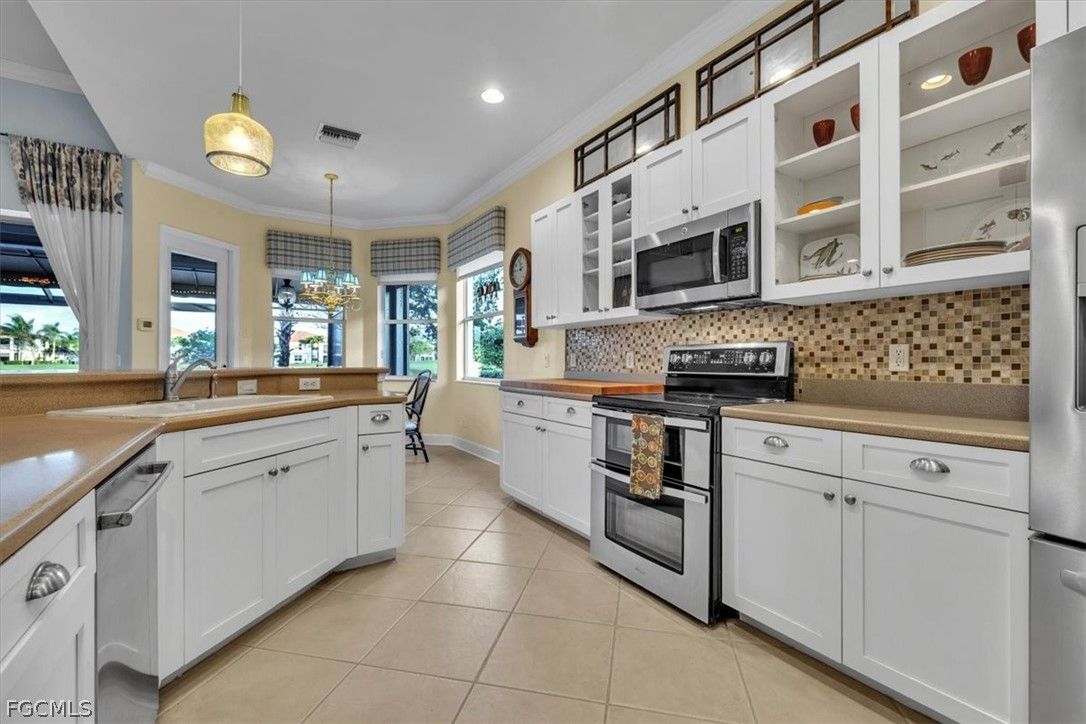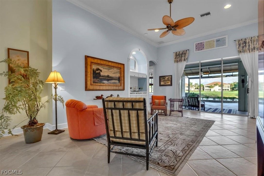 MAJOR PRICE REDUCTION. MOTIVATED SELLERS BRING OFFERS. A rare opportunity to own a stunning home with breathtaking views of the golf course and lake. This home is filled with upgrades and features, with sellers having invested over $110,000 in improvements, making it virtually move-in ready. The property offers 1840 sq. ft. of living space, including 2 bedrooms, a den, and 2 baths, as well as an expansive lanai with an eastern rear exposure. Some of the standout features of this property include a brand NEW ROOF completed in 2025, maple cabinet refacing in the kitchen, an attractive backsplash in the kitchen, removal of original columns in the dining room for a more open feel, oak flooring in the den, LVP flooring in the bedrooms, crown molding, tray ceilings, newer AC, refrigerator, and pool heater, a phantom door at the front entrance, custom cabinetry throughout the home for added storage, enhanced lighting and fan fixtures, and attractive window treatments. Upon entering the home, the open feel is immediately noticeable. The den and guest bedroom are both spacious, with the den offering flexibility as a flex room. The master bedroom features an attractive shiplap wall, access to the lanai, and spacious closets. The master bathroom boasts dual sinks, a vanity, and a separate tub and walk-in shower. The lanai area has been updated with hurricane storm shutters, an awning that extends the shaded area for more undercover space, picture window screens on two sides of the cage to enhance views of the golf course and lake, and an attractive pool/spa structure. This home is located in the Verandah Community, a gated community which offers a wide array of amenities for its members, including 2 championship golf courses designed by Jack Nicklaus and Bob Cupp, tennis, pickleball, a state-of-the-art fitness center with an attendant, bocce, kayaks, a dog park, playground, 9 miles of walking and jogging paths, multiple restaurants, and a full activity calendar of events, classes, and fun programs. With all of these unique features and upgrades, this home is perfect for entertaining family and friends. Come see this home before it is gone. Don't miss out on the opportunity to secure your place in paradise!