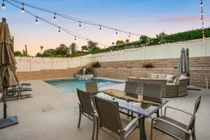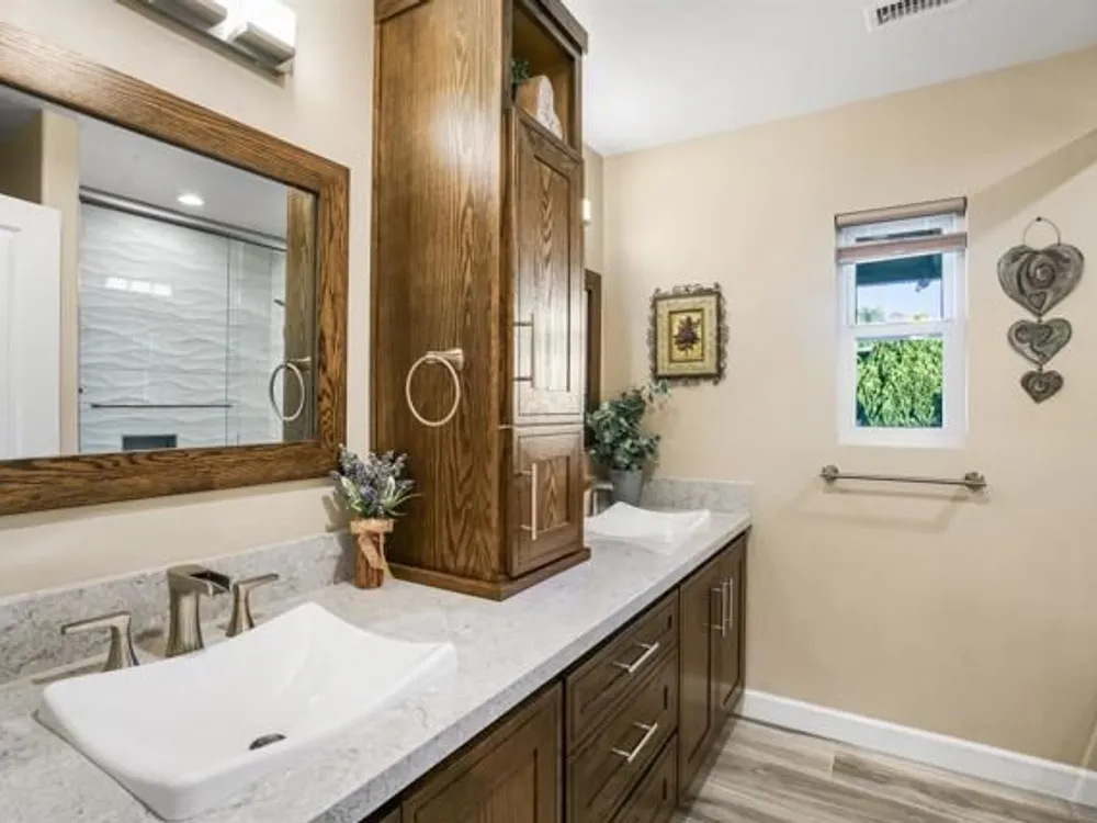 Welcome to this FULLY remodeled 2 bedroom + OFFICE, 2 bathroom home in Seven Oaks, a 55+ community. Complete, down to the studs remodel finished in 2020. Owners spared no expense. Entirely new plumbing, including NEW main sewer line and incoming copper water lines. Roof, windows, HVAC and electrical systems all upgraded during remodel. The chef’s kitchen boasts high end Thermador appliances including a warmer drawer and custom cabinetry designed for the serious home cook in mind. A HUGH island provides ample prep space, additional storage and seating. The SALT water pool was completed in 2021. Large covered patio is ready for your dream outdoor kitchen with electrical and water stub ups. The master bedroom features a large walk-in closet and both bathrooms have custom cabinets. Many thoughtful upgrades throughout like a whole house filter, with additional filters for drinking water, hidden outlets in bathroom cabinets, pop-out outlets, zero entry shower, top down shades, built-in linen/storage cabinets and paid-off SOLAR.