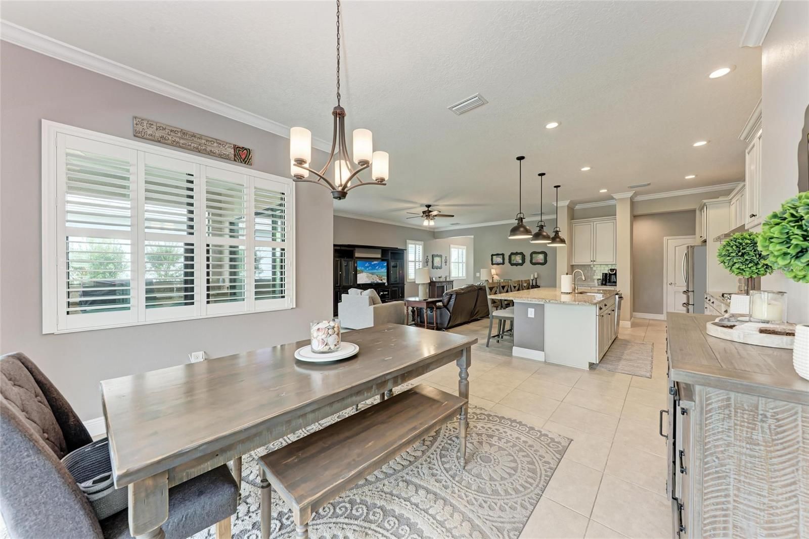 - Ceiling Fan(s), Coffered Ceiling(s), Crown Molding, Open Floorplan, Main Level Primary, Solid Surface Counters, Tray Ceiling(s), Window Treatments