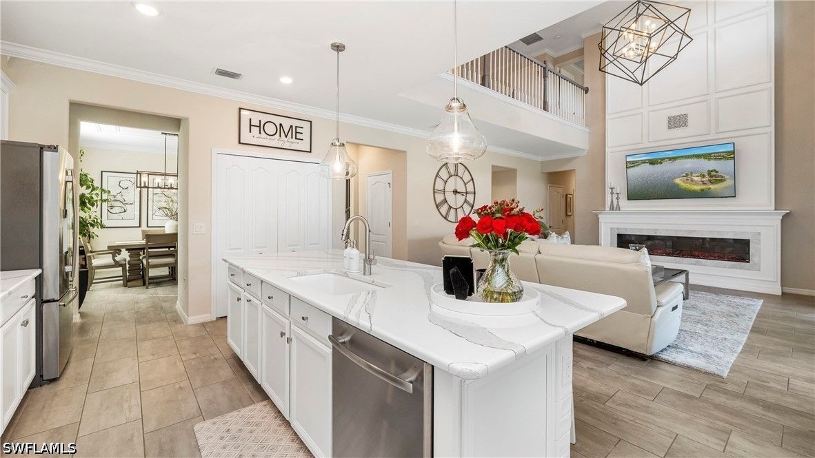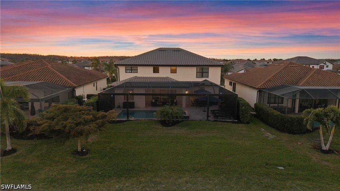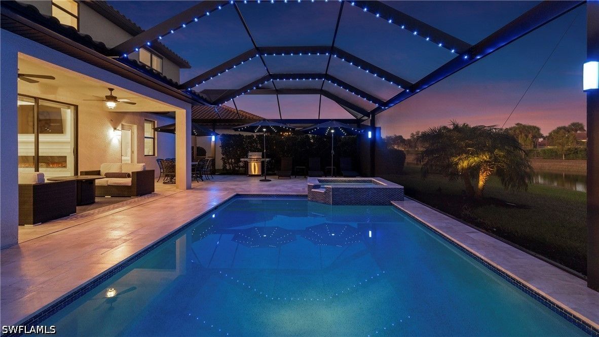 Now repositioned and priced to sell—this is one of the best LAKEFRONT values in the area. DESIGNER FURNISHED! Now offered under $1M and positioned to sell! Welcome to LAKEFRONT LUXURY inside and RESORT STYLE living outside! One of the most extensively upgraded residences in the gated community of Arborwood Preserve. This fully furnished and accessorized 5-bedroom, 4.5-bath home offers 3,250 square feet of thoughtfully curated living space, positioned on a tranquil lakefront homesite with serene water views. Inside, a dramatic two-story custom fireplace feature wall anchors the main living area, complemented by crown molding, designer lighting, and upgraded millwork throughout. The chef’s kitchen features premium JennAir appliances, quartz countertops, designer backsplash, wine refrigerator, built-in coffee station, custom cabinetry details, and upgraded hardware. The reimagined primary suite offers a spa-inspired bath with soaking tub, glass-enclosed shower, quartz finishes, and integrated Bluetooth speakers. Quartz surfaces and upgraded fixtures continue throughout all bathrooms. Additional highlights include second-floor luxury vinyl plank flooring, custom closet systems, designer window treatments, dual-zone AC, water softener system, Slomins security, upgraded LG washer and dryer, added attic soffits, and second-floor gutters. The screened lanai showcases a panoramic picture-window enclosure overlooking the lake. The saltwater pool and spa feature remote automation, glass tile detailing, and a marble pool deck. A mature clusia hedge enhances privacy while preserving peaceful water views. Arborwood Preserve offers residents RESORT-STYLE amenities including clubhouse, fitness center, tennis, pickleball, and community pool — all minutes from RSW, shopping, dining, and GULF beaches.