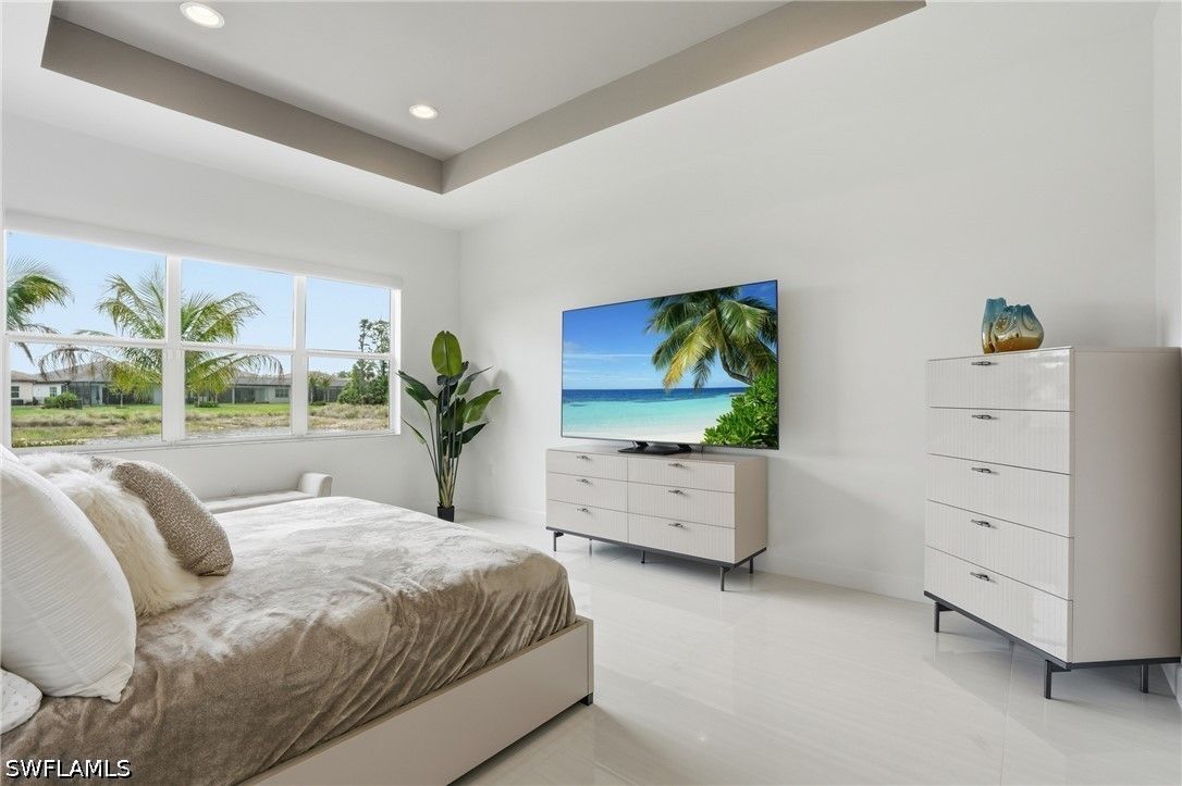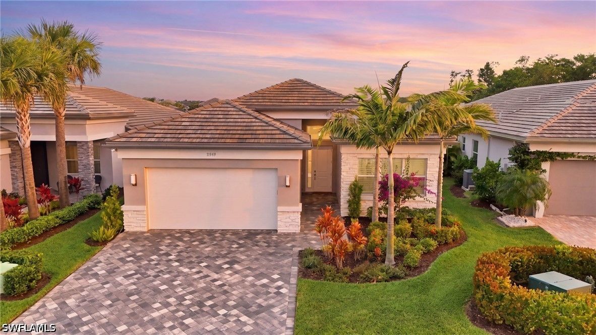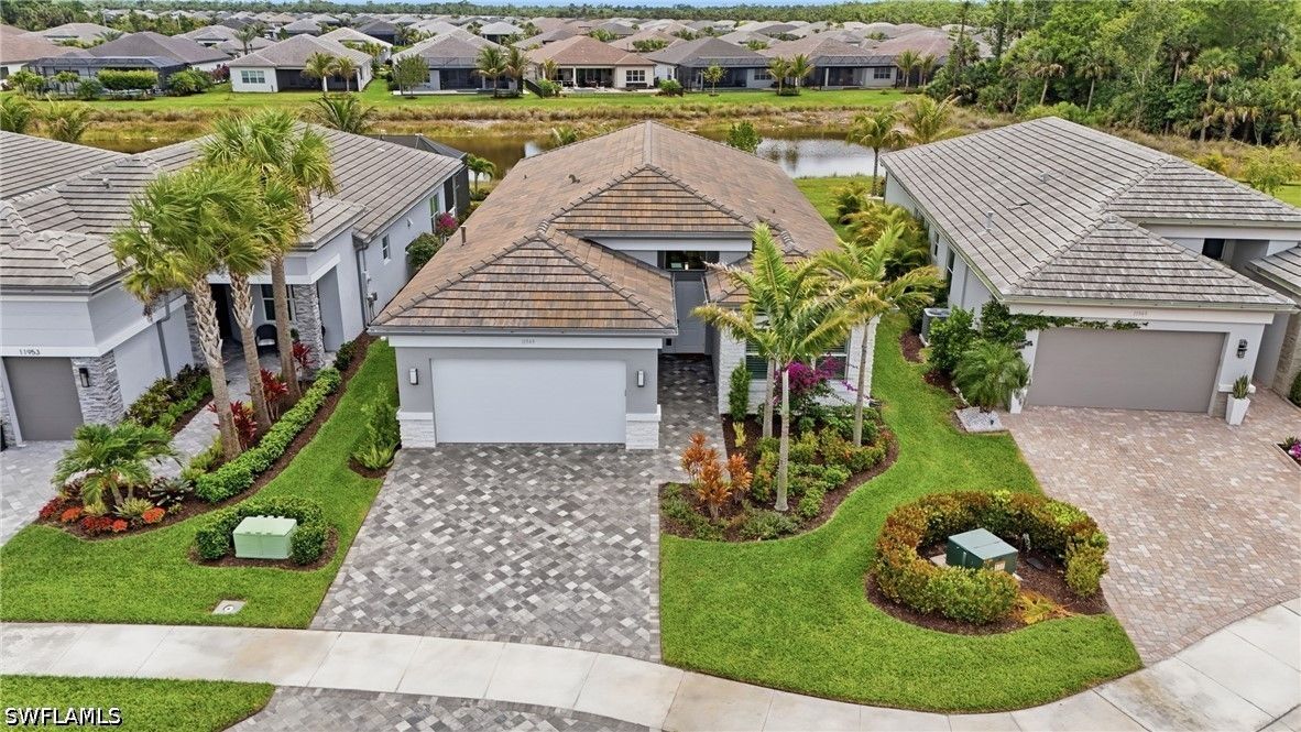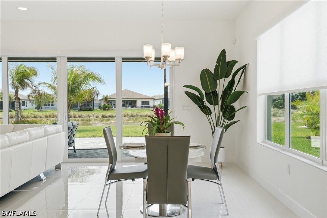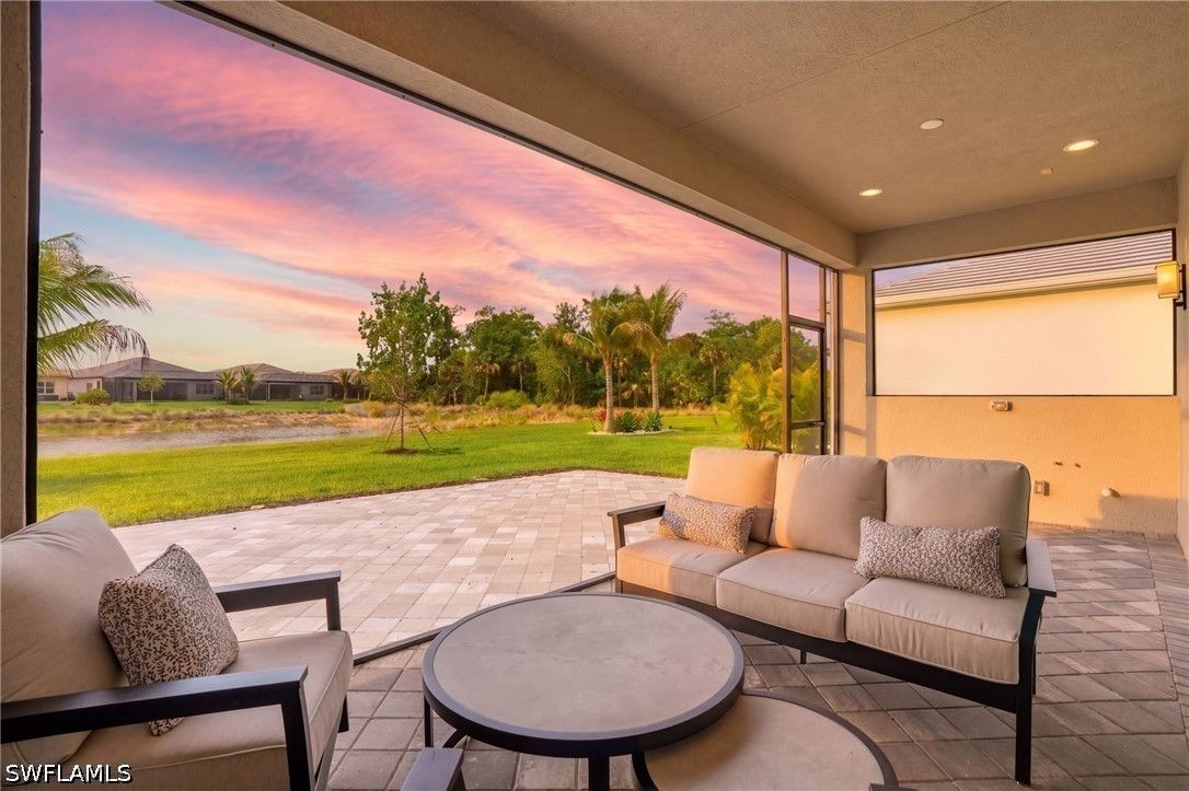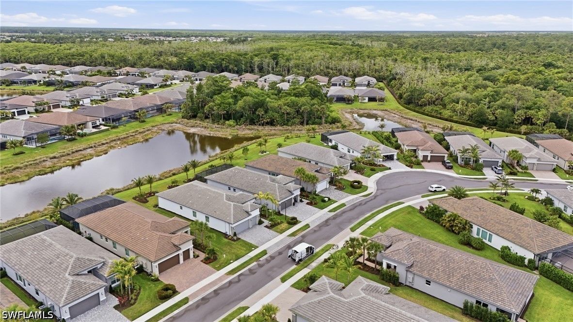 This stunning Pearl model home with extended square footage offers an unparalleled blend of luxury and comfort in the highly sought-after Valencia Trails, Naples' premier 55+ community. From the moment you step inside, the soaring 14-foot ceilings and shiplap create an immediate sense of sophistication. The open-concept design seamlessly connects the kitchen and living areas, making it ideal for both everyday living and elegant entertaining. The chef's kitchen is a true showpiece, featuring quartz countertops and backsplash, a natural gas stovetop, premium stainless steel appliances, and an upgraded pantry. Level 3 wood cabinetry with soft-close functionality and elegant molding adds a touch of refinement, while ample recessed lighting enhances the space. Step outside to your private screened lanai, extended patio and take in the breathtaking lake views that set this home apart. Whether you're enjoying a quiet morning coffee or hosting guests for an evening gathering, this tranquil retreat offers a seamless blend of indoor and outdoor living. With ample yard space to accommodate a custom pool, a lanai pre-plumbed for an outdoor kitchen, this home is designed for relaxation and entertaining at its finest. Large Format Porcelainfrom Spain, not a builder product, throughout makes a seamless flow. Beyond your doorstep, a three-minute walk takes you to all that Valencia Trails offers —world-class amenities that enhance an active, social lifestyle. The impressive 43,000-square-foot clubhouse features a full-service restaurant and bar, a state-of-the-art fitness center, a full-service salon and spa, and multiple recreational spaces, including card rooms, an art studio, and a learning kitchen. For those who love outdoor activities, the community boasts a resort-style pool, a lap pool, a resistance pool, six tennis courts, eight pickleball courts, and scenic walking and biking trails. Even your four-legged companions will feel at home with two dedicated dog parks just a short walk from the home. This is more than just a home—it's an opportunity to embrace a luxurious, resort-style lifestyle in one of Naples' most exclusive communities. Homes like this are rare, and demand for Valencia Trails continues to grow. Don't miss your chance to own a piece of paradise. Call today to schedule your private tour and experience the elegance, comfort, and breathtaking lake views for yourself."