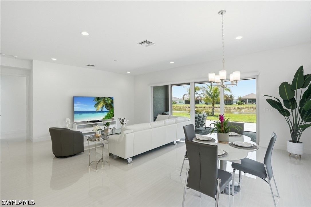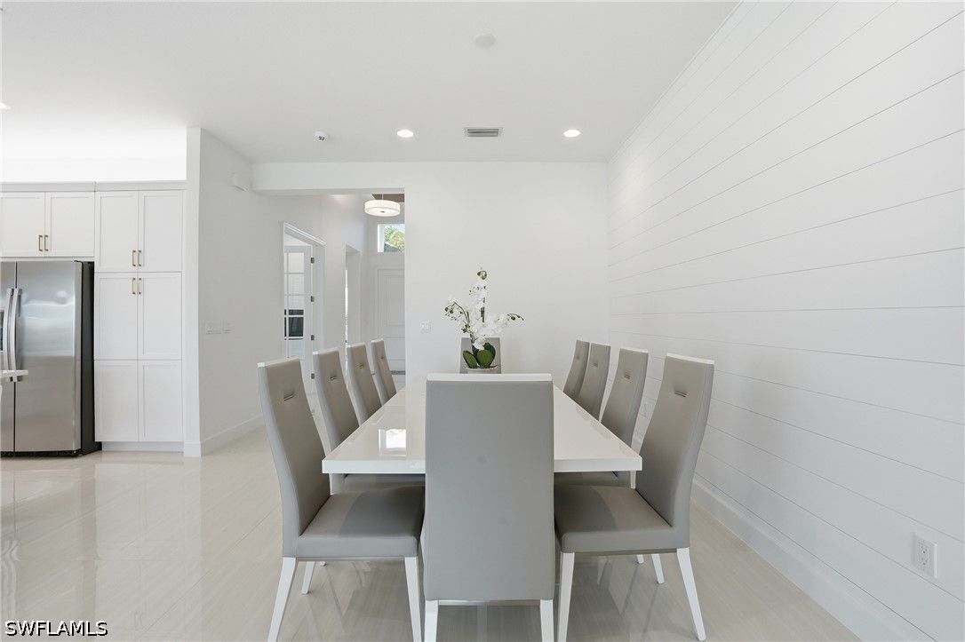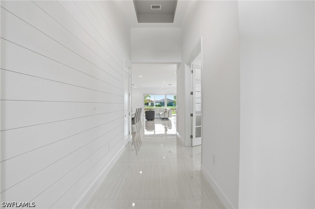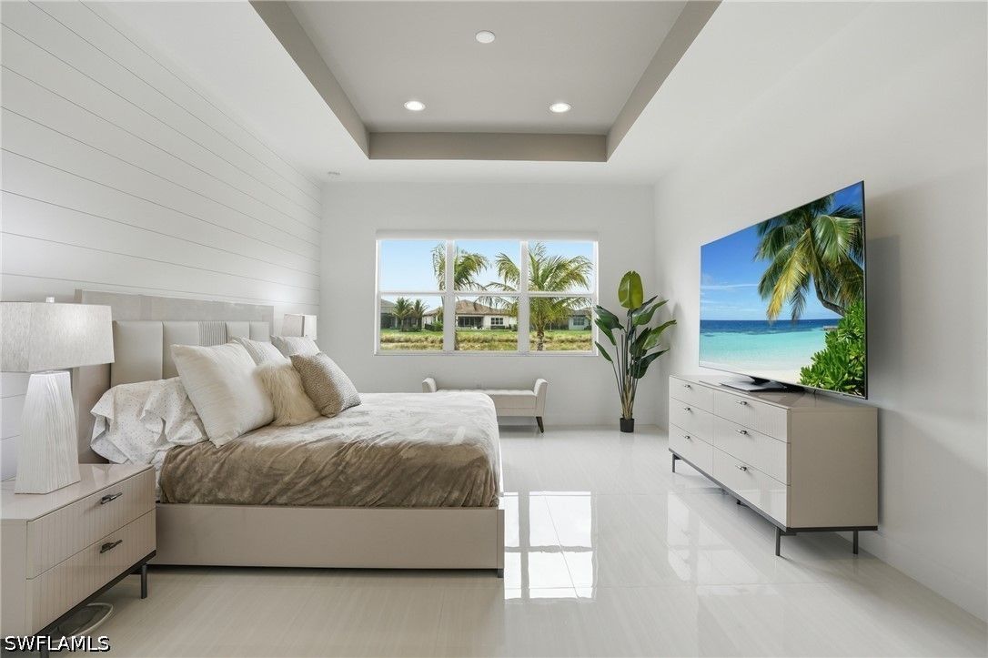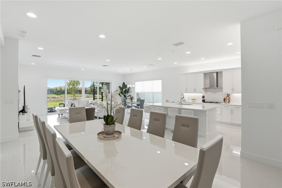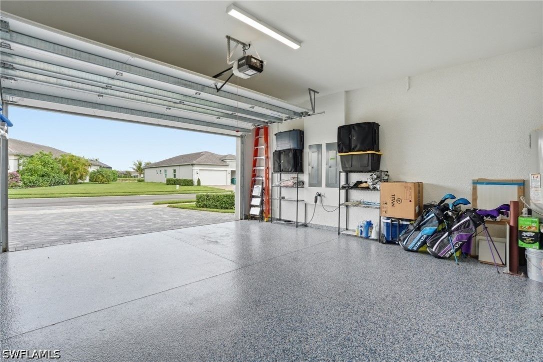 This stunning Pearl model home with extended square footage offers an unparalleled blend of luxury and comfort in the highly sought-after Valencia Trails, Naples' premier 55+ community. From the moment you step inside, the soaring 14-foot ceilings and shiplap create an immediate sense of sophistication. The open-concept design seamlessly connects the kitchen and living areas, making it ideal for both everyday living and elegant entertaining. The chef's kitchen is a true showpiece, featuring quartz countertops and backsplash, a natural gas stovetop, premium stainless steel appliances, and an upgraded pantry. Level 3 wood cabinetry with soft-close functionality and elegant molding adds a touch of refinement, while ample recessed lighting enhances the space. Step outside to your private screened lanai, extended patio and take in the breathtaking lake views that set this home apart. Whether you're enjoying a quiet morning coffee or hosting guests for an evening gathering, this tranquil retreat offers a seamless blend of indoor and outdoor living. With ample yard space to accommodate a custom pool, a lanai pre-plumbed for an outdoor kitchen, this home is designed for relaxation and entertaining at its finest. Large Format Porcelainfrom Spain, not a builder product, throughout makes a seamless flow. Beyond your doorstep, a three-minute walk takes you to all that Valencia Trails offers —world-class amenities that enhance an active, social lifestyle. The impressive 43,000-square-foot clubhouse features a full-service restaurant and bar, a state-of-the-art fitness center, a full-service salon and spa, and multiple recreational spaces, including card rooms, an art studio, and a learning kitchen. For those who love outdoor activities, the community boasts a resort-style pool, a lap pool, a resistance pool, six tennis courts, eight pickleball courts, and scenic walking and biking trails. Even your four-legged companions will feel at home with two dedicated dog parks just a short walk from the home. This is more than just a home—it's an opportunity to embrace a luxurious, resort-style lifestyle in one of Naples' most exclusive communities. Homes like this are rare, and demand for Valencia Trails continues to grow. Don't miss your chance to own a piece of paradise. Call today to schedule your private tour and experience the elegance, comfort, and breathtaking lake views for yourself."
